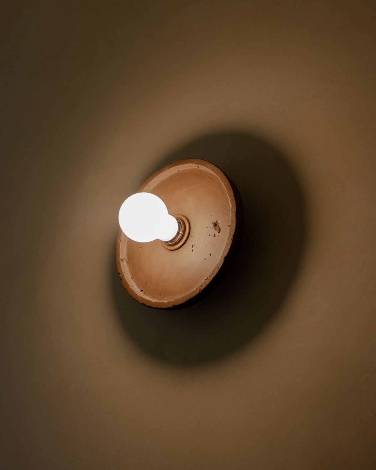 Terracotto wall-mounted light fixture with a white bulb on a gray background