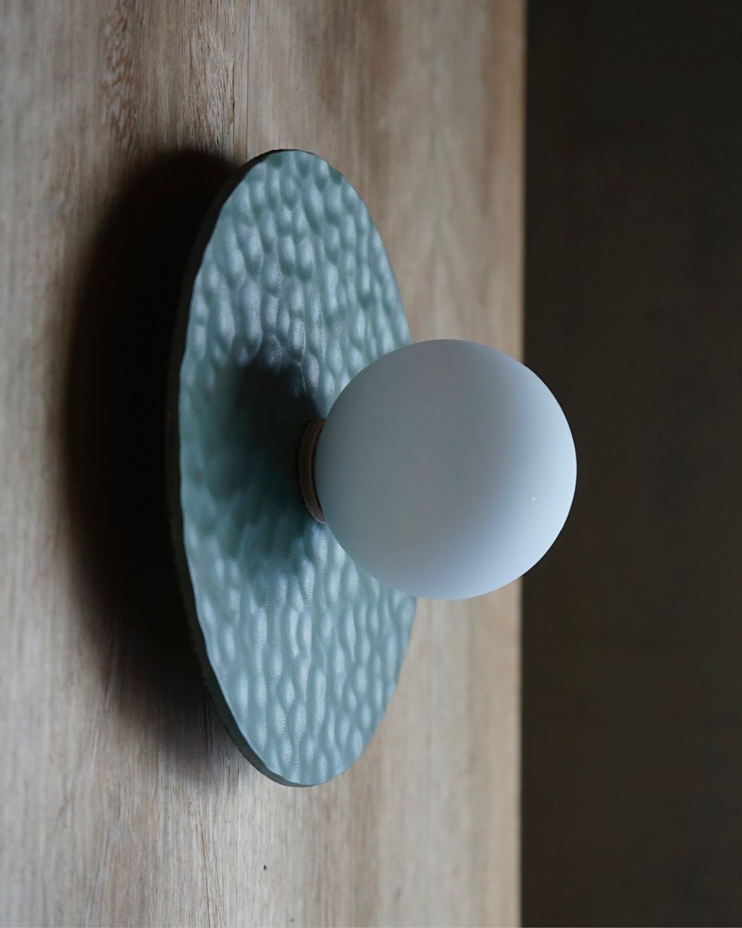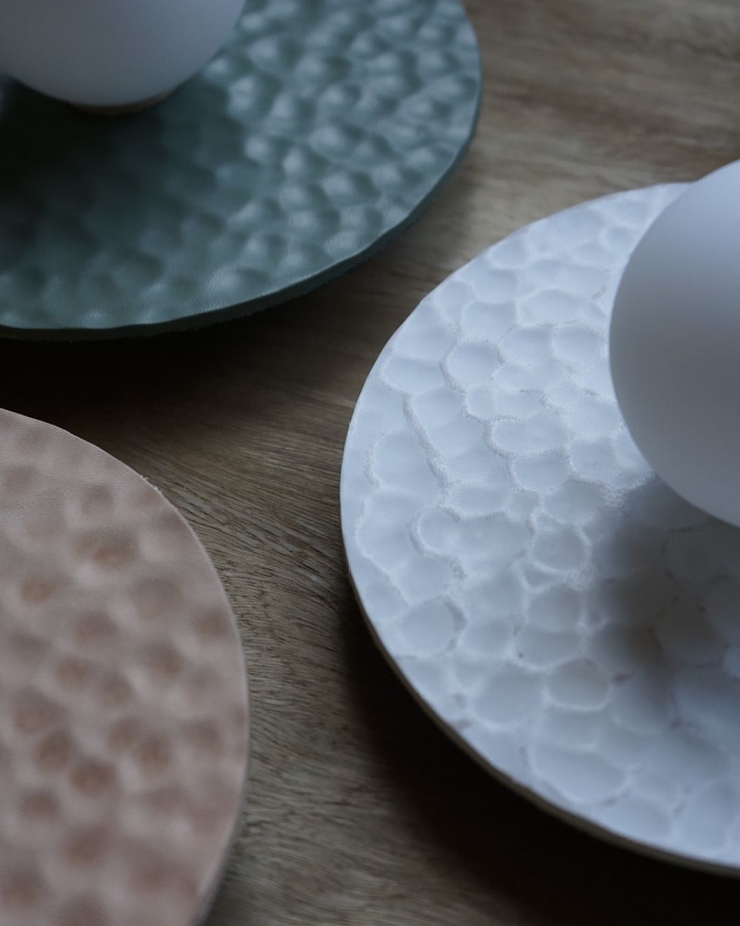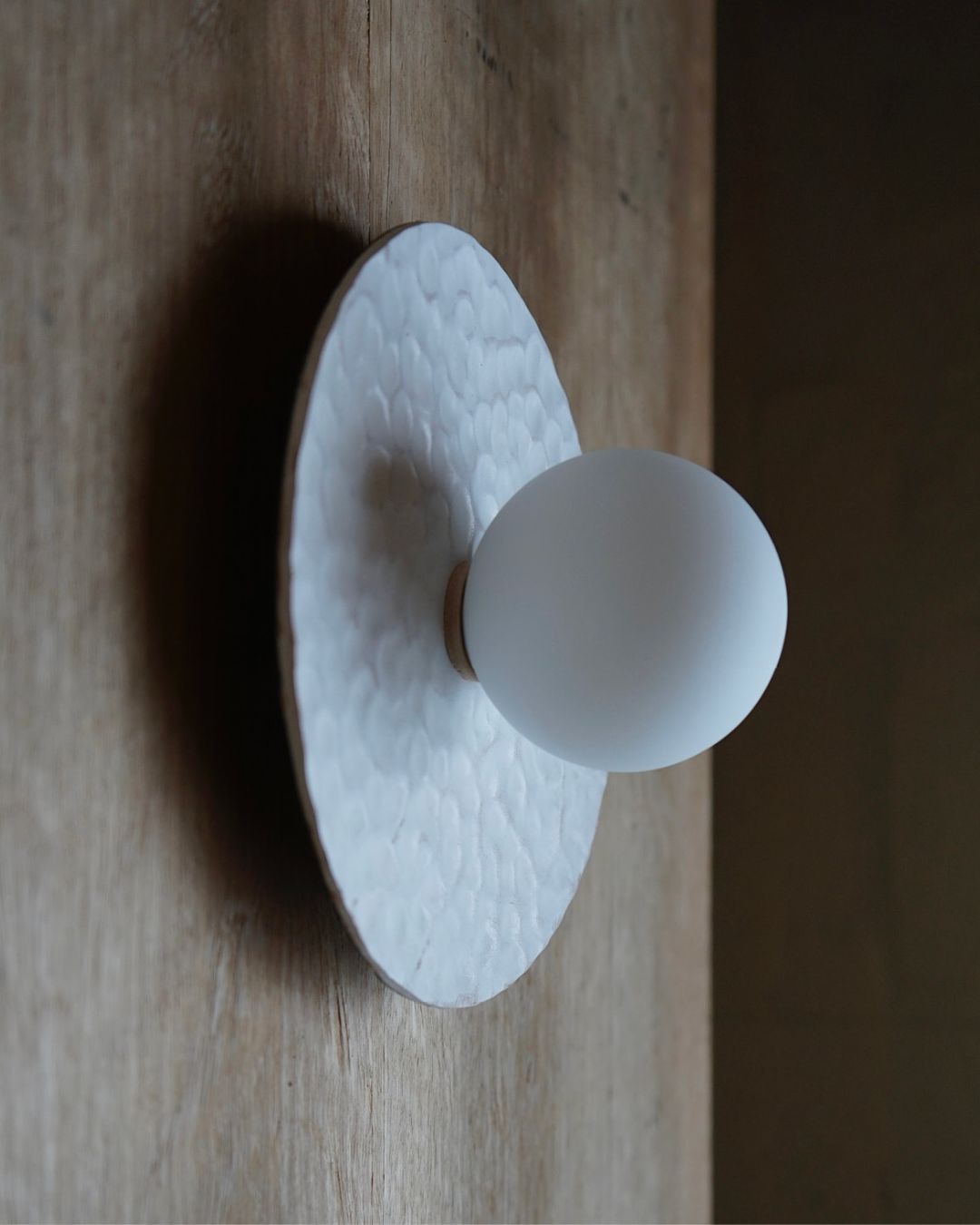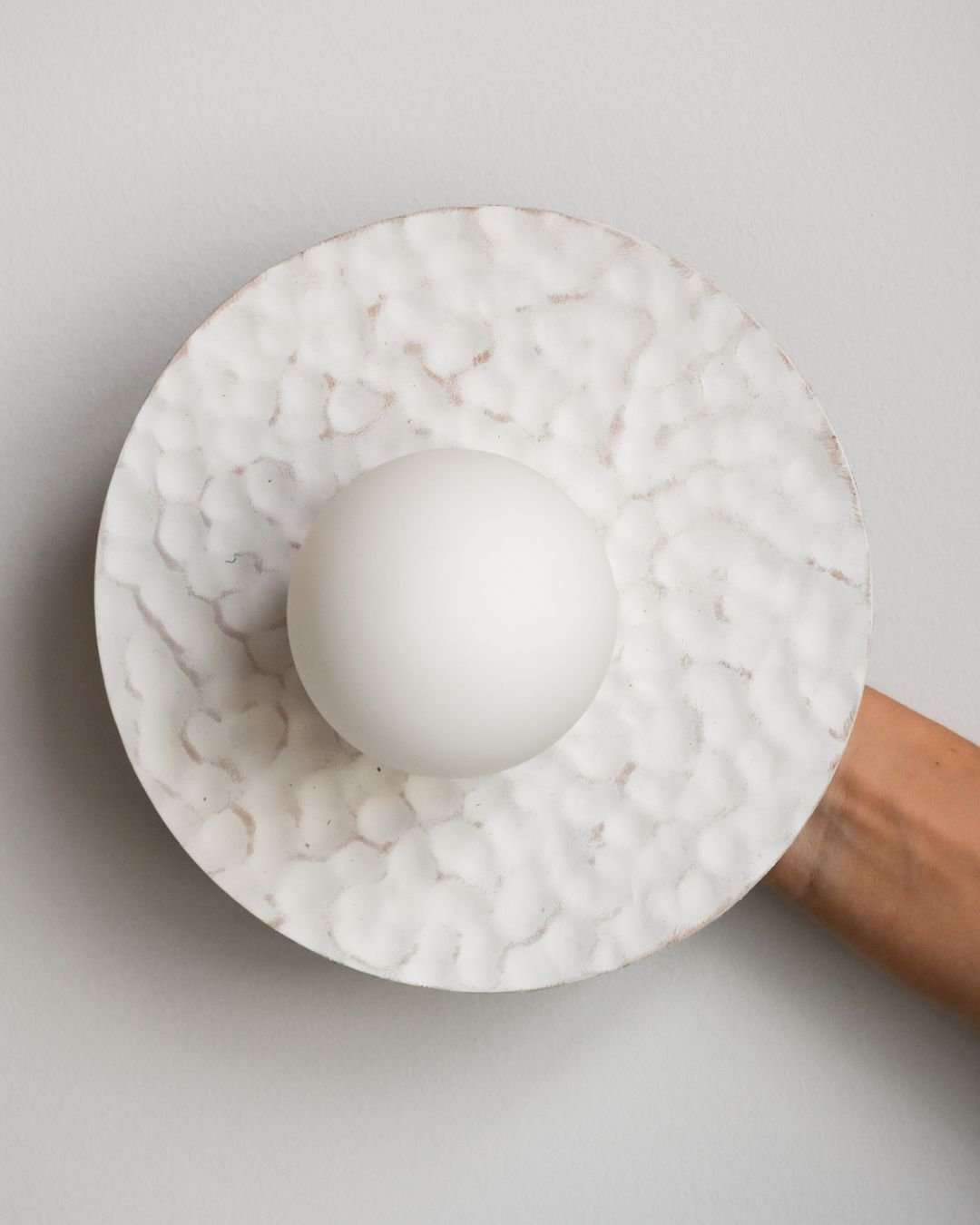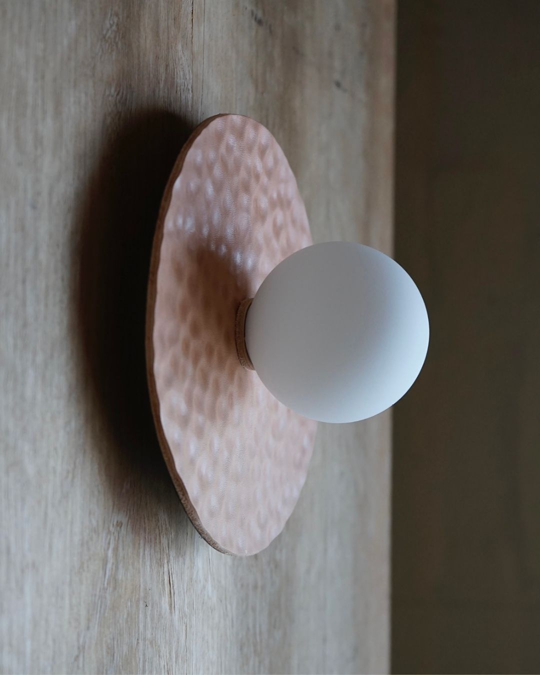 Handmade in Melbourne from locally sourced materials, this leather Disc Wall Sconce is a testament to meticulous craftsmanship and considered design. The Hammered Sconce's form offers a minimalistic yet organic textural shade to suit interior spaces. Available in four versatile finishes and textures to suit an array of designs - Natural, White and Pale Eucalypt.