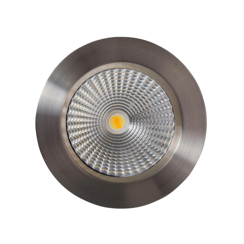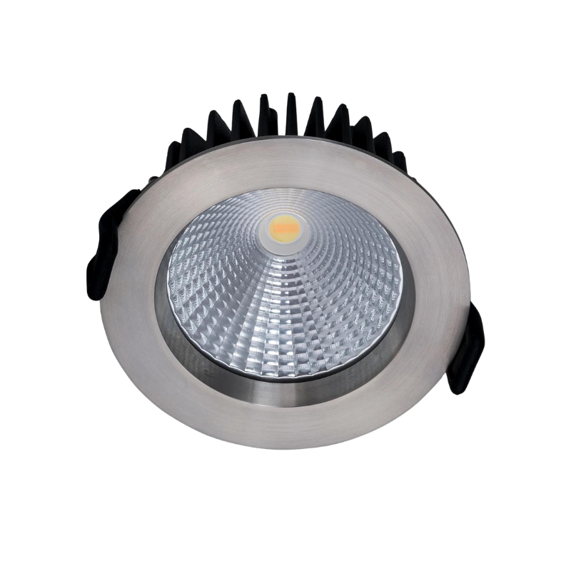 This fixed dimmable LED downlight is modern and compact. With its 316 marine grade stainless steel face and IP54 rating, it is made for durability. The light is supplied with a dimmable LED driver complete with flex and plug. It features an integrated 13 watt LED, which produces up to 1100 lumens of brightness with a 60° beam angle. This light comes with a 3-year replacement warranty.