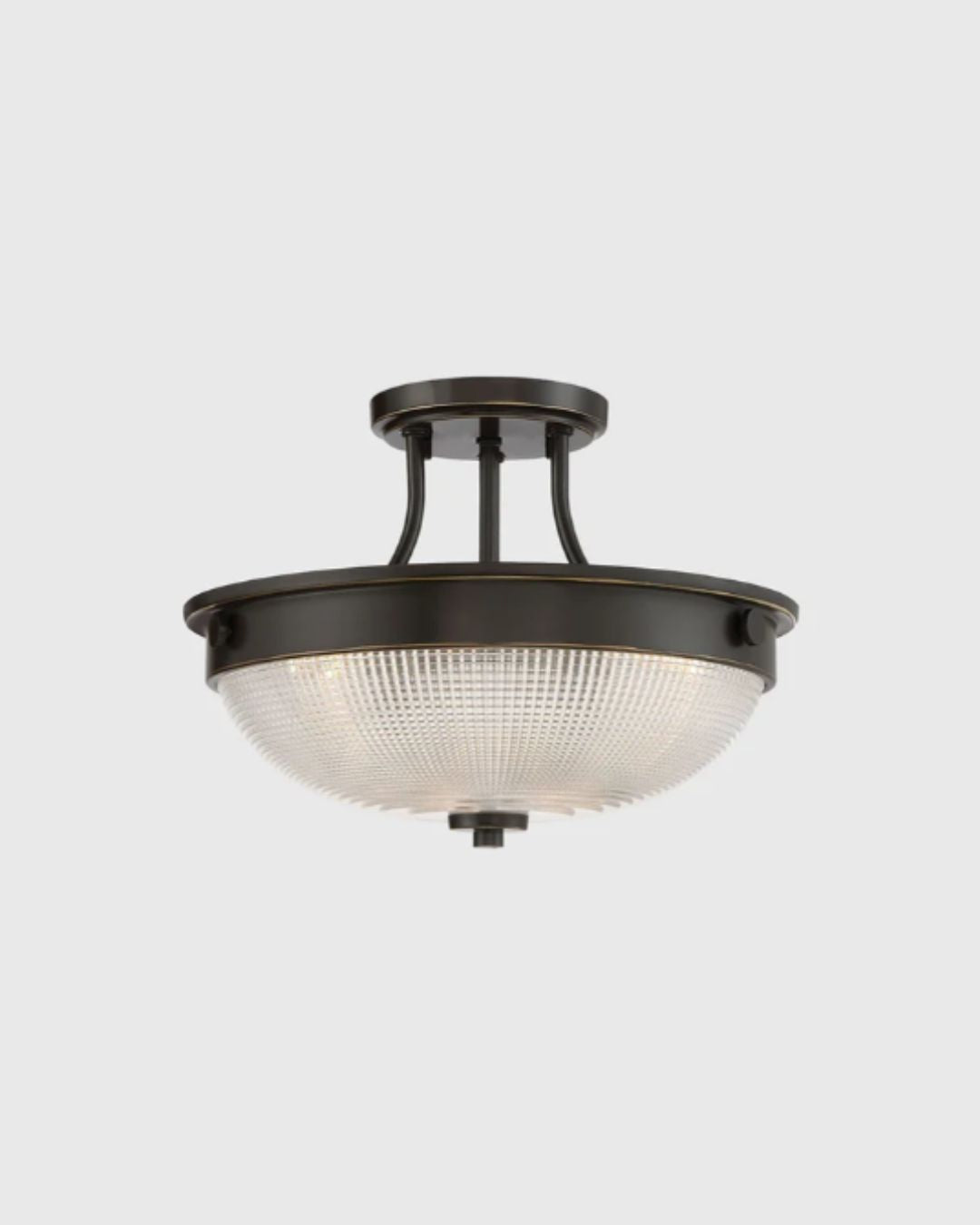 This ceiling light has a beautiful prismatic glass dome shade set into a classic semi-flush ceiling fixture and is available in Polished Nickel, Bronze or a Brass finish. An elegant addition to any room and space.