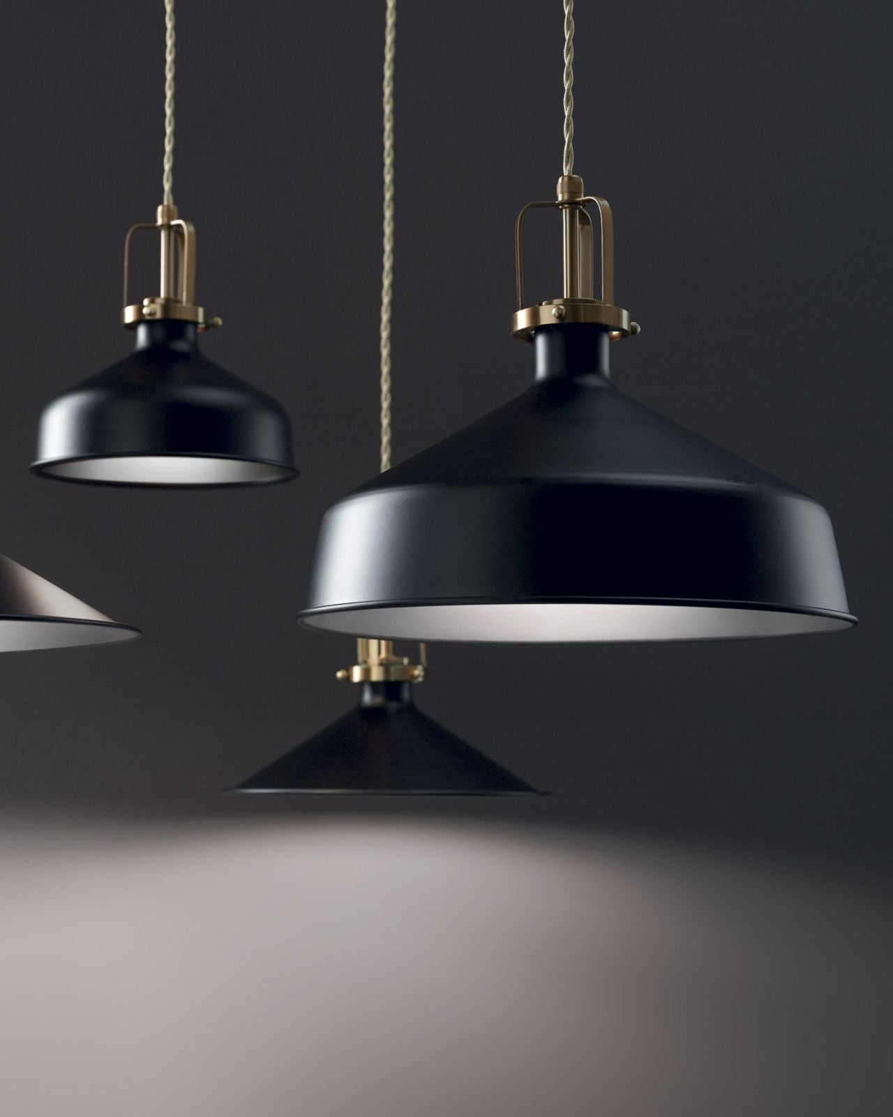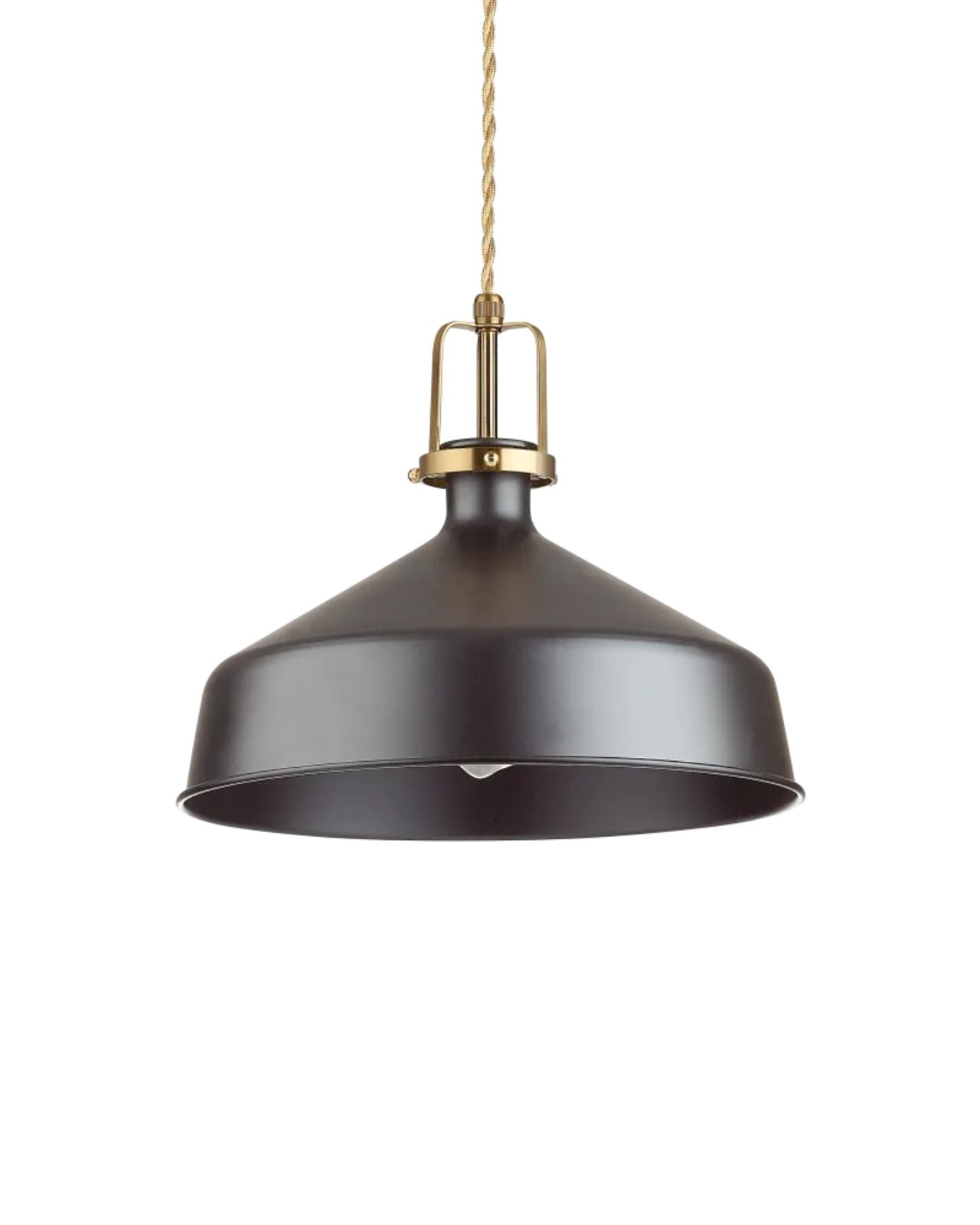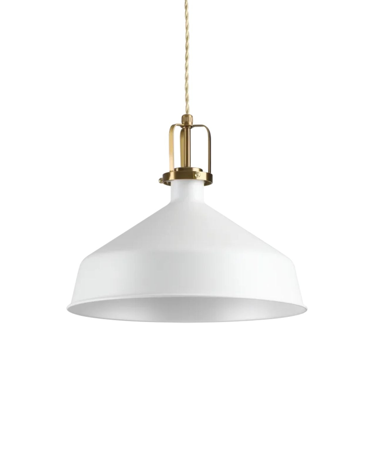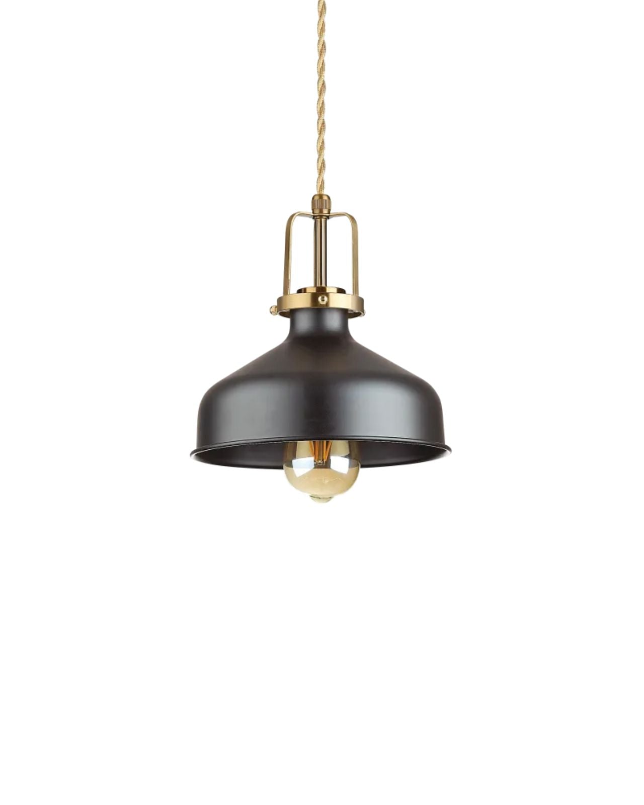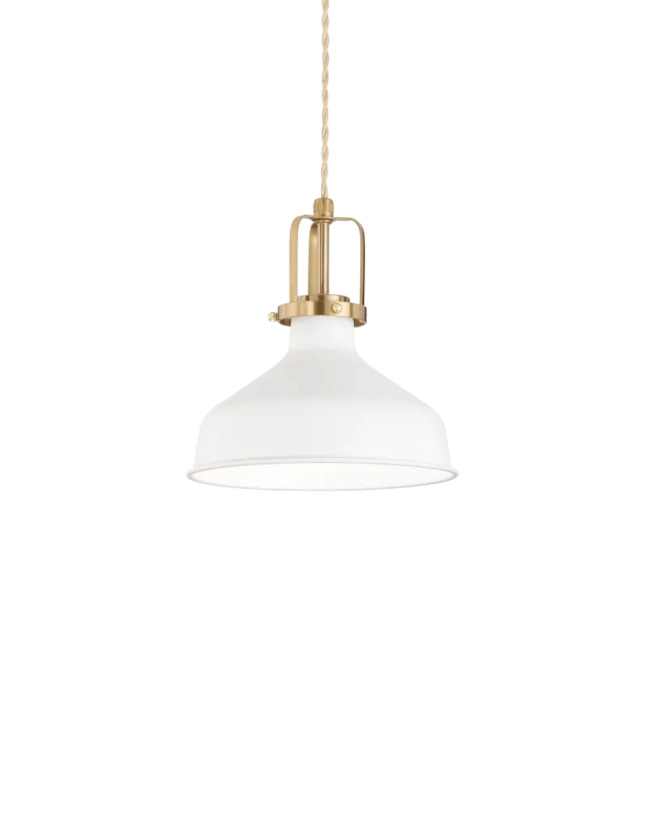 The Minimal Dome Pendant is a modern fixture with a refined, contemporary design. It features a smooth, white or black metal shade with a slightly flared edge, and is suspended by a twisted fabric cord in a warm beige tone, which adds a subtle vintage touch. The top portion of the lamp includes a satin gold metal detail that adds an element of elegance and contrast to the overall design. Ideal for kitchens, dining areas, or workspaces, this pendant light blends modern farmhouse with transitional sophistication.