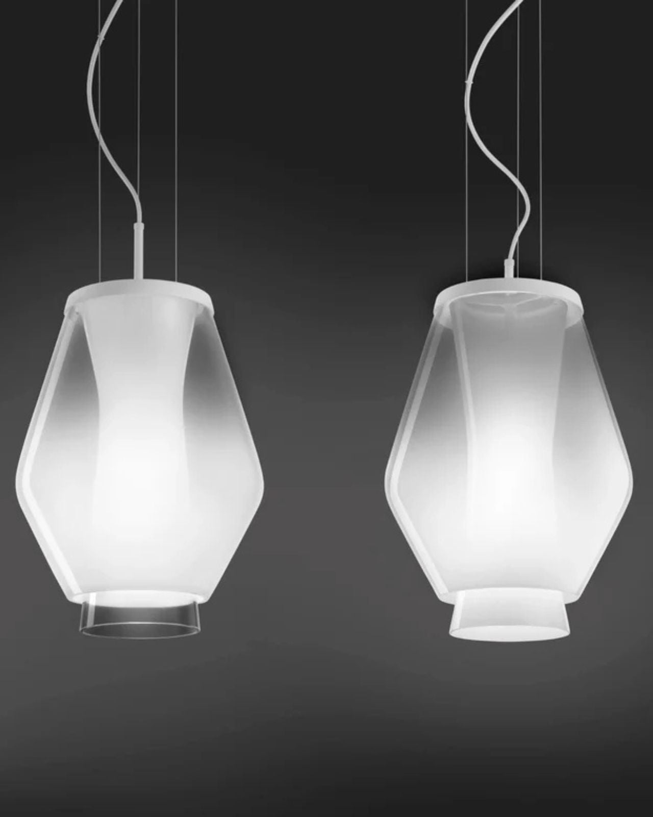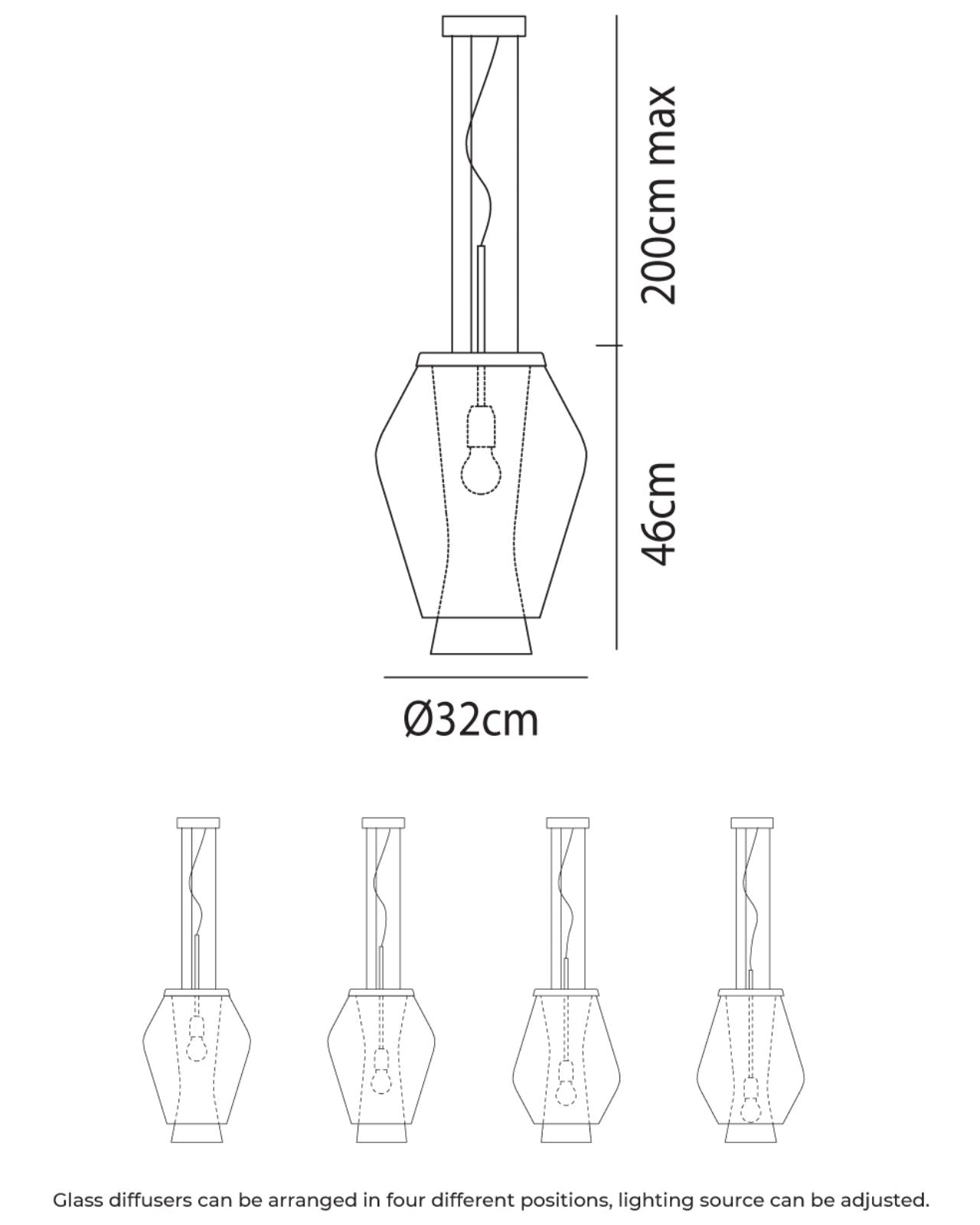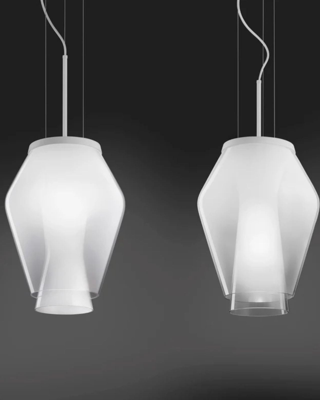 The Adjustable Silhouette Glass Pendant is a modern geometric fixture, taking inspiration from traditional lantern designs. Its unique design allows for hidden assembly and effortless glass installation without the need for drilling. Featuring two white crystal diffusers, this pendant offers four different assembly choices that produce distinctive overlaps and silhouettes by manipulating internal lighting and utilizing glass transparency. Crafted in Italy.