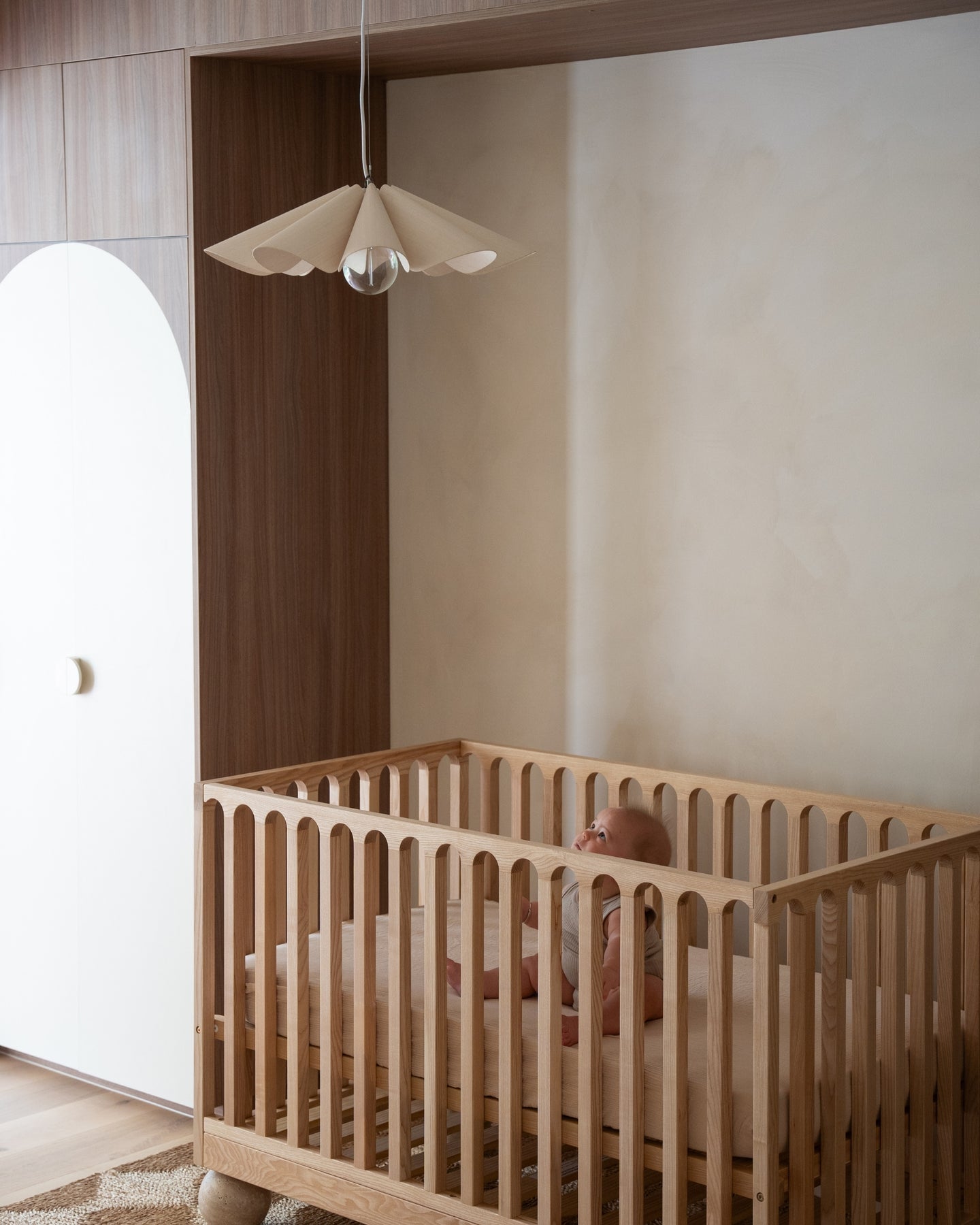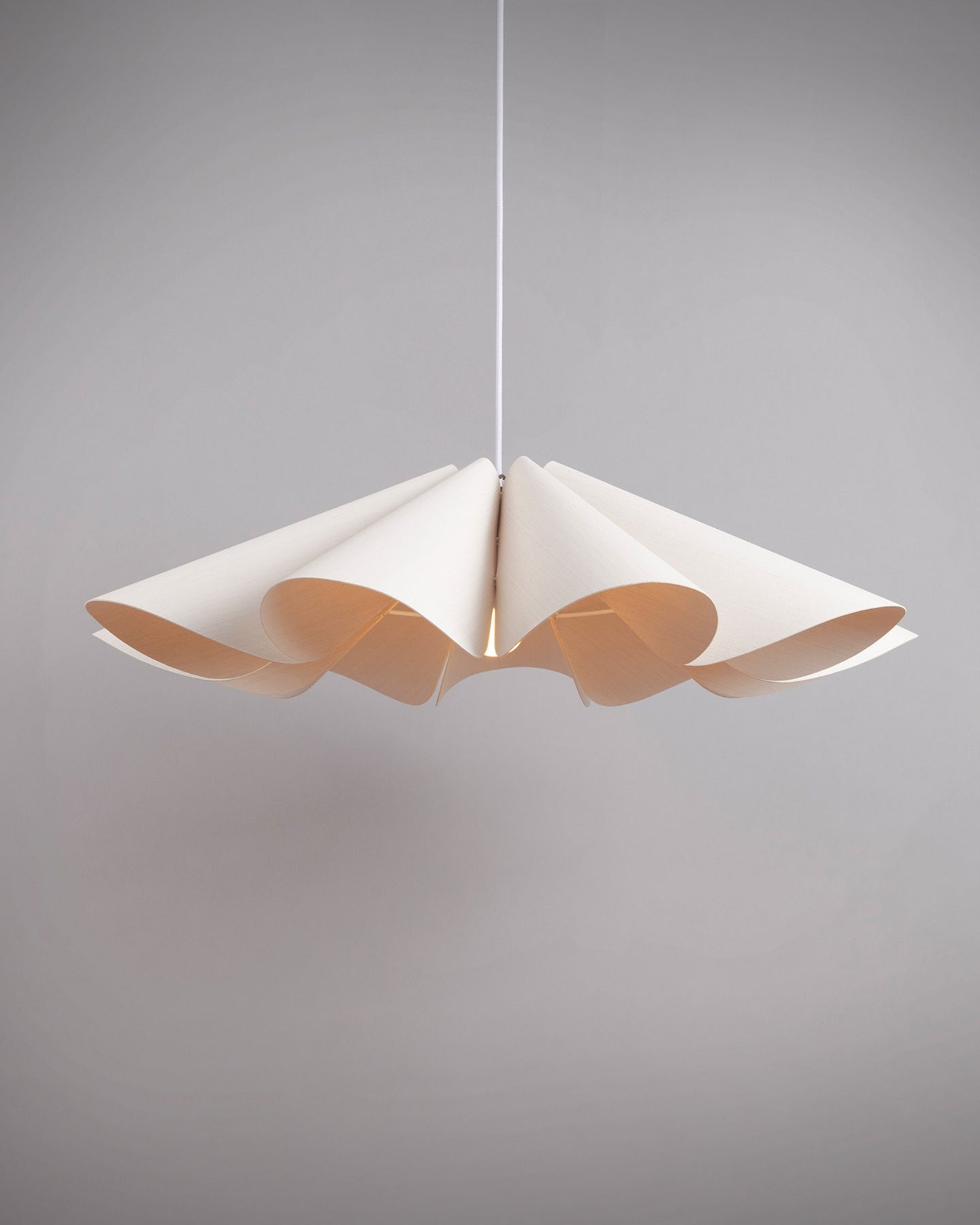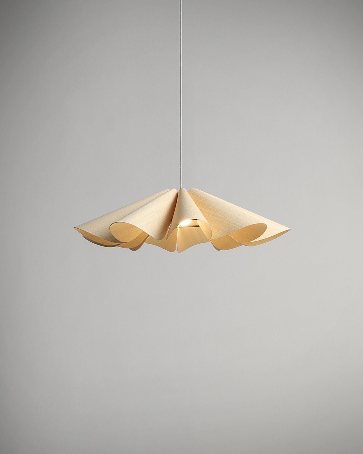Crafted from reconstituted wood Veneer this pendant showcases an artistic design that will enhance a range of styled interiors. The shade's folded form is reminiscent of a flower and is available in assorted colours and sizes to match any space. Casting downwards-facing illumination this pendant is well-suited for creating ambient light in entranceways, over a dining room table and in living areas.