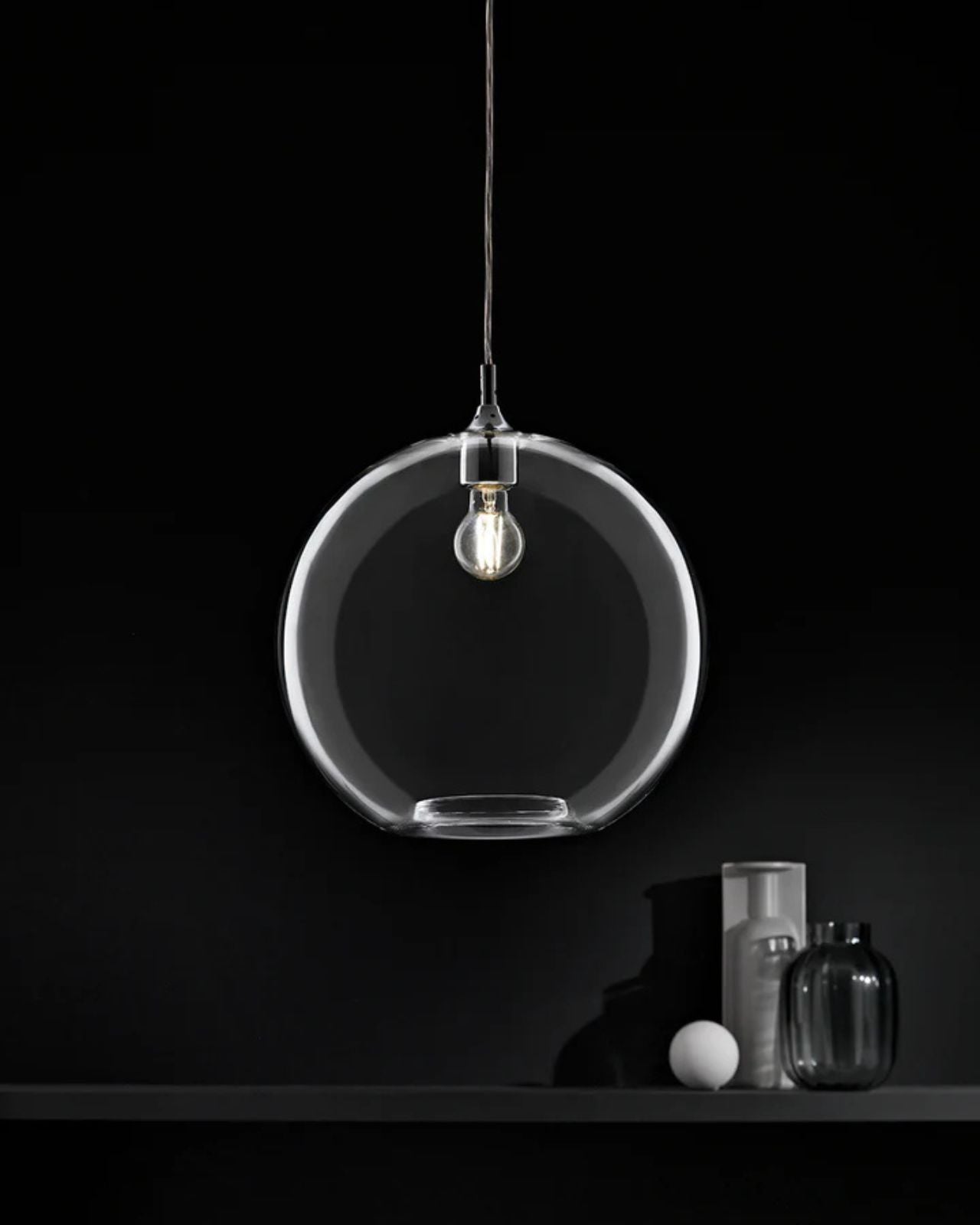 This pendant light, designed in Italy, is highly adaptable and adds charm to any type of home decor, be it traditional or modern. Its chrome framework and sleek glass construction create an elegant spherical shape, held up by an understated cord suspension.