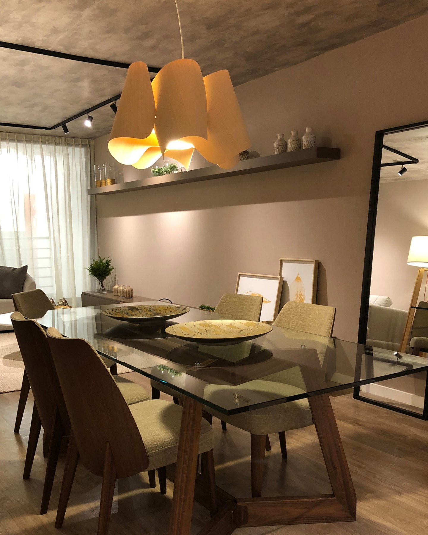 Dining room with a glass table and wooden chairs, featuring wooden pendant