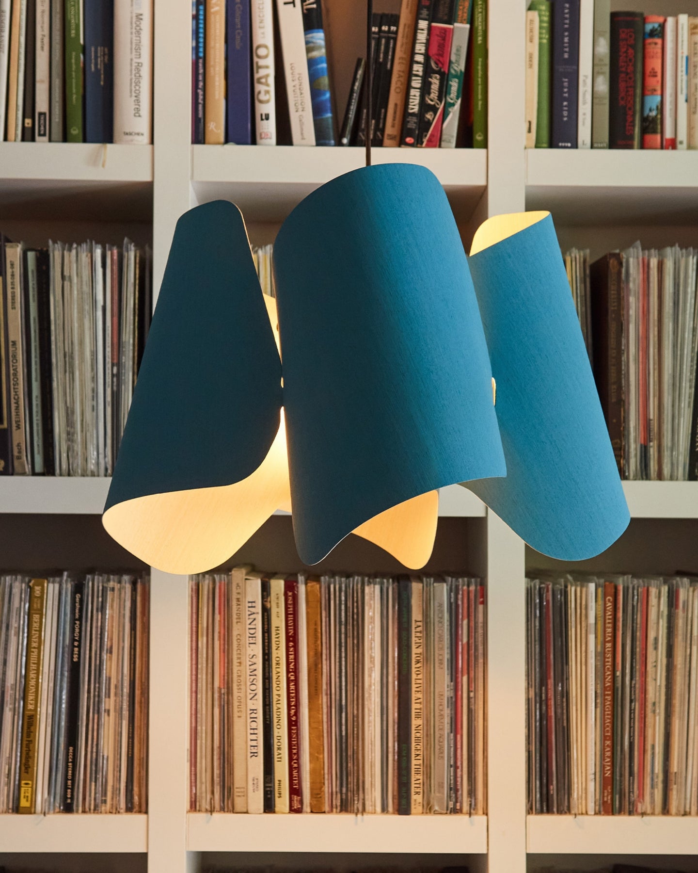 Blue pendant lamp in front of a bookshelf filled with books