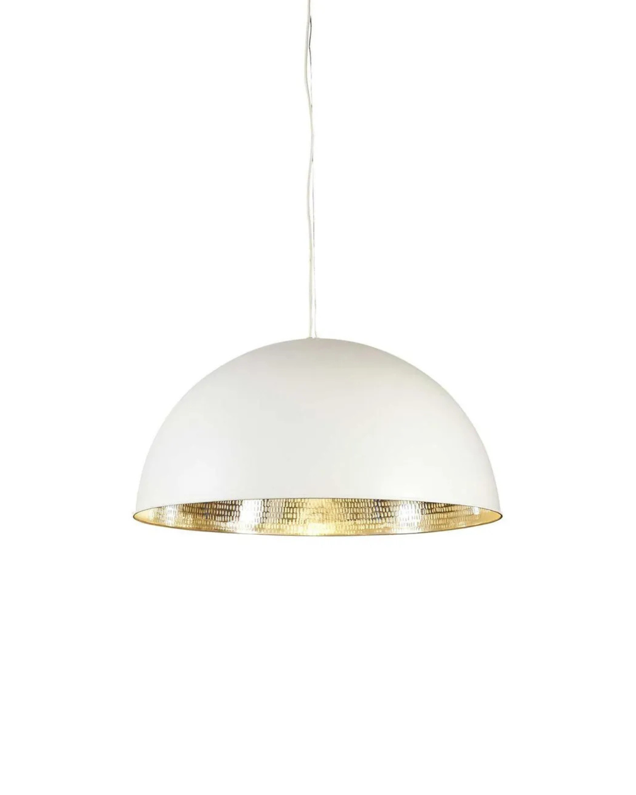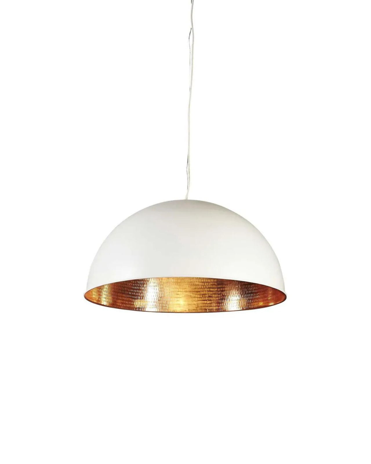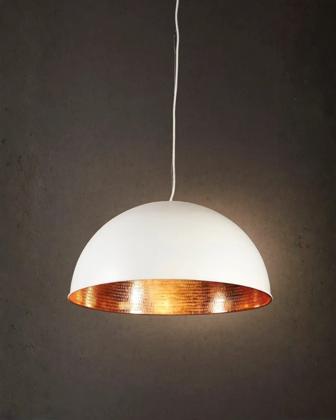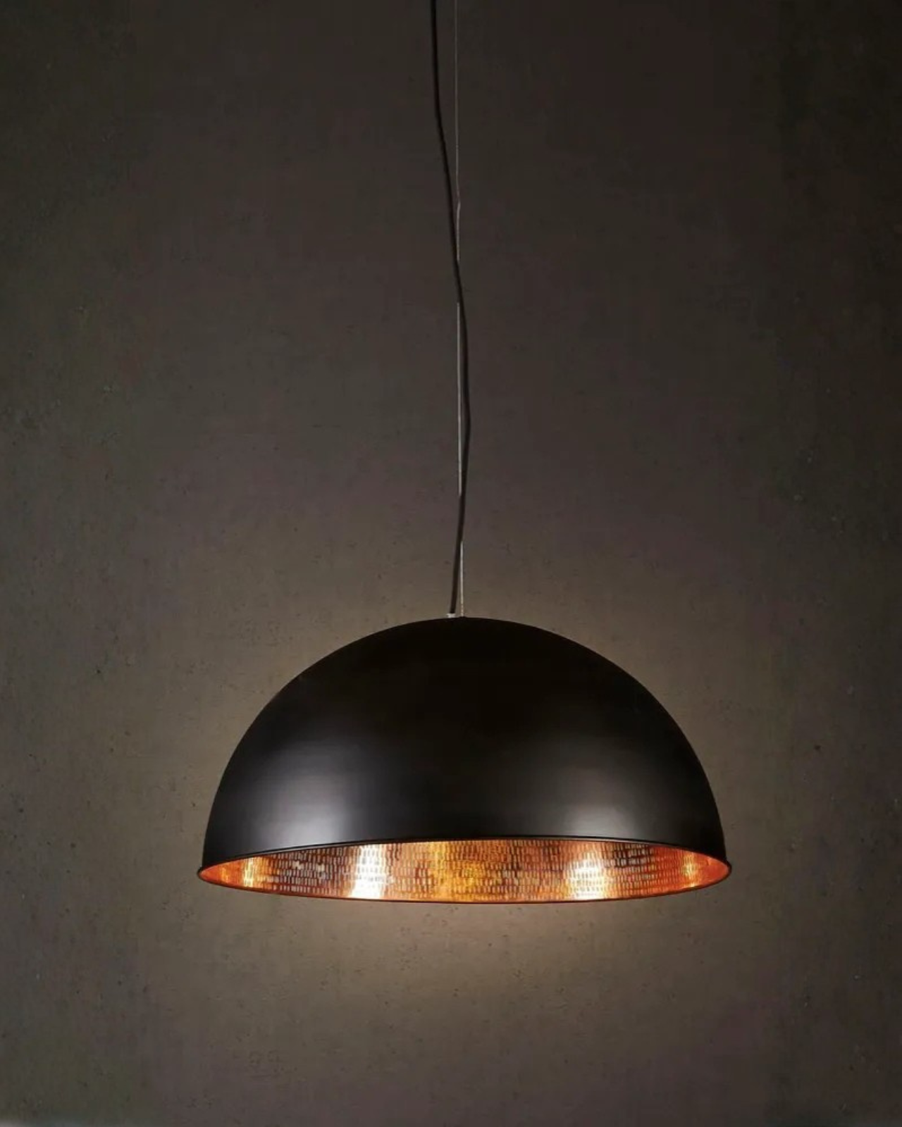 This pendant lamp features a striking dome-shaped design with a sophisticated black and copper finish. The inner dome is lined with hand-beaten metal, creating a distinctive texture that comes to life when illuminated. The warm glow accentuates the copper or silver tones, casting a captivating play of light and shadow. Perfect for living rooms, offices, or bedrooms, this pendant adds depth and contemporary character to interior spaces.