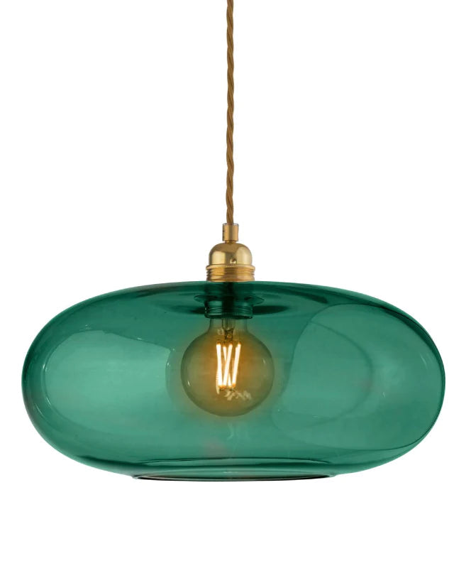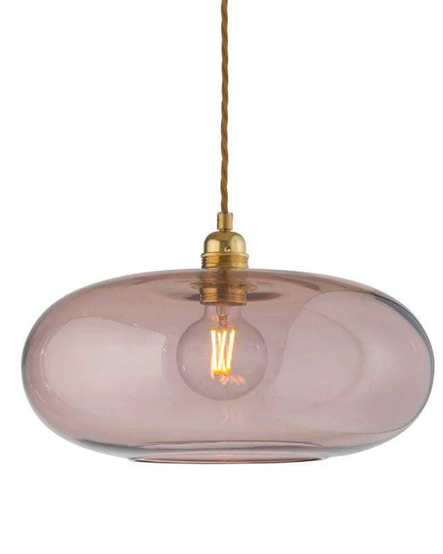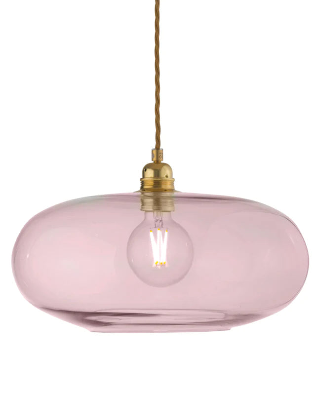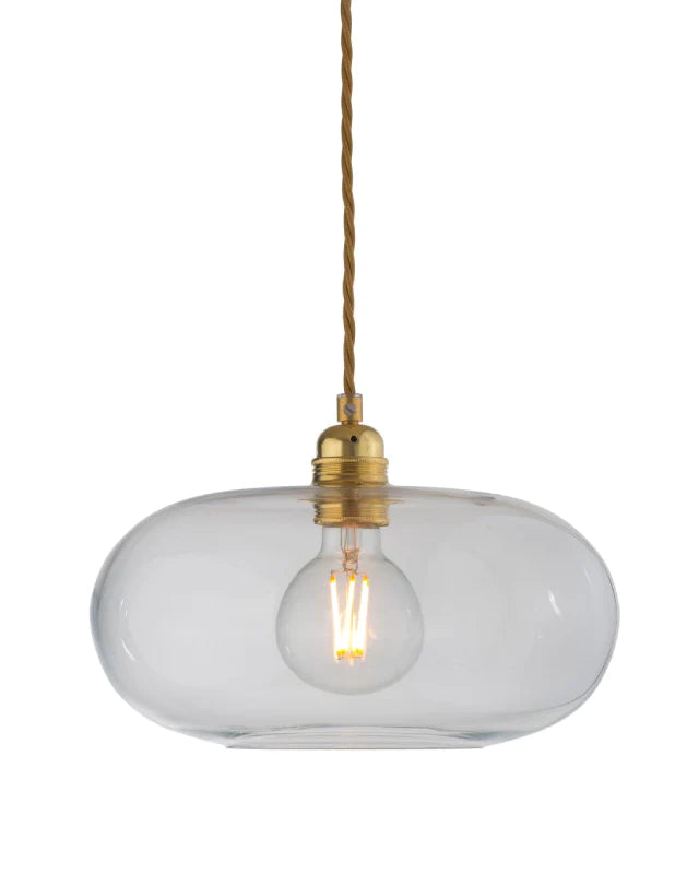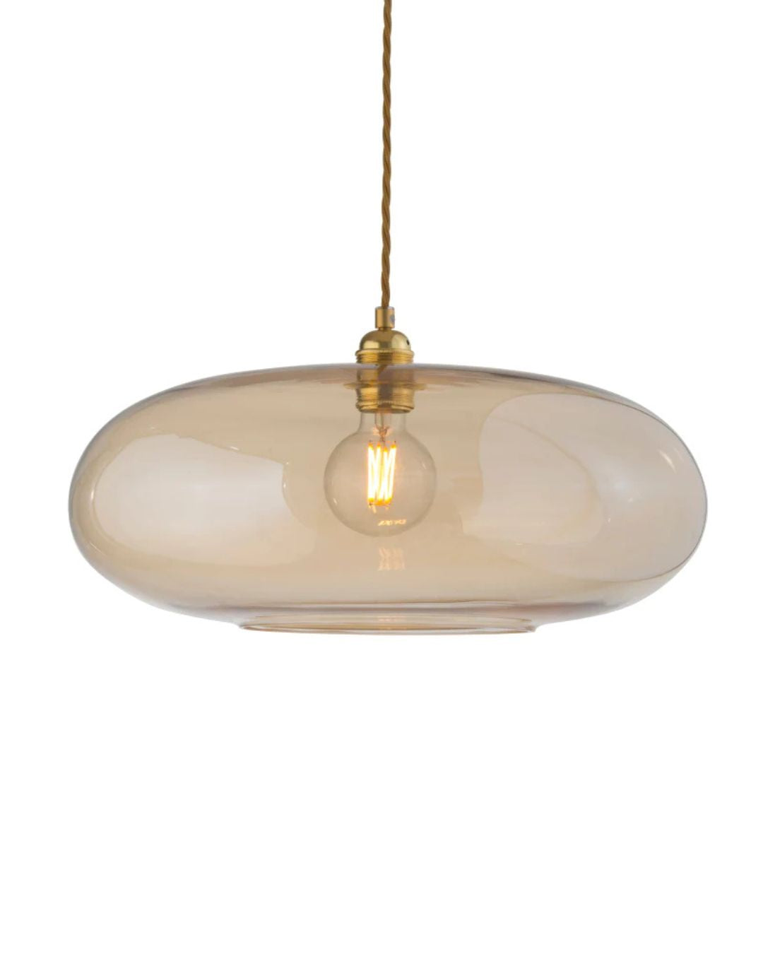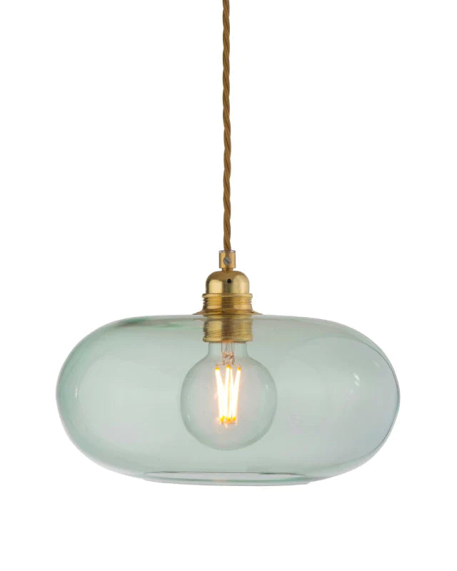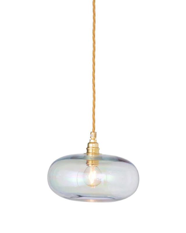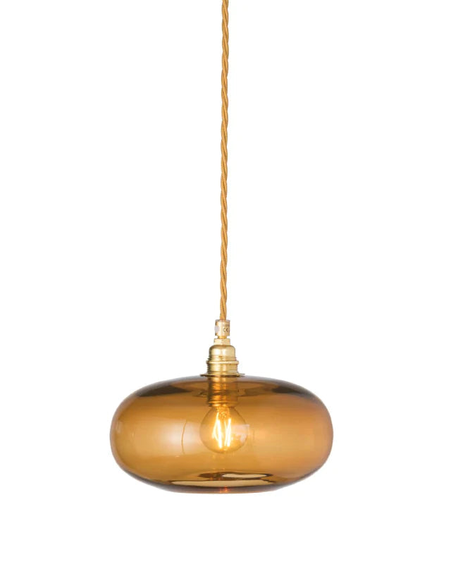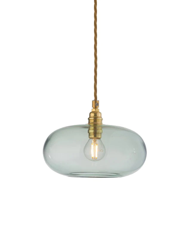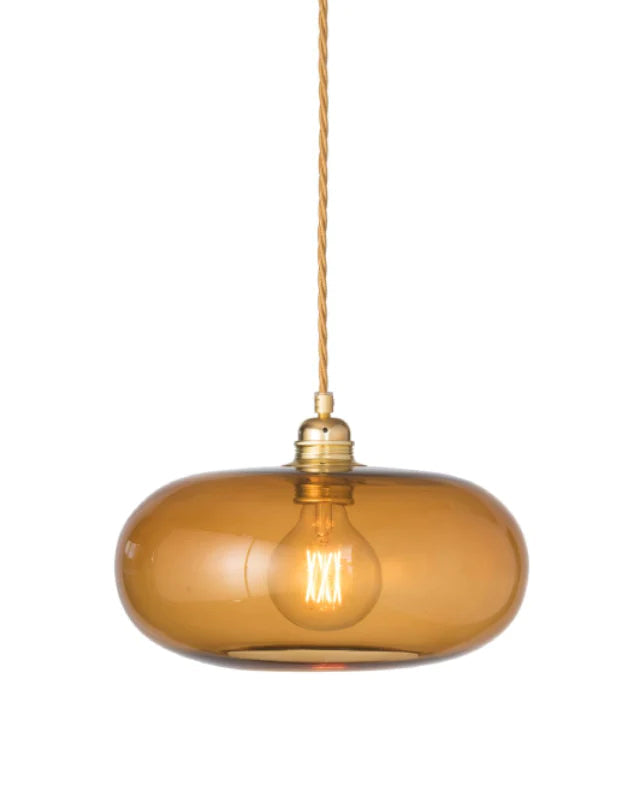This captivating pendant showcases a wide shape and shallow height. Designed and handmade in Denmark from mouth-blown glass this retro pendant is paired with gold detailing that will add a sophisticated ambience to any interior. Designed to be used as a single installation to create an interior focal point or installed as a cluster. To be paired with an E27 globe (not included). Available in an assortment of glass colours and sizes.