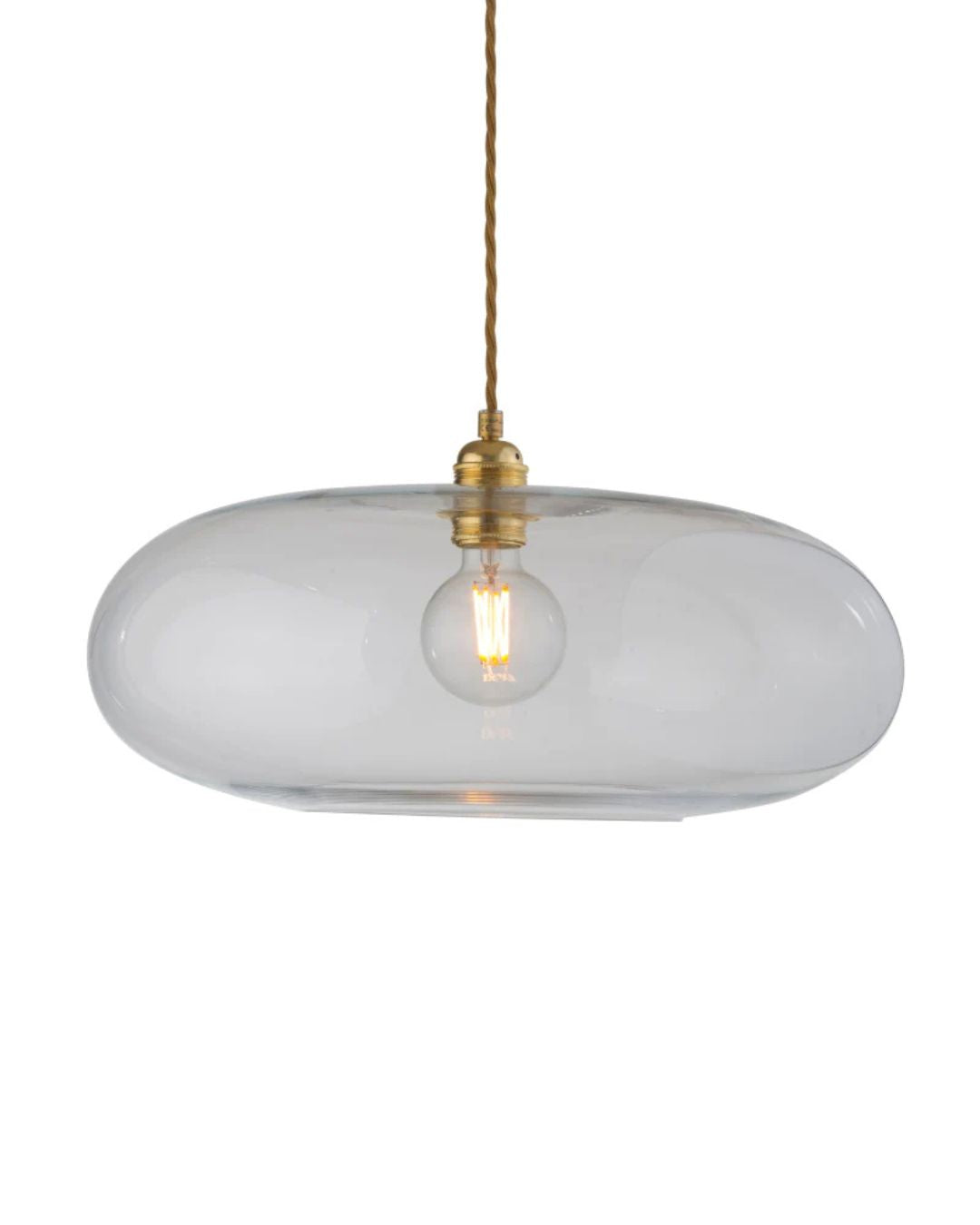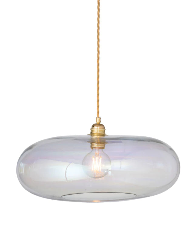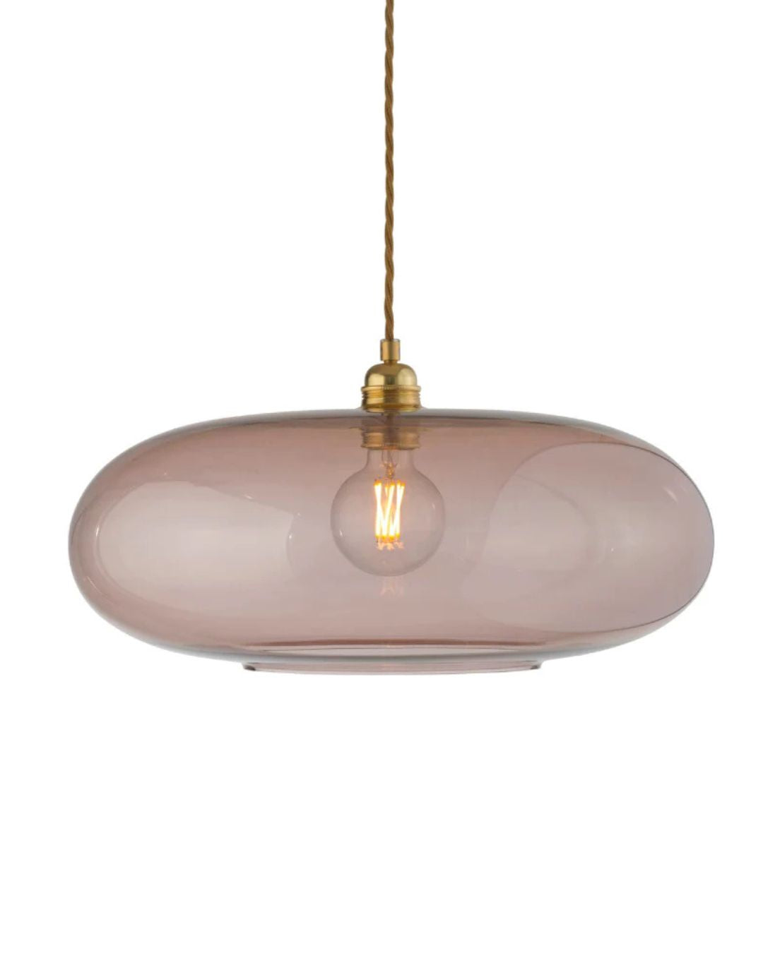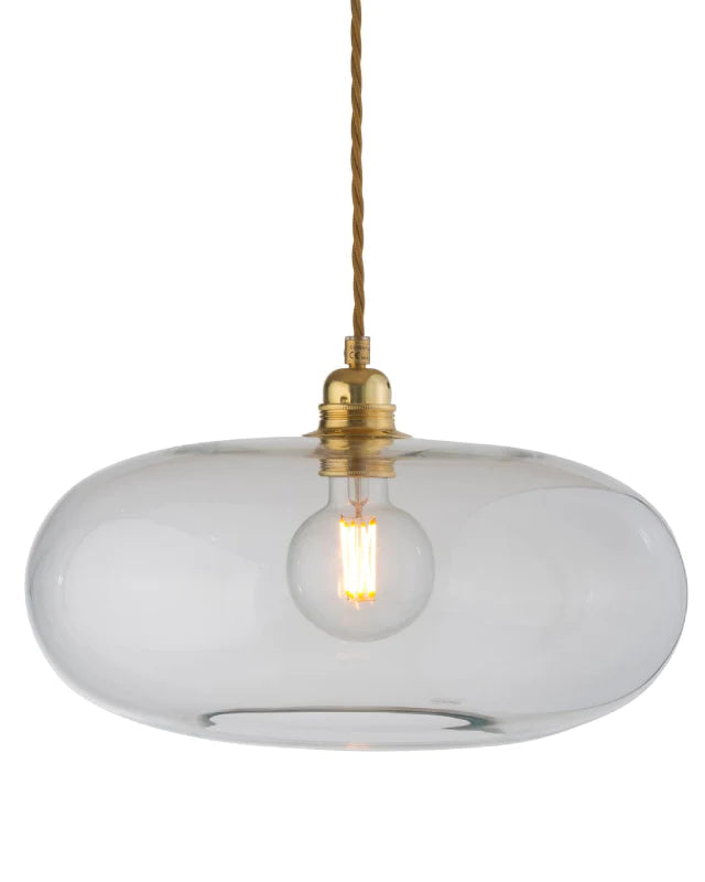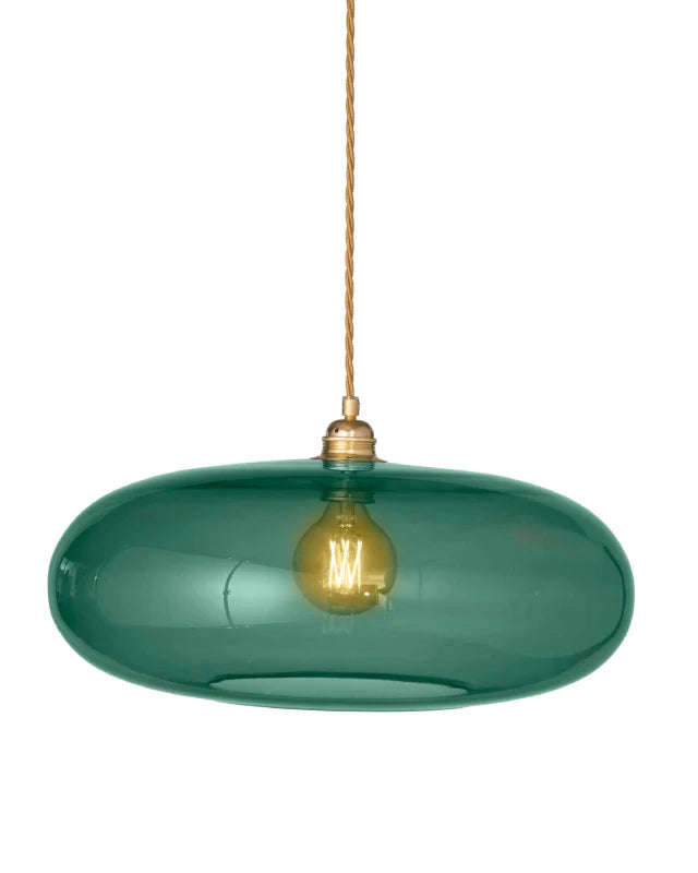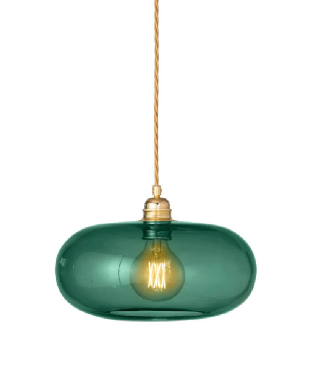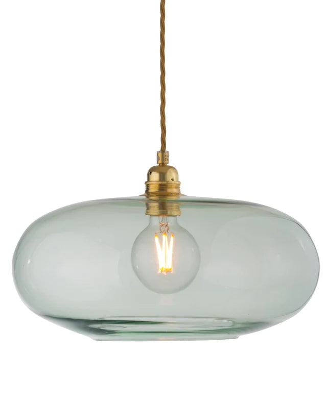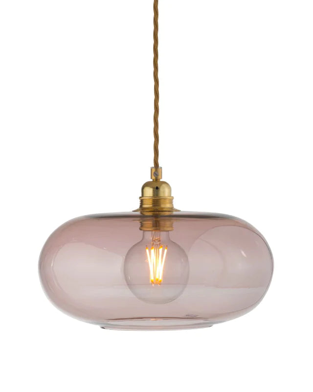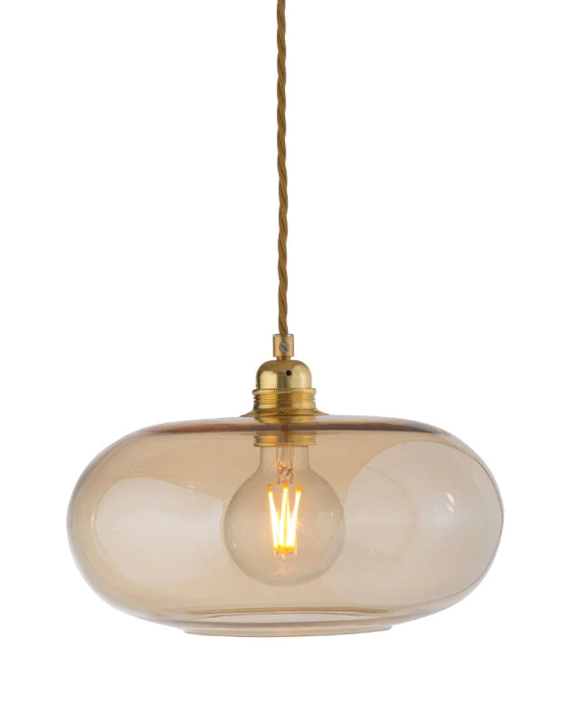 This captivating pendant showcases a wide shape and shallow height. Designed and handmade in Denmark from mouth-blown glass this retro pendant is paired with gold detailing that will add a sophisticated ambience to any interior. Designed to be used as a single installation to create an interior focal point or installed as a cluster. To be paired with an E27 globe (not included). Available in an assortment of glass colours and sizes.