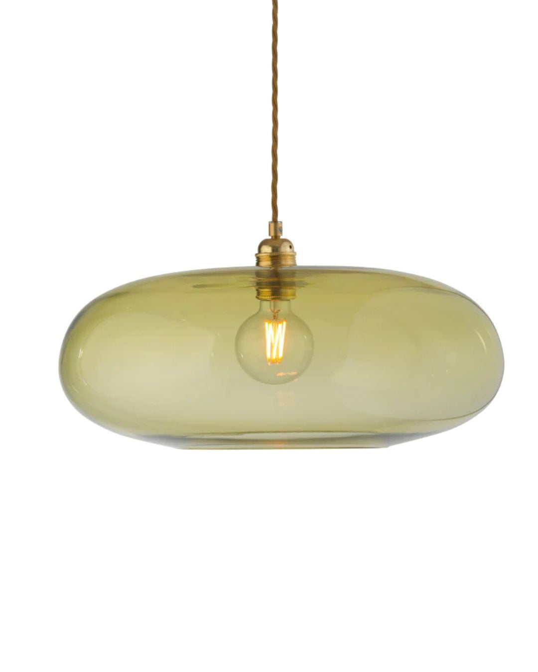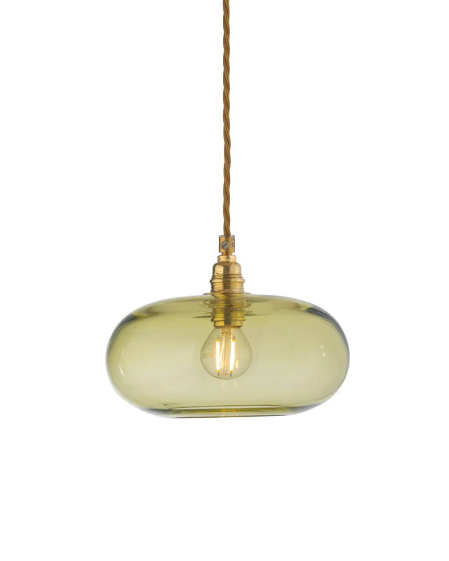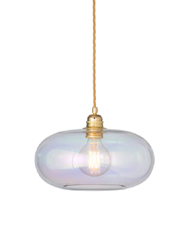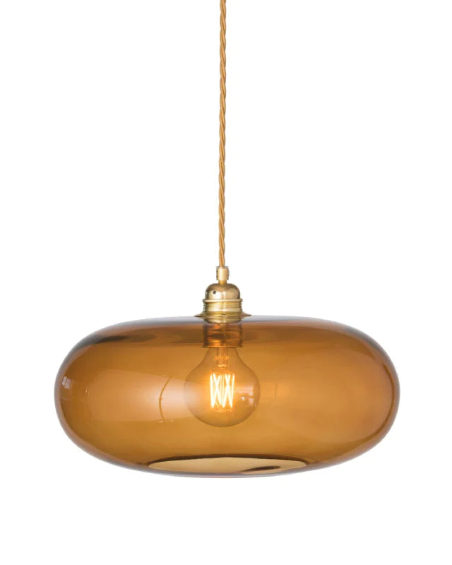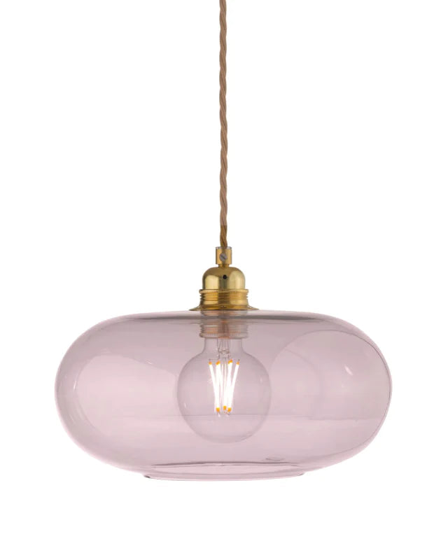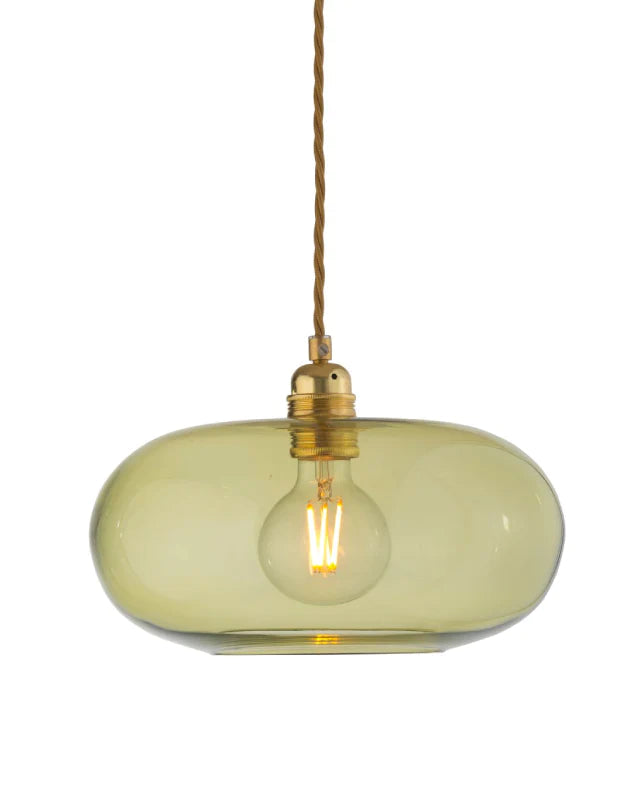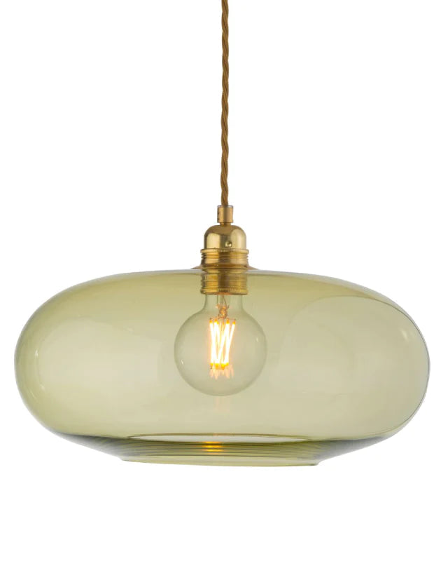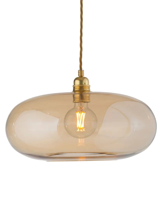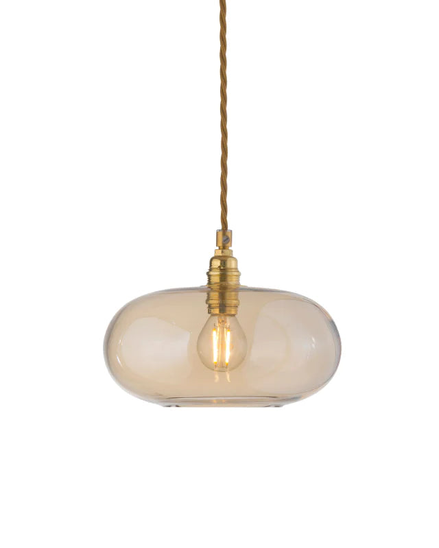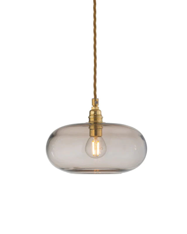 This captivating pendant showcases a wide shape and shallow height. Designed and handmade in Denmark from mouth-blown glass this retro pendant is paired with gold detailing that will add a sophisticated ambience to any interior. Designed to be used as a single installation to create an interior focal point or installed as a cluster. To be paired with an E27 globe (not included). Available in an assortment of glass colours and sizes.