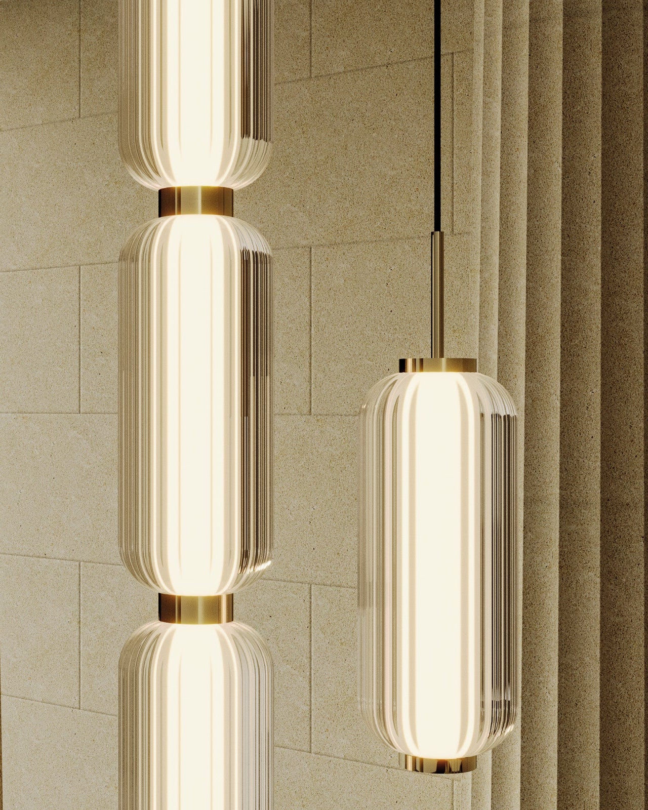 Modern yet elegant, this pendant features three cylinders crafted from transparent striped glass and incorporating an opal acrylic centre allowing to spread a soft and pleasant light. The three glass pieces are linked by a sleek circular metal fixture, available in matte brass or matte black finish, creating a perfect balance of elegance and design. Suspended either vertically or horizontally, this light is ideal in dining rooms, living rooms or kitchens.
