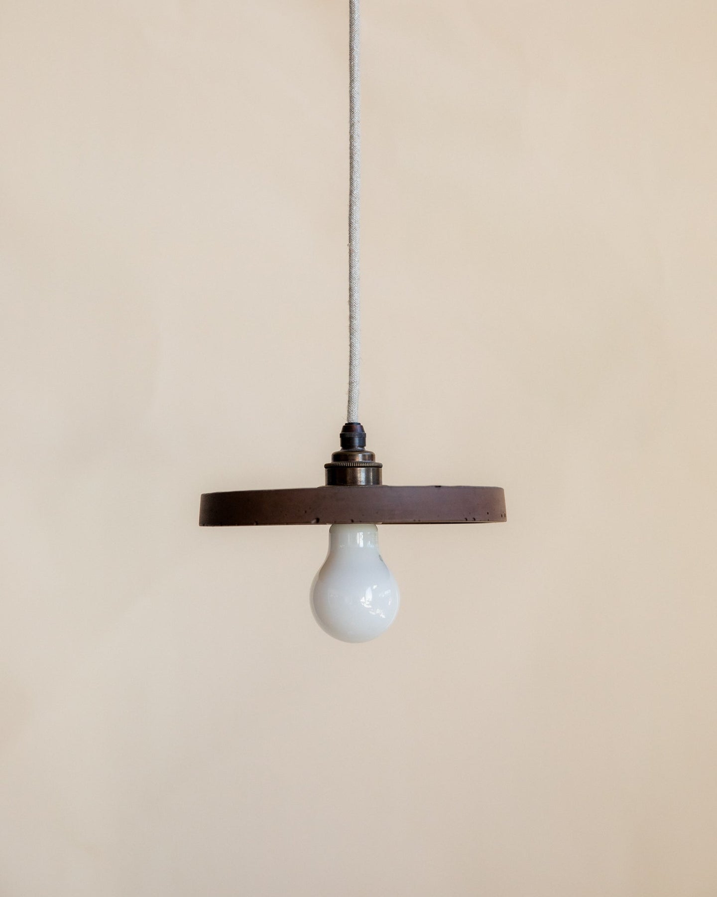 Minimalist pendant light with cocoa shade and white bulb on a beige background