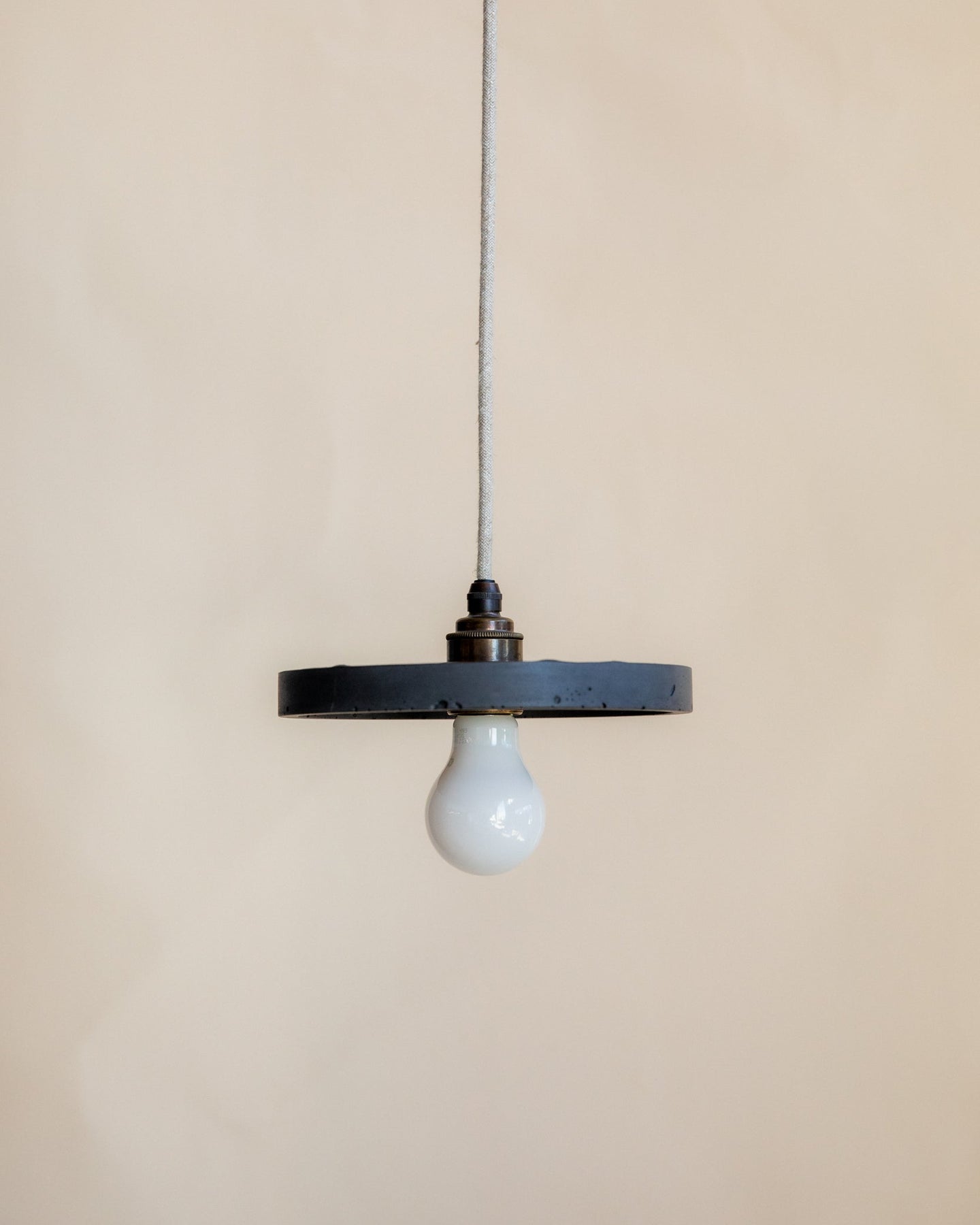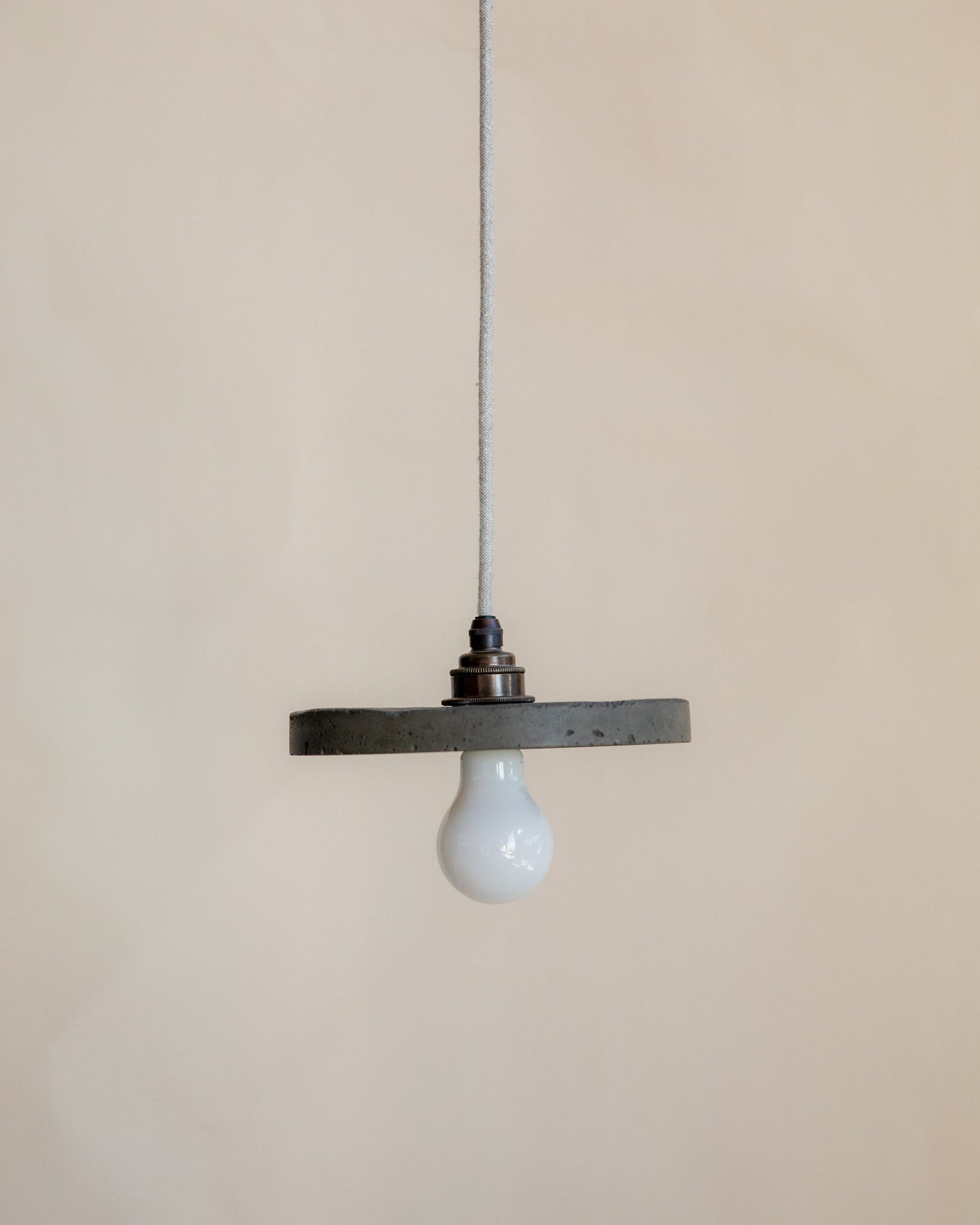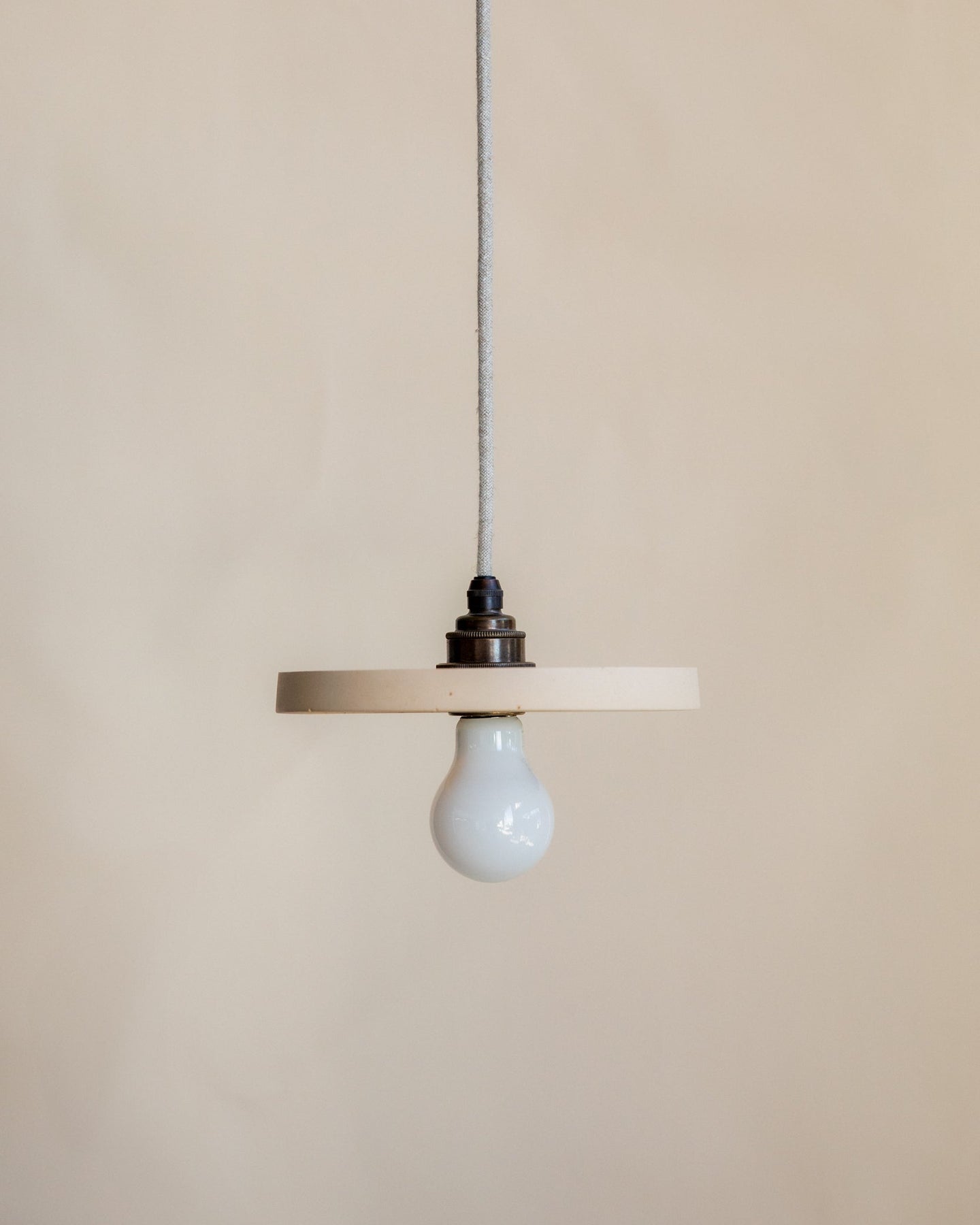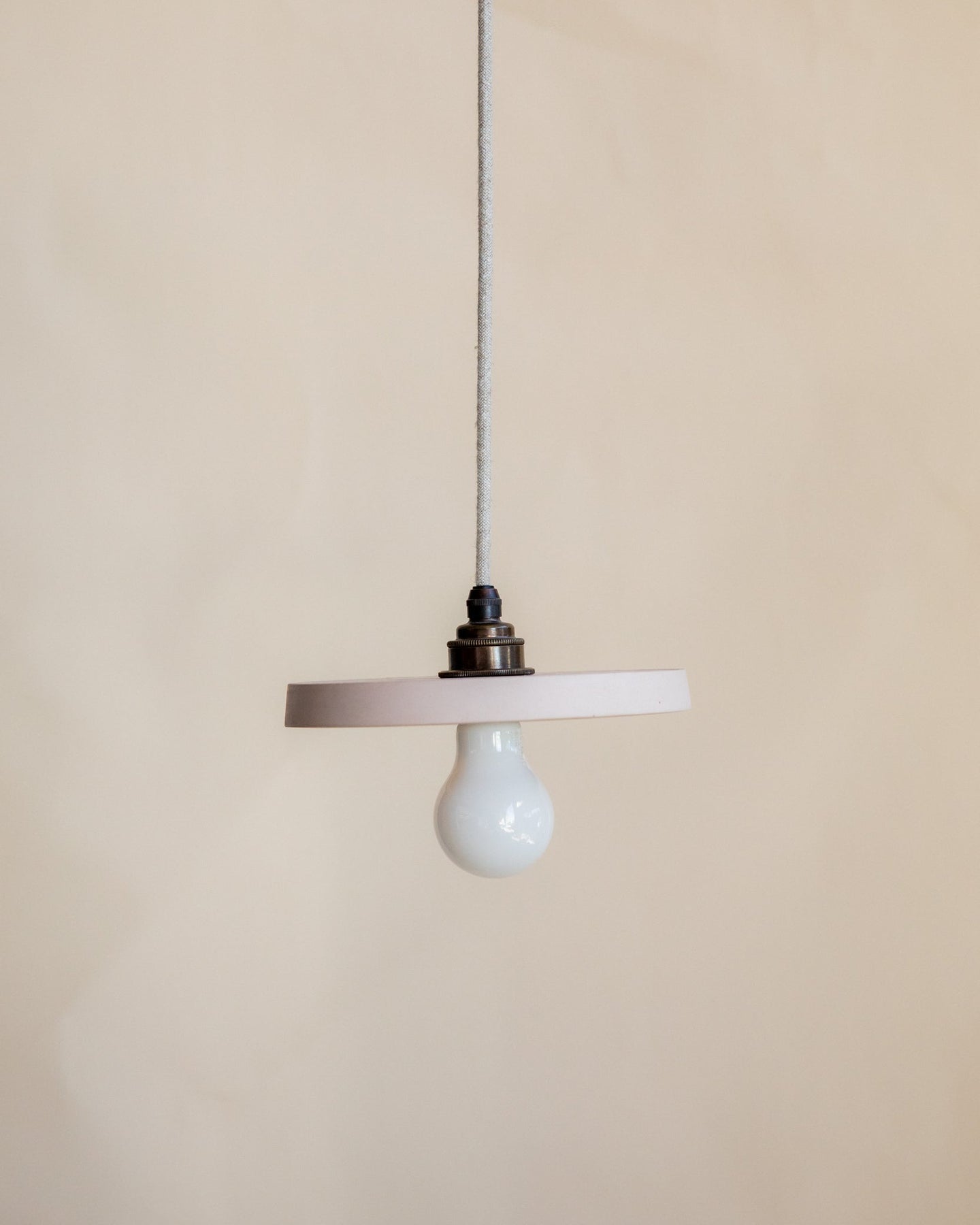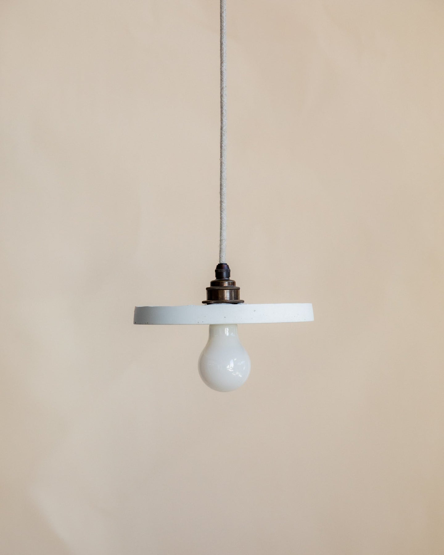 Minimalist pendant light with a white bulb against a beige background