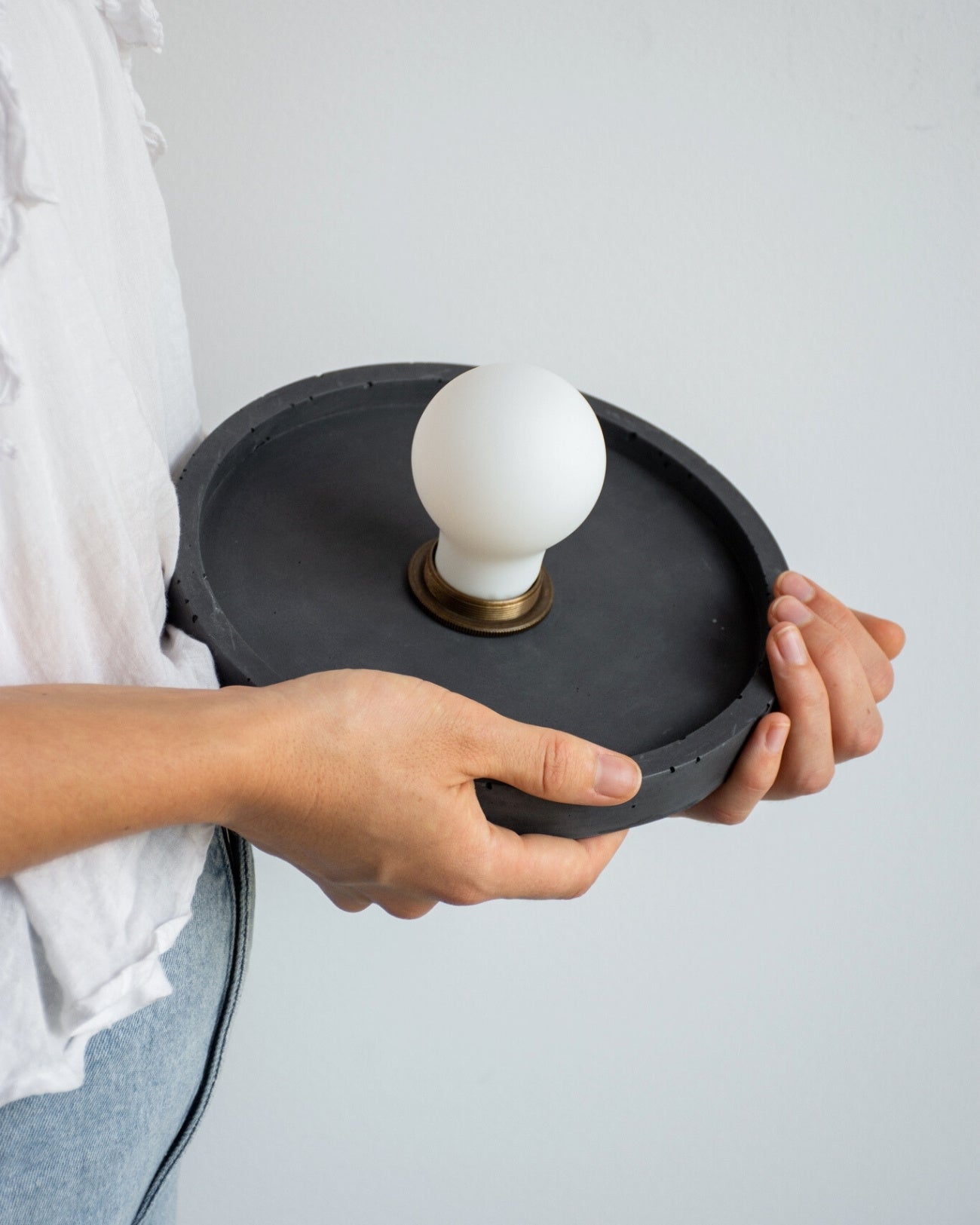 Person holding a black pendant light with a white light bulb