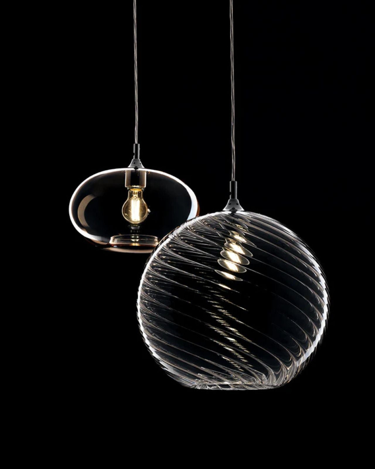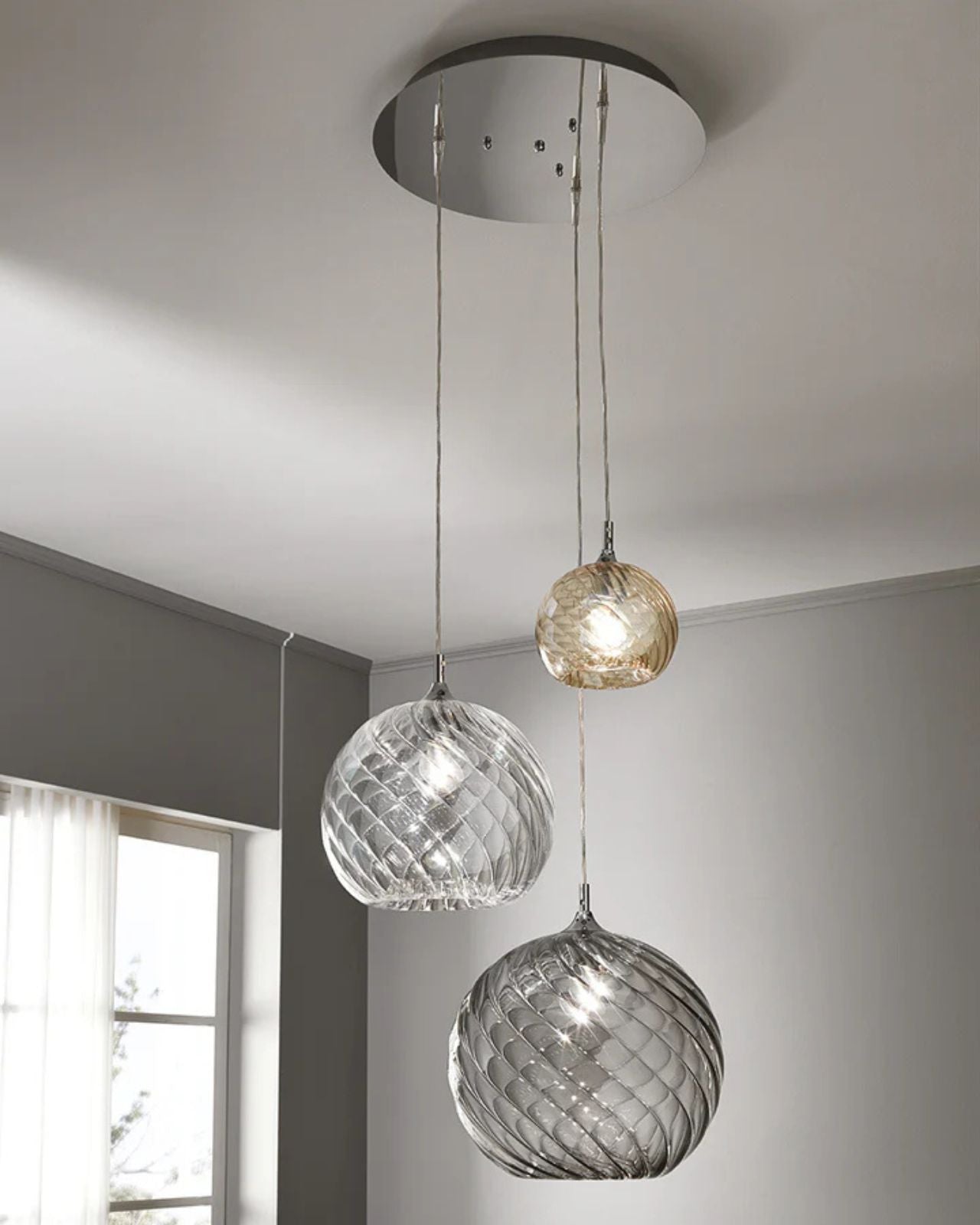 This versatile Italian Ribbed Glass Pendant Light boasts stunning design suitable for both traditional and contemporary decors. The hand-blown glass shade, available in three sizes and nine glass colours, is suspended from a chrome frame on a thin, subtle cord suspension. For a touch of elegance and customization, metallic finishes are available for an additional cost. Each light is individually handcrafted, resulting in unique forms and finishes. Please note that each pendant light comes with its own ceiling canopy, while multiple pendant ceiling plates are available for purchase separately. Contact us for more information.