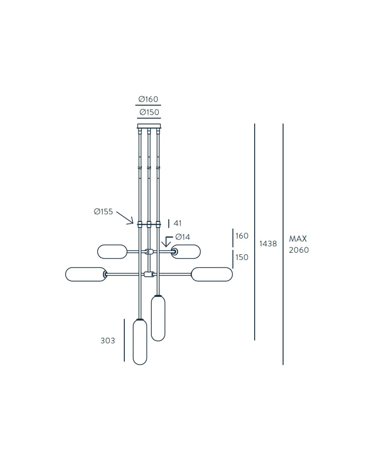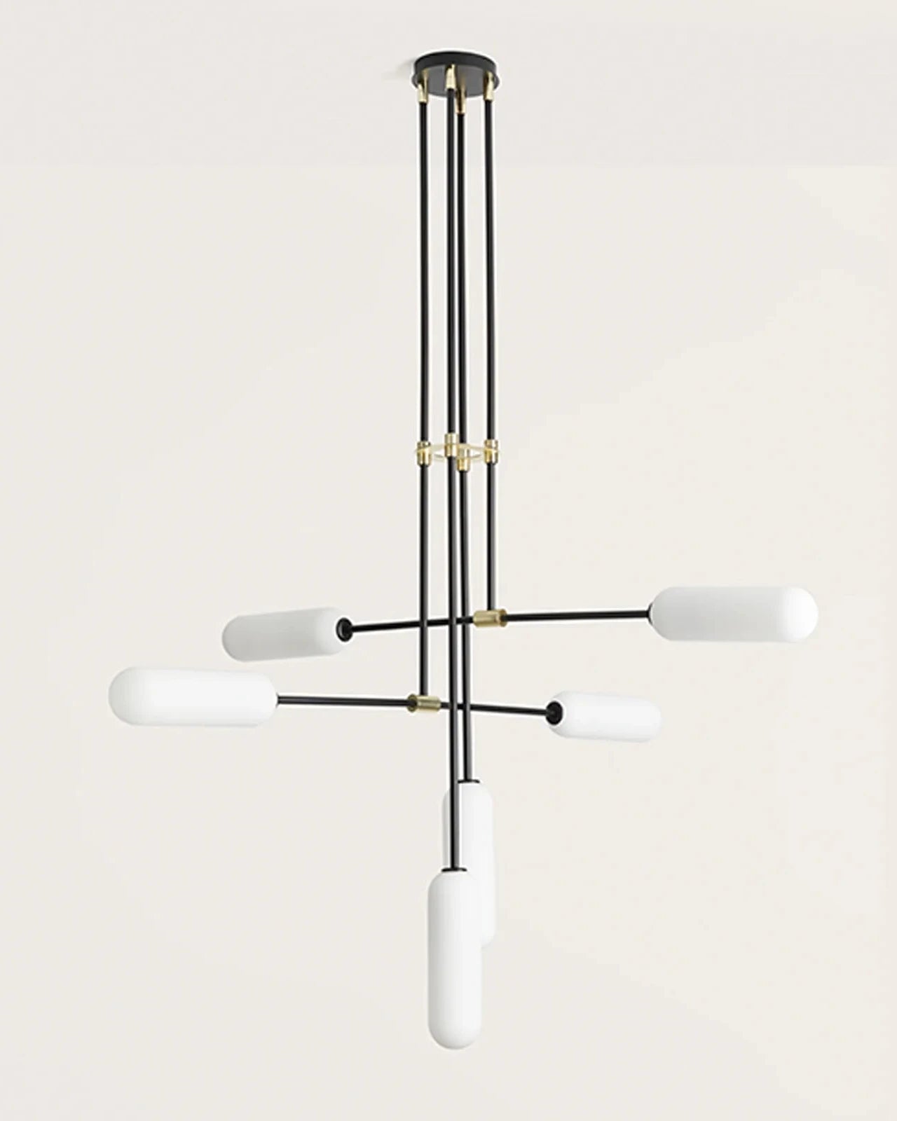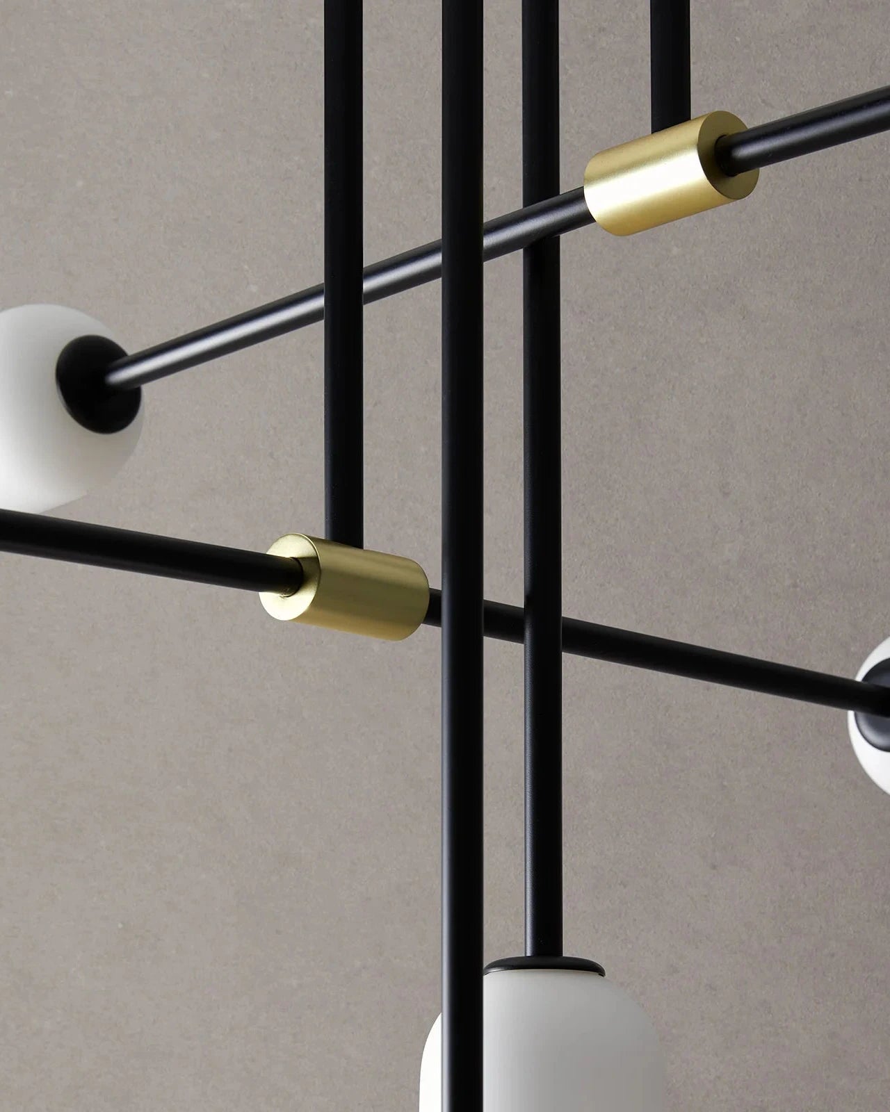 A minimalist chandelier consisting of six opal diffusers suspended by matte black steel rods paired with subtle brass detailing. With each diffuser placed at a different height or position, this Spanish design's impressive form changes with the viewer's position.