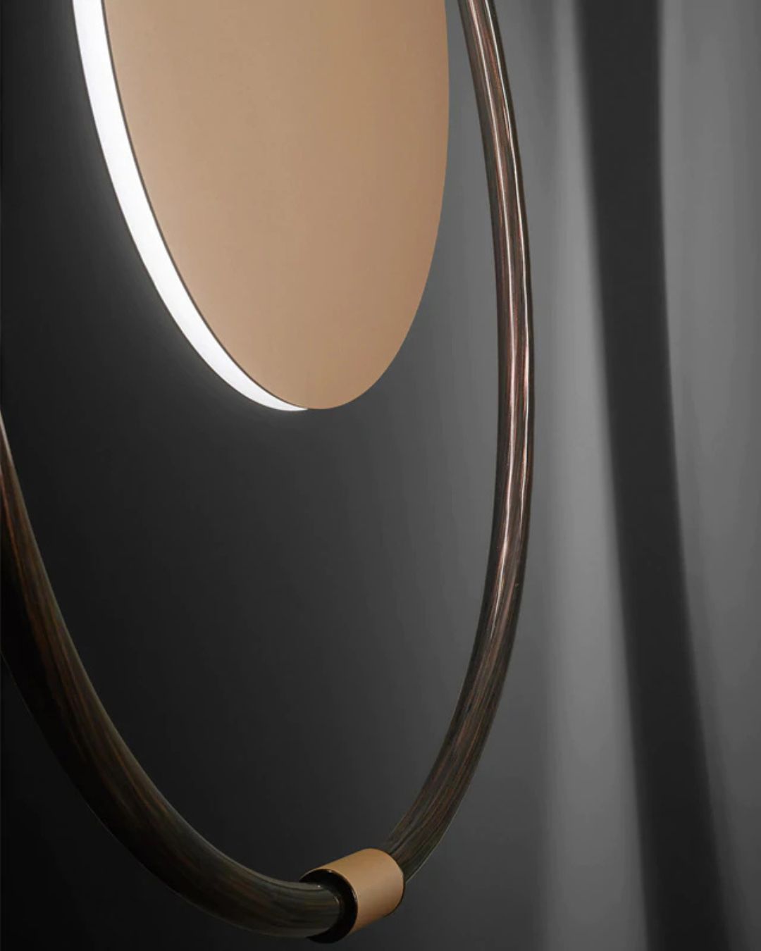 Featuring a tubular circle of black artistic glass, paired with an internal metal disc in a Matte Champagne finish this fitting will be sure to be a captivating decorative pendant. The Modern Artistic Hoop Pendant is designed and made in Italy, and has an IP rating of IP20, a 16W inbuilt LED Warm Light to provide a warm ambient glow to your Indoor spaces such as a Living Room, Dining Room, Office or Stairway void.
