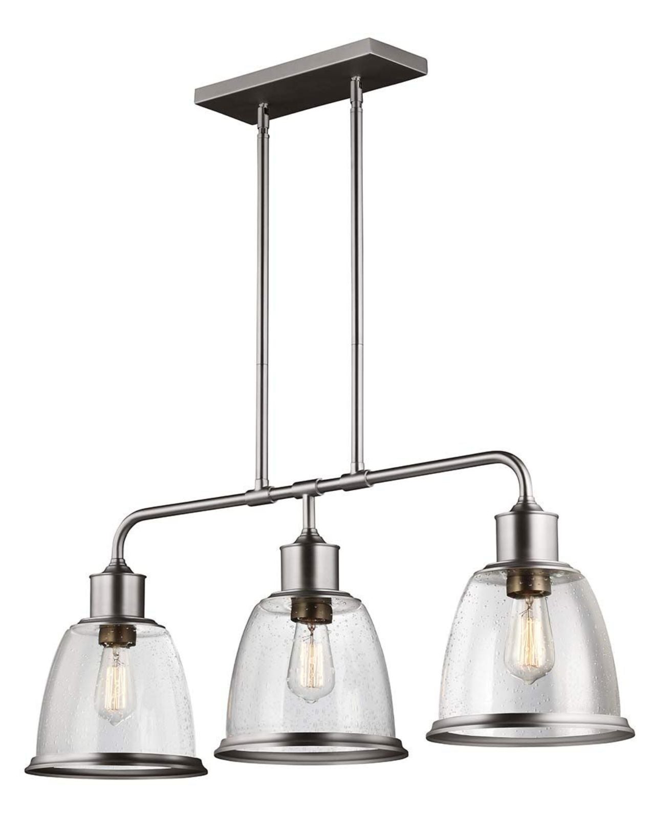 A bold modern design that creates a refined industrial ambience. This tri drop pendant fixture is available in an Aged Brass or Satin Nickel finish. Use this sophisticated light to enhance the atmosphere of your kitchen, dining area or in your restaurant/café.
