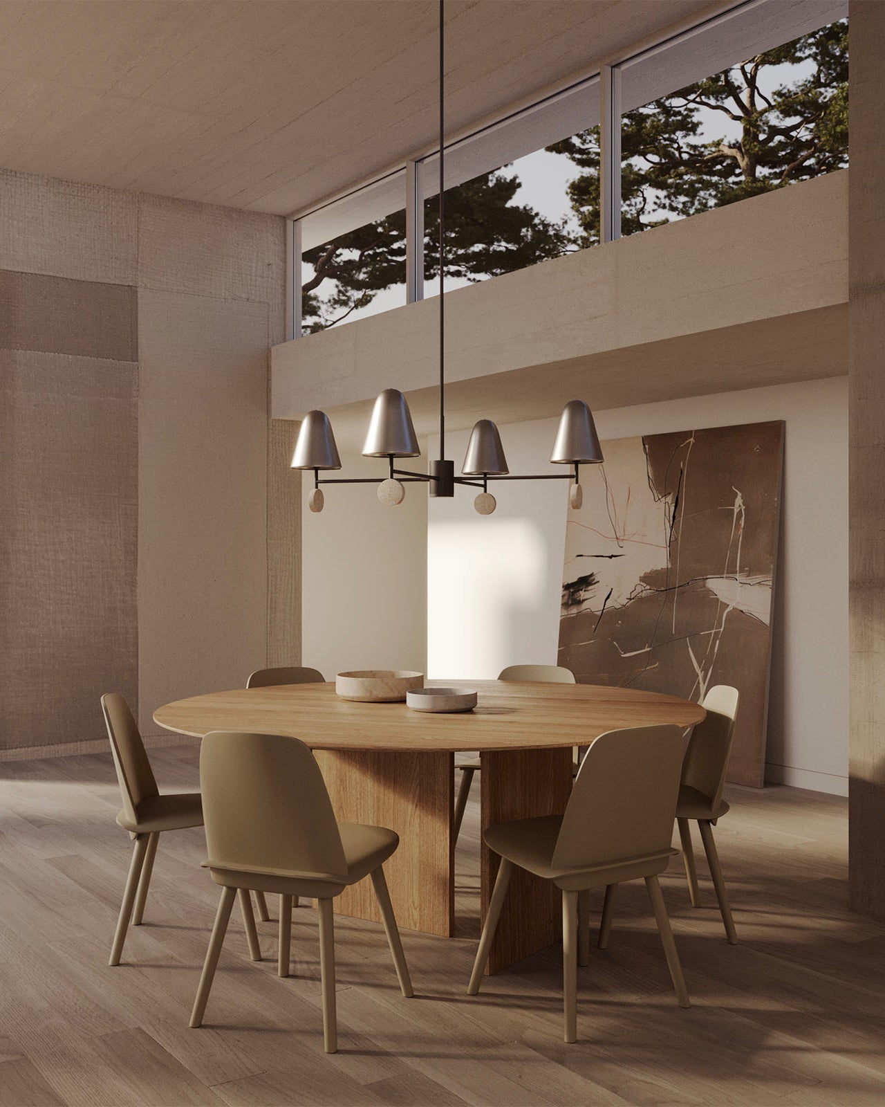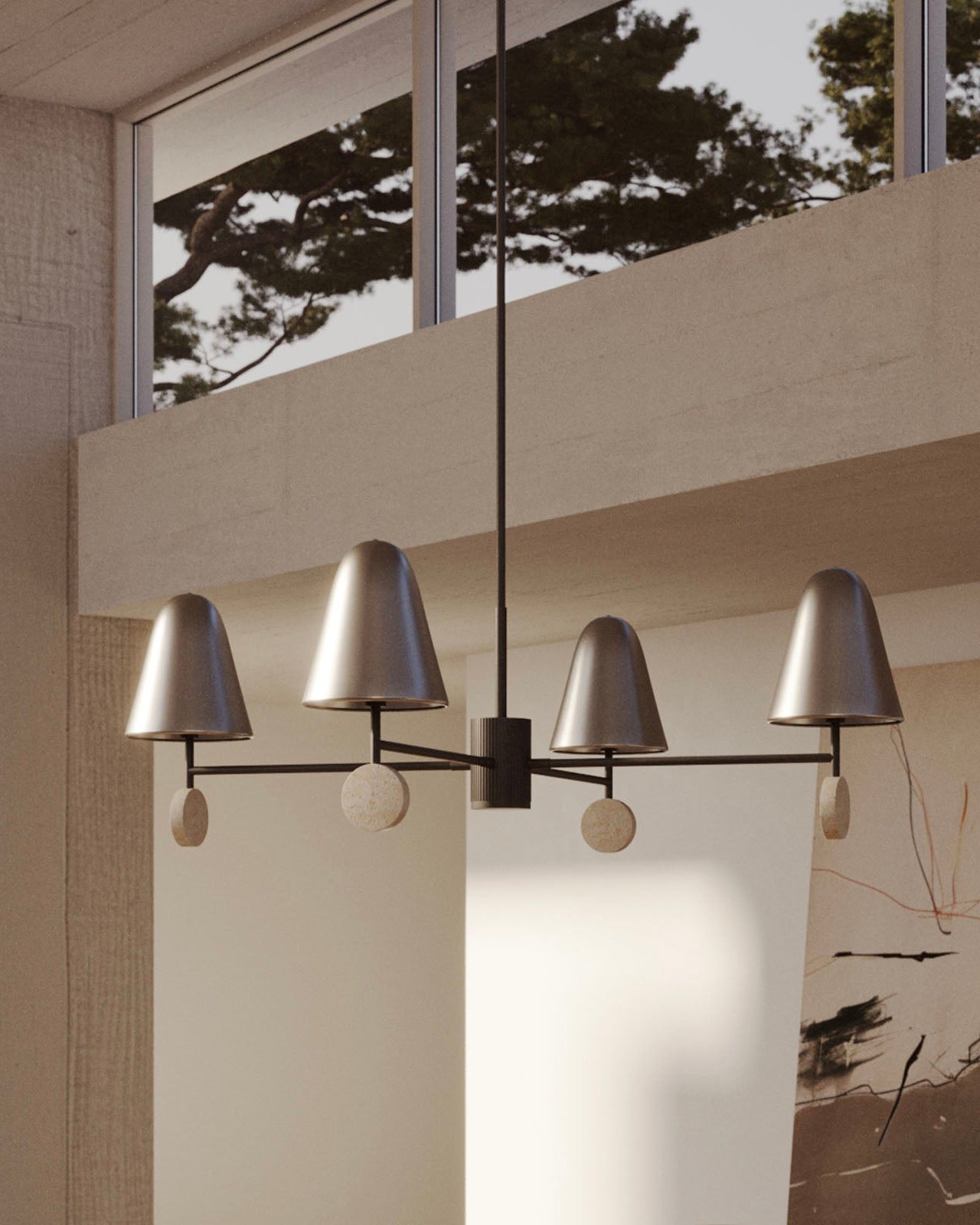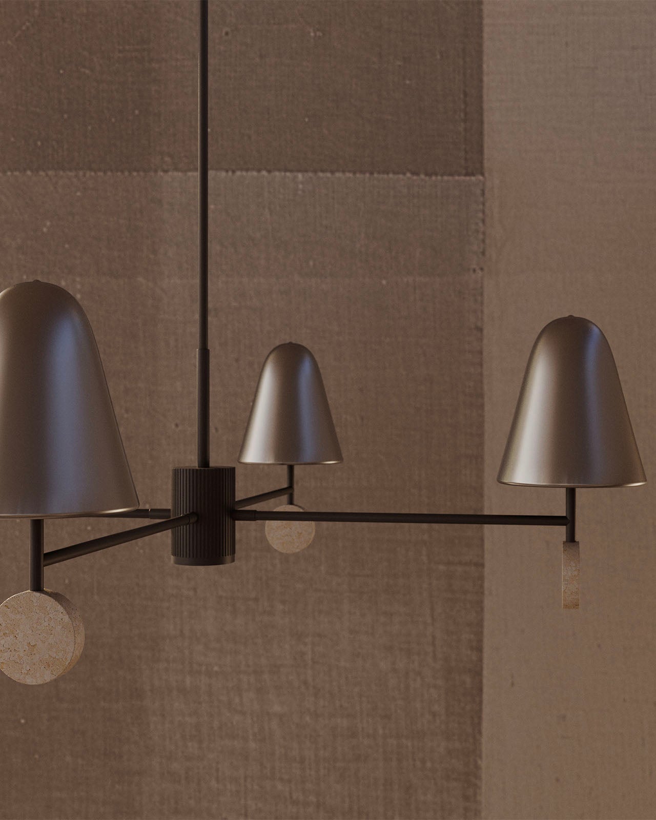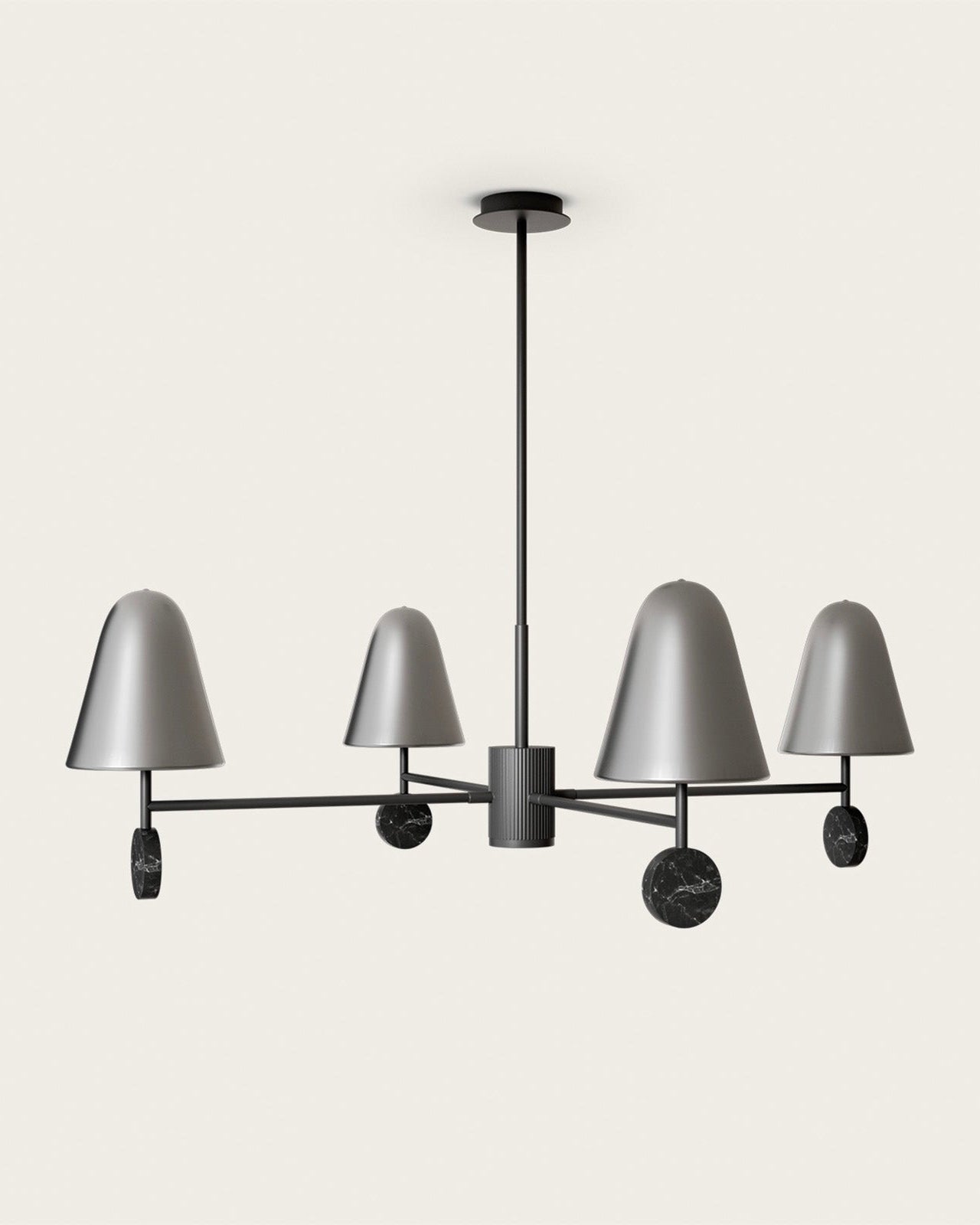 The Nordic Marble 4 Light Chandelier is a modern, minimalist chandelier with a striking and elegant design. It features four conical lampshades in a sleek metallic finish, with each lampshade mounted on a horizontal arm that extends from a central cylindrical hub with vertical ridges for added texture. The arms are anchored with circular marble or travertine discs at each end, adding a luxurious contrast to the metallic components and enhancing the visual balance. Ideally placed above a dining table, in a living room, or in a stylish entryway to highlight its modern, sculptural form.