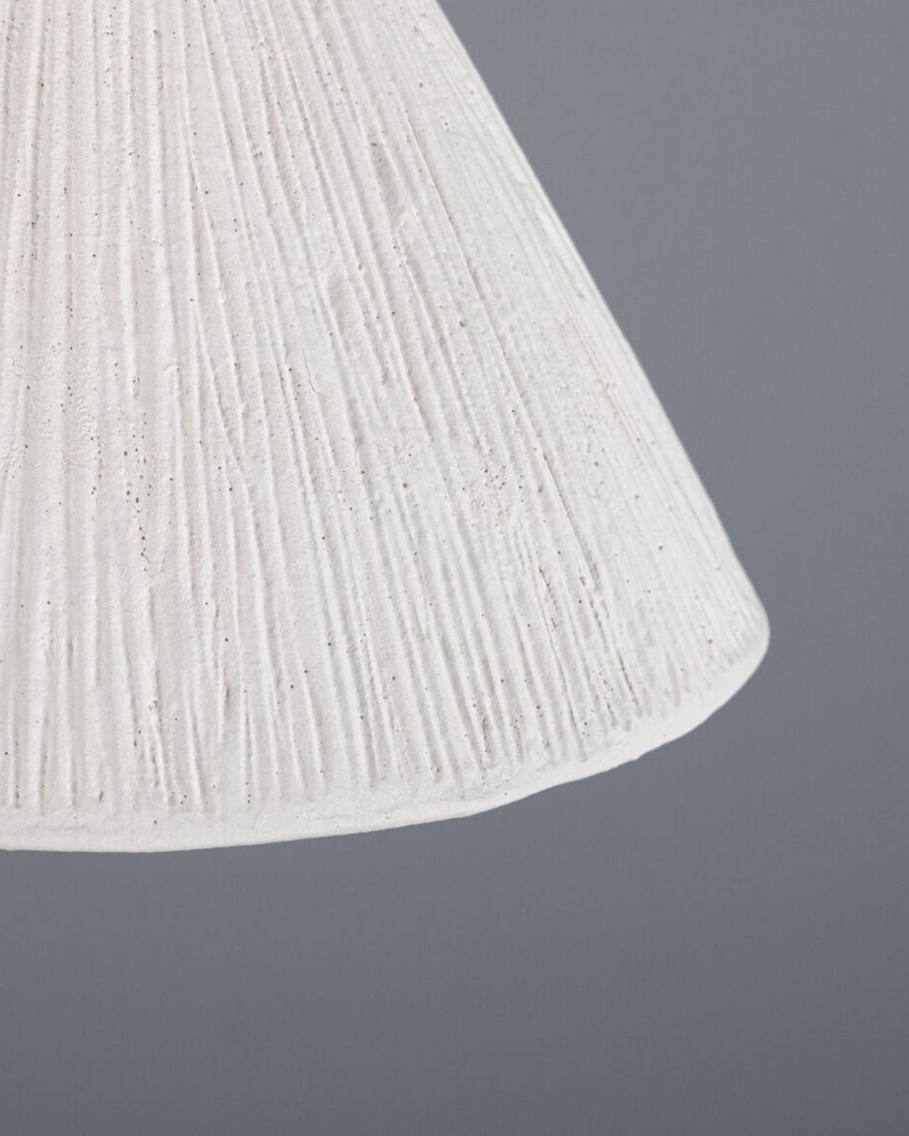 The Short Ceramic Grooved Pendant is a cone-shaped ceramic shade crafted in Ireland. This design takes inspiration from the Aspen tree's tall stature. Intertwining organic materials with brass, this design features a braided brass ring and hand-carved grooves. Similar to the 'Long Ceramic Grooved Pendant', this fixture is striped with texture and a refined, modern matte white finish.