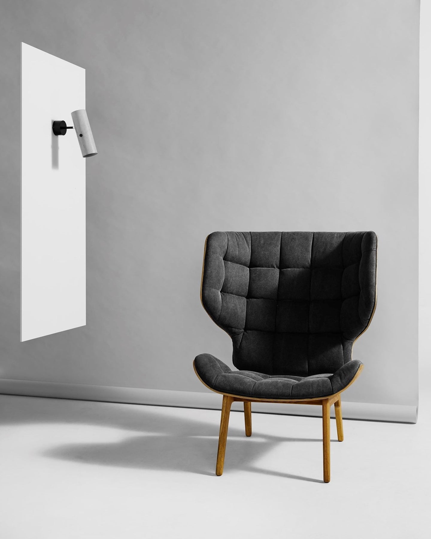 Concrete spotlight above a grey upholstered chair with wooden legs