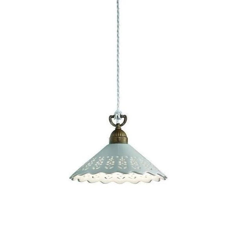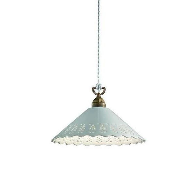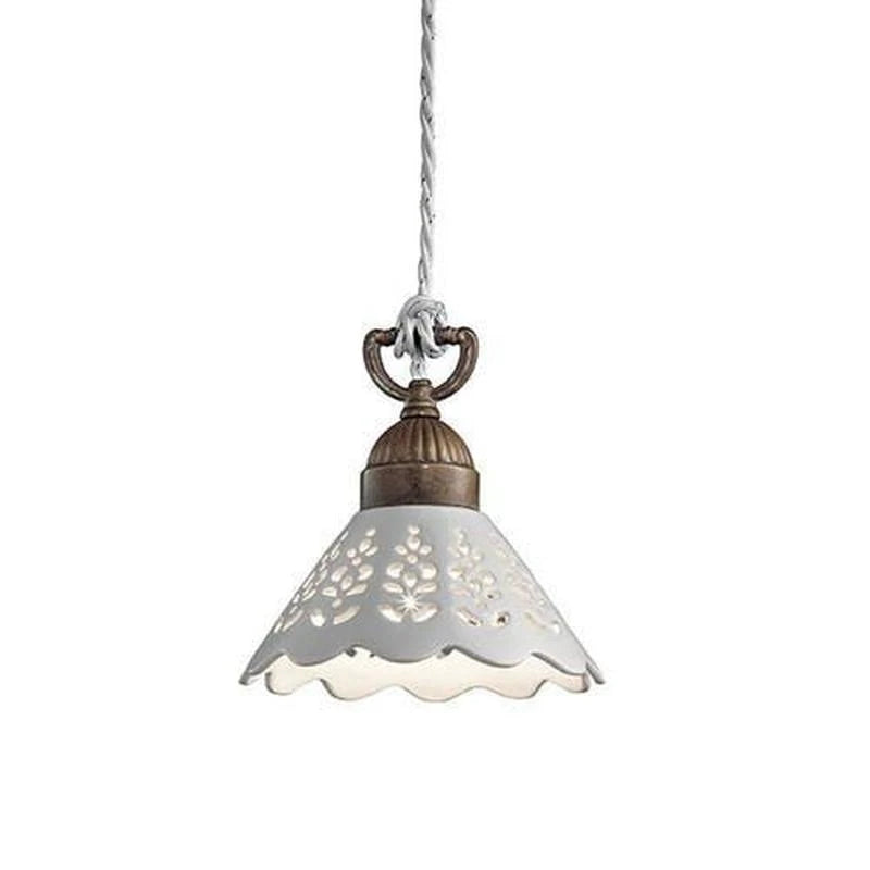 Part of a range of stunning Italian pendant lights made from white fretted ceramic with a frame of antiqued brass. The perforated detail of the fretted ceramic is inspired by the delicate stitching of lace fabric, which produces unique floral patterns on surrounding surfaces.
