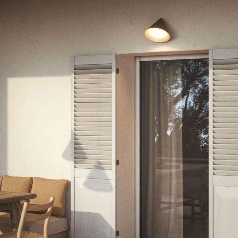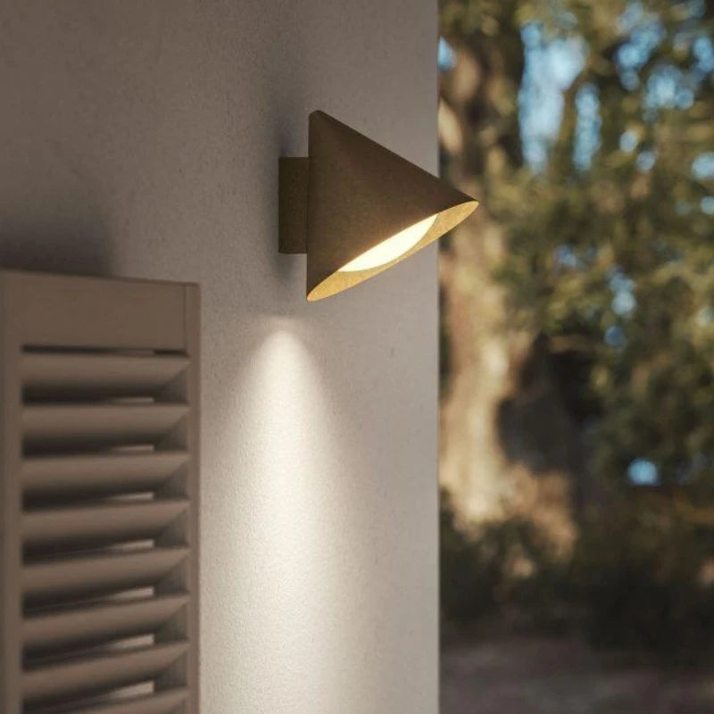 This Italian exterior wall light is crafted from high-quality pre-aged brass paired with a white acid-etched blown glass diffuser. This classic design showcases perfect simplicity in its cone-shaped form and flush wall mount. Featured with an IP55 rating this fitting is suitable for exterior installation. Minimal in its traits this outdoor wall light is designed to complete both residential and commercial spaces.