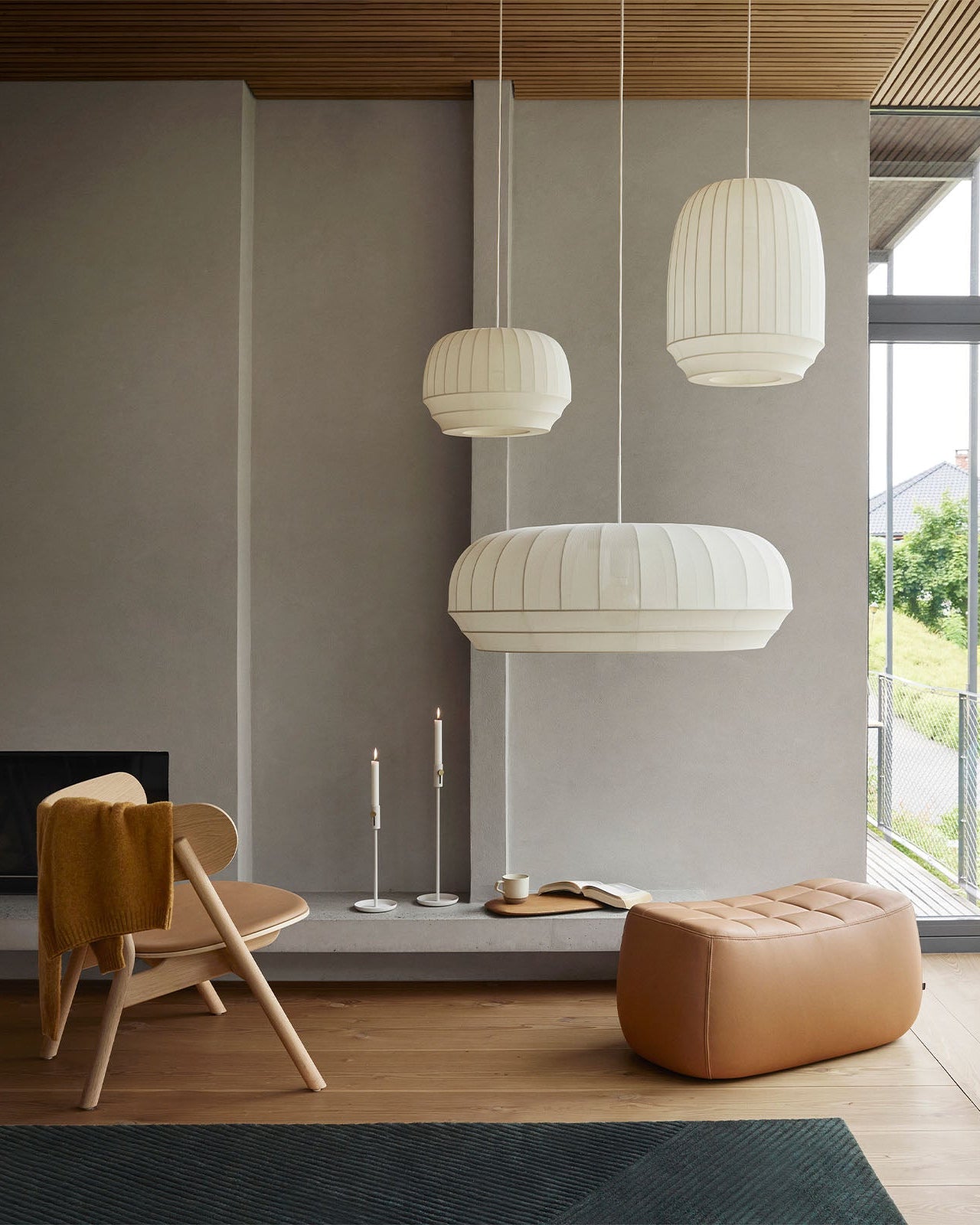 Modern living room with pendant lights, a chair, and an ottoman.