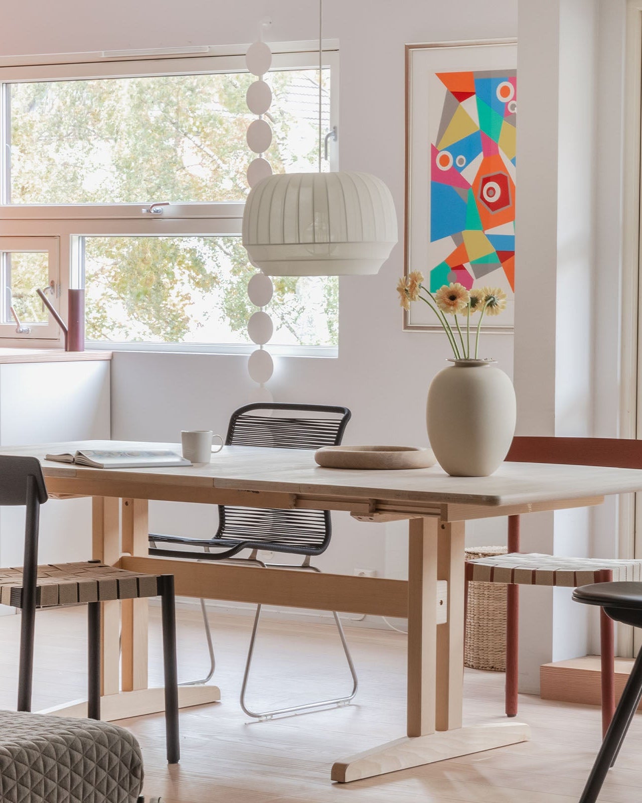 Modern dining room with a wooden table and chairs, colorful abstract art on the wall.
