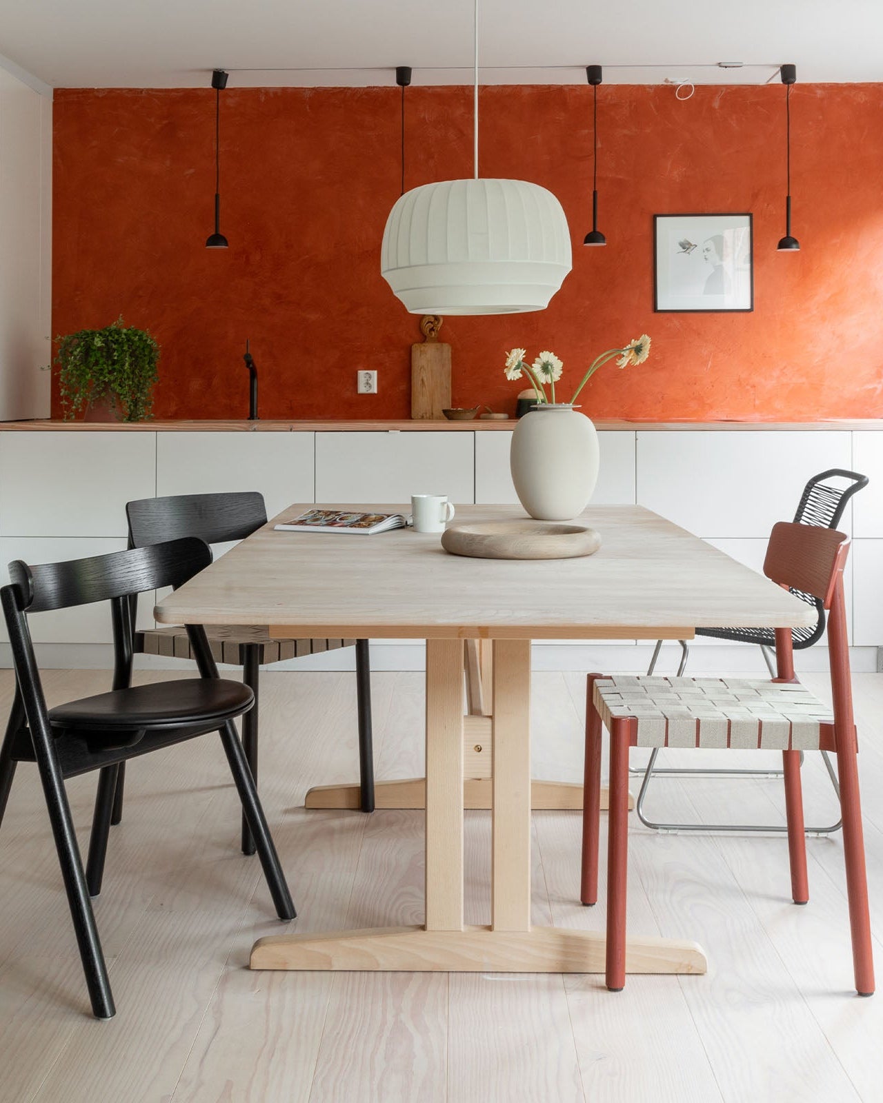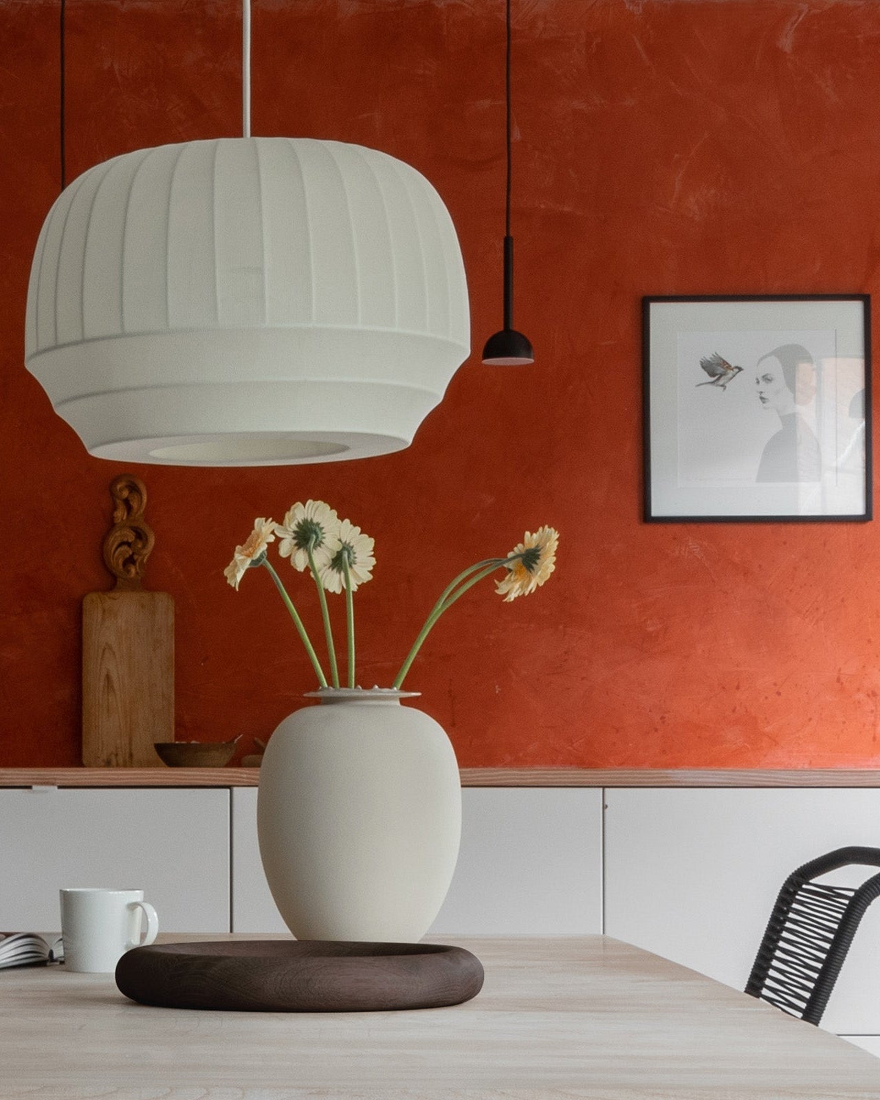 White vase with flowers on a wooden table against an orange wall with a light fixture.