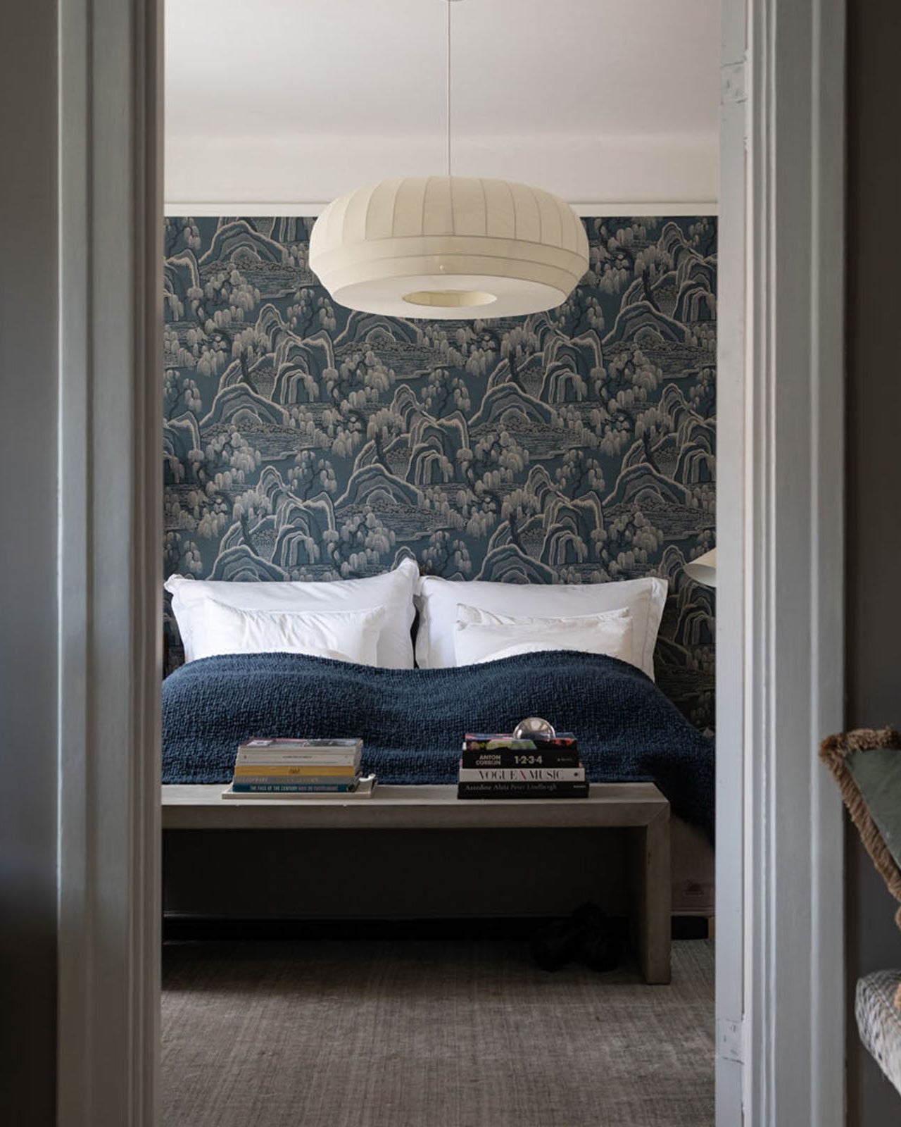 Bedroom with patterned wallpaper, blue bedding, and a ceiling lamp.