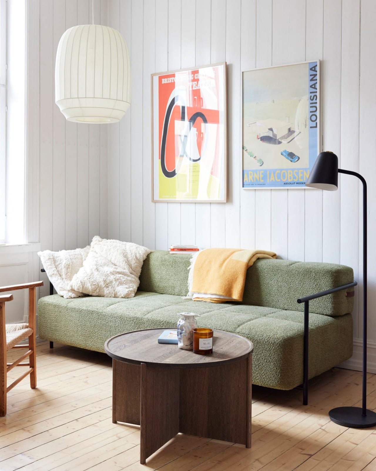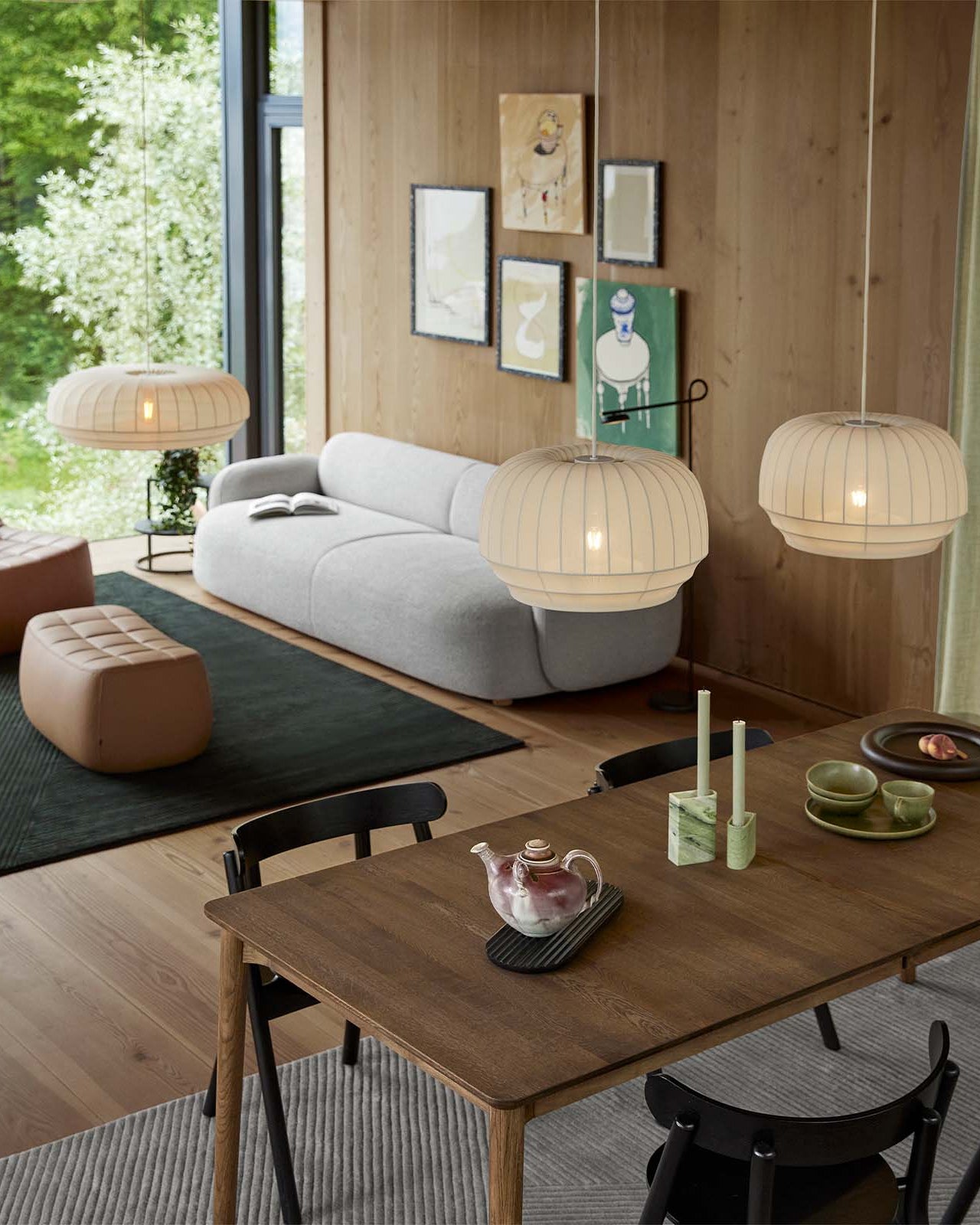 Modern living room with a wooden table, white sofa, and pendant lights.
