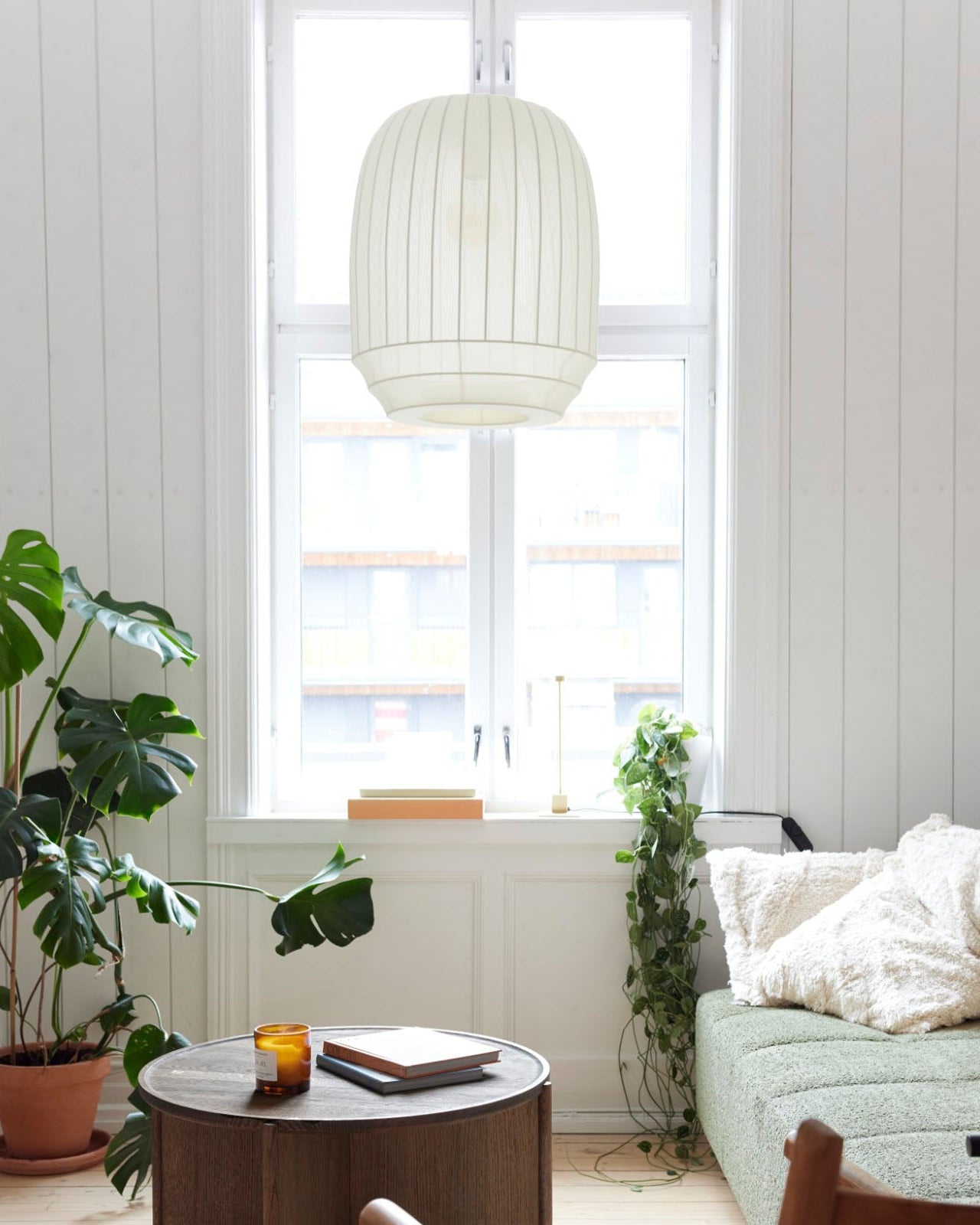 Modern living room with a ceiling light, large window, plants, and a light green sofa.