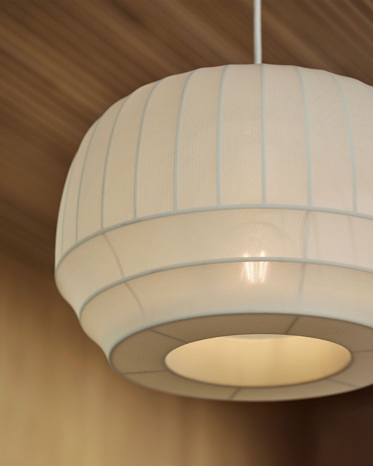 Ceiling light fixture with ribbed design on a wooden ceiling