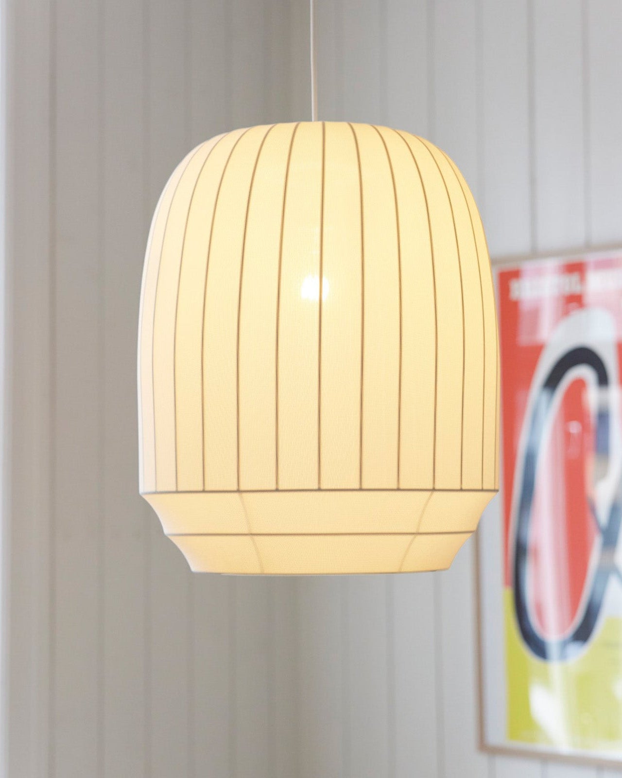 Illuminated pendant light hanging in a room with a colourful poster on the wall.
