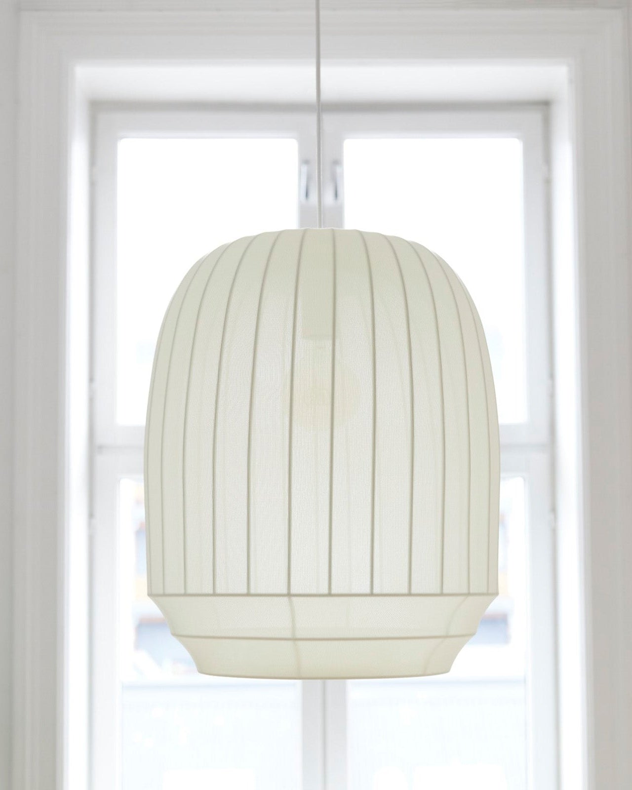 White textured lampshade against a white window background