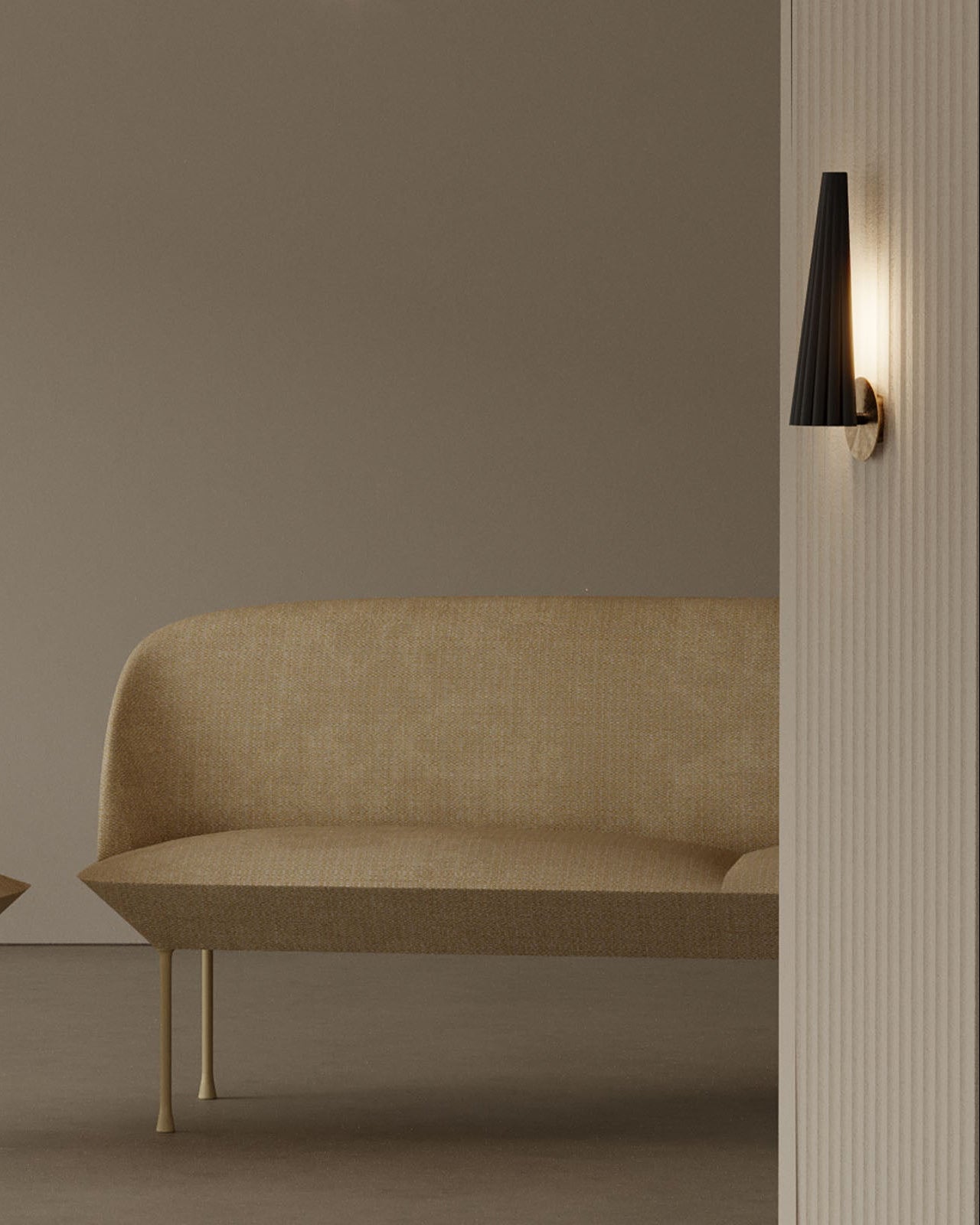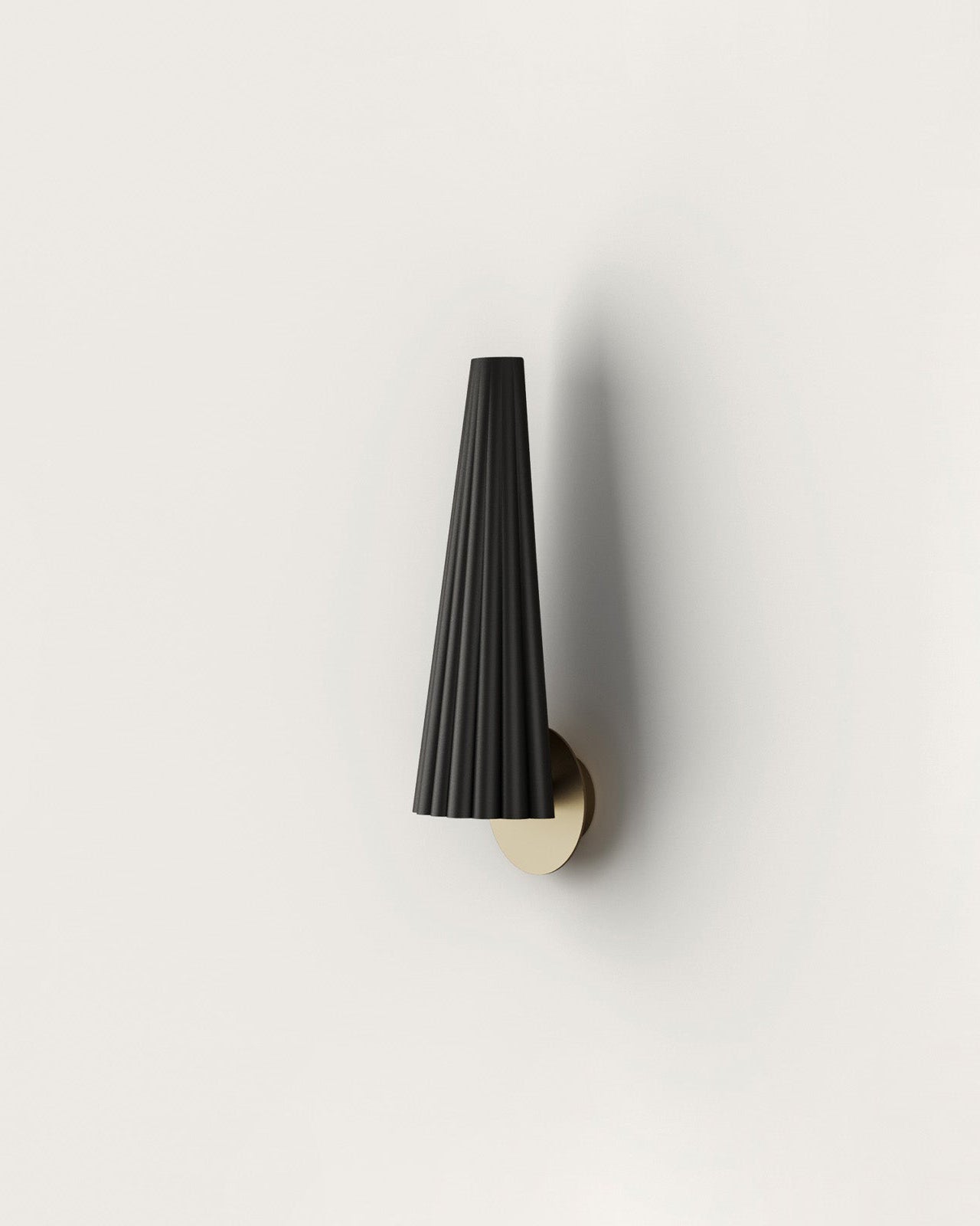 Mounted on a sleek metal plate with an aged gold or black finish, this stylish wall lamp is made from high-quality steel and has a stunning corrugated conical shape.  The Modern Corrugated Steel Wall Sconce is a true object of design and will be a striking addition to any modern interior. Available in Matte White or Brass finish.