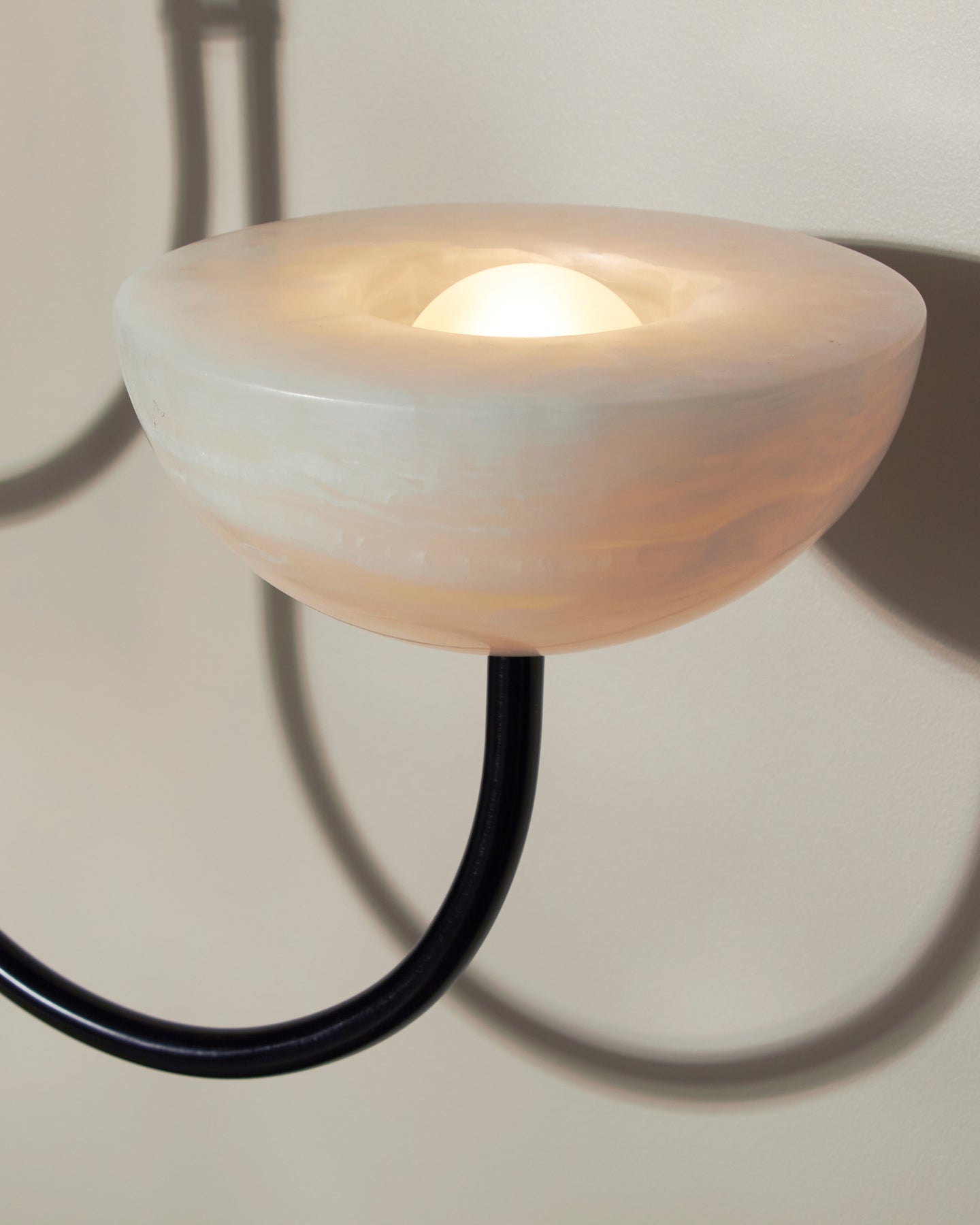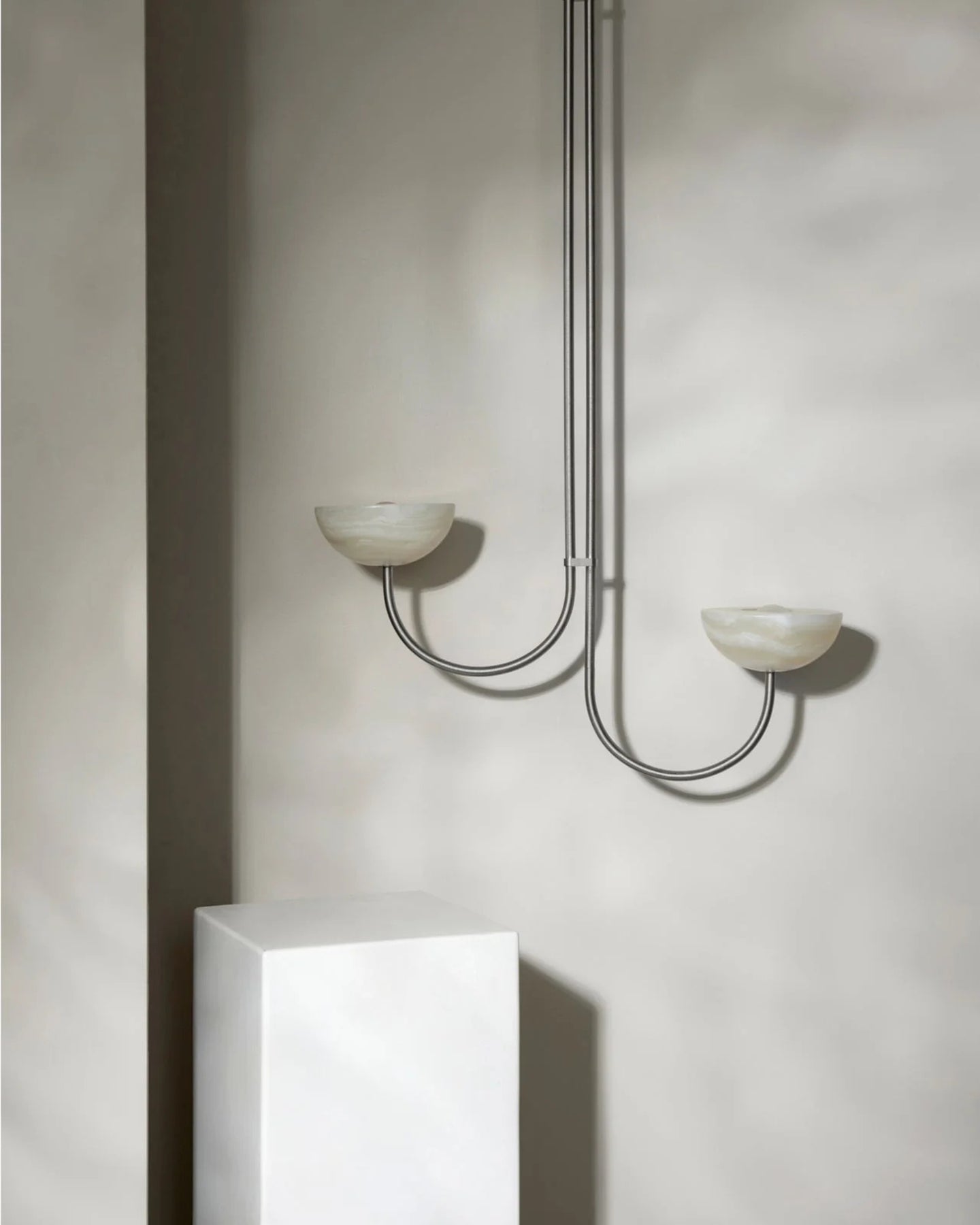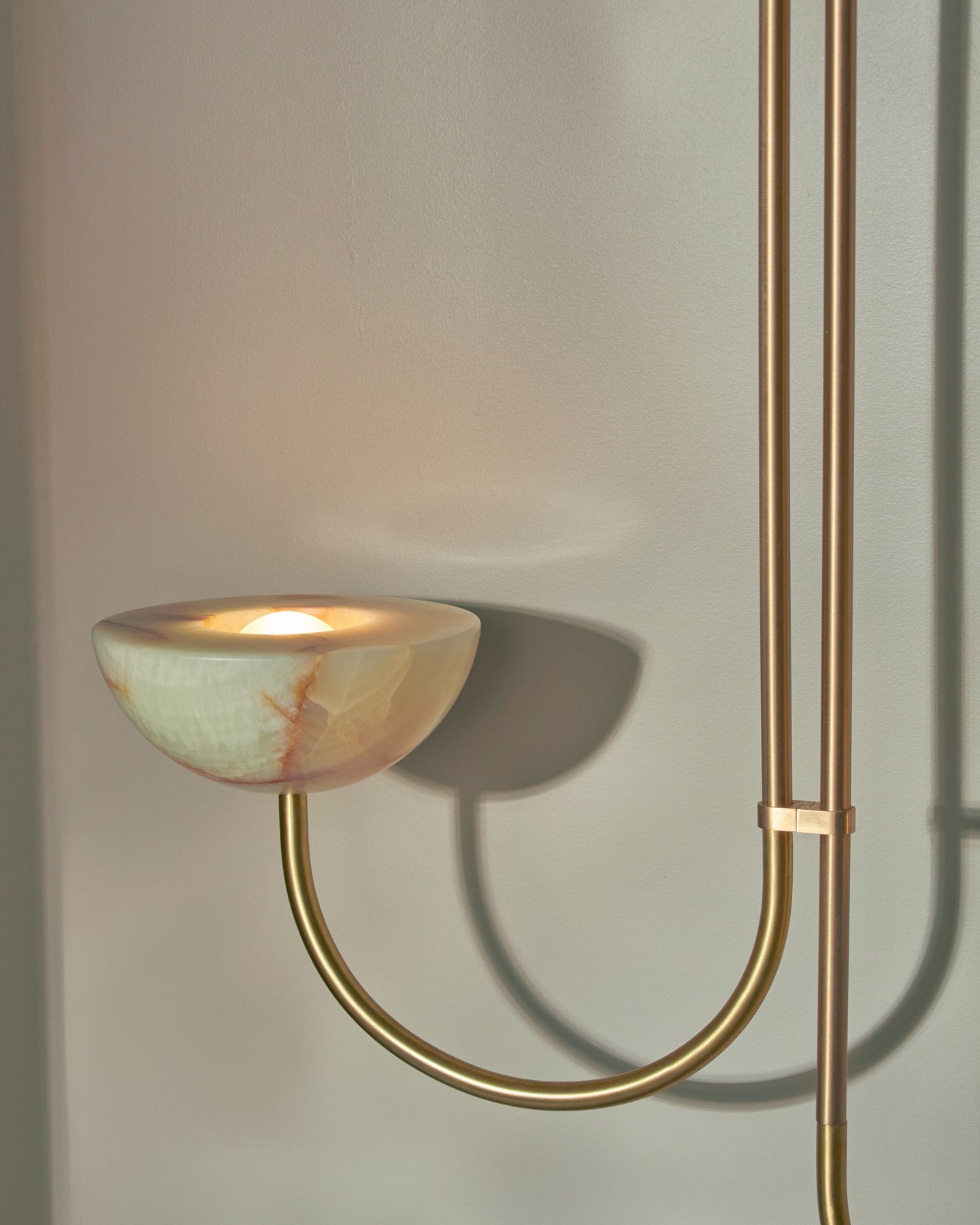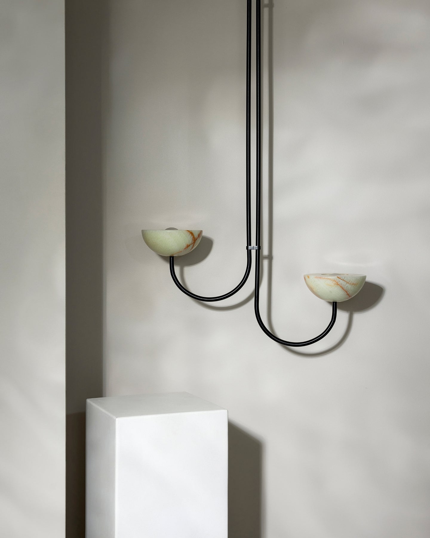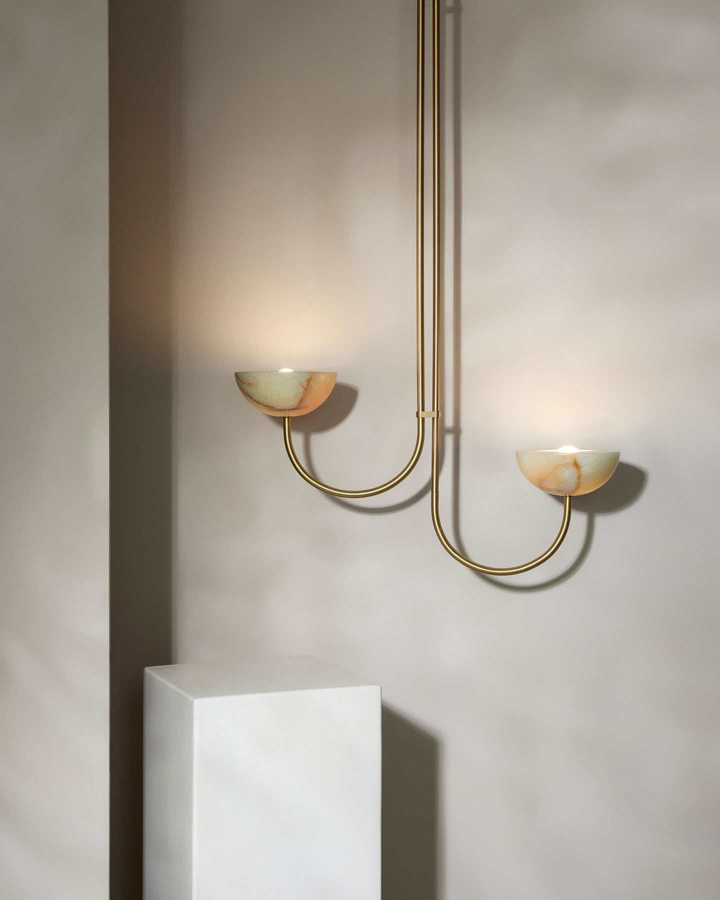 This contemporary asymmetrical double pendant perfectly combining the hardness of white or jade onyx with the feminine sensibility of the gentle curves of the domes and the metal structure. The elegant arms, available in brass, brushed black or satin white finish, hold the upside-down shades for a beautiful soft illumination spread in living rooms, dining rooms or bedrooms. This dual light is available in a small or large size to suit any interior space.