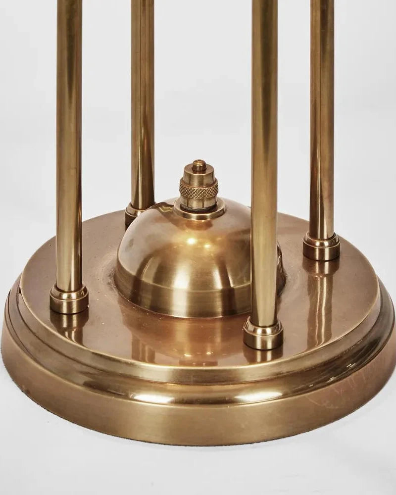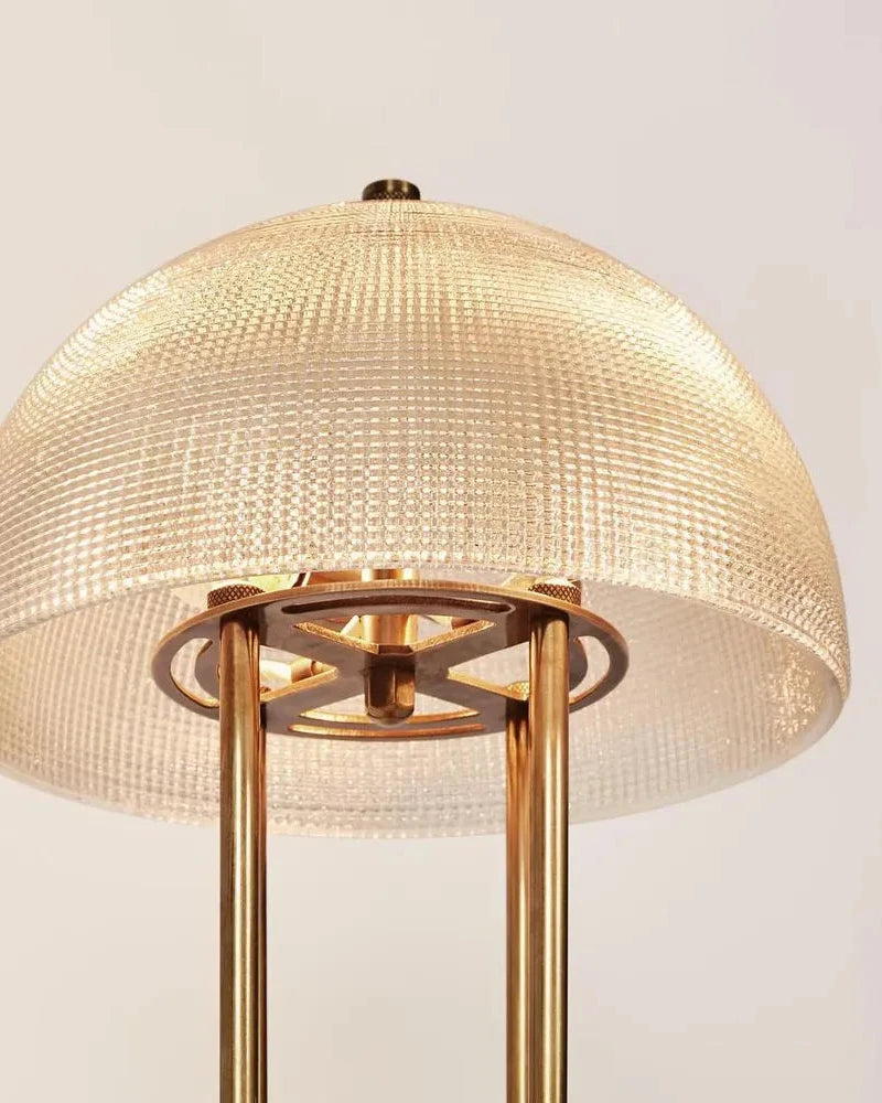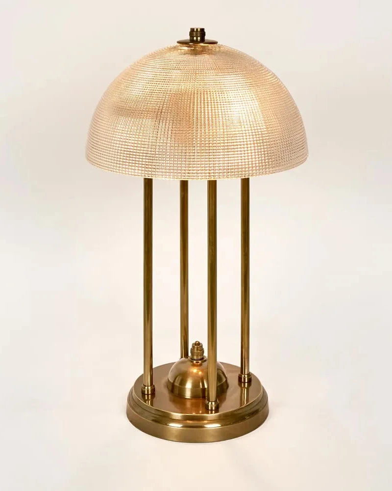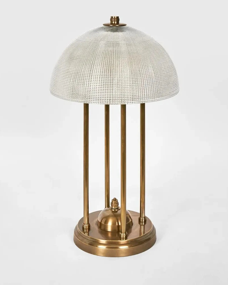 This vintage-inspired lamp features dark brass columns and textured glass. The dome-shaped glass shade allows the light to filter through, casting an alluring light that is perfect for traditional-style offices and bedrooms. For an added touch of charm, use a filament-style LED light bulb to replicate the look of antique table lamps.
