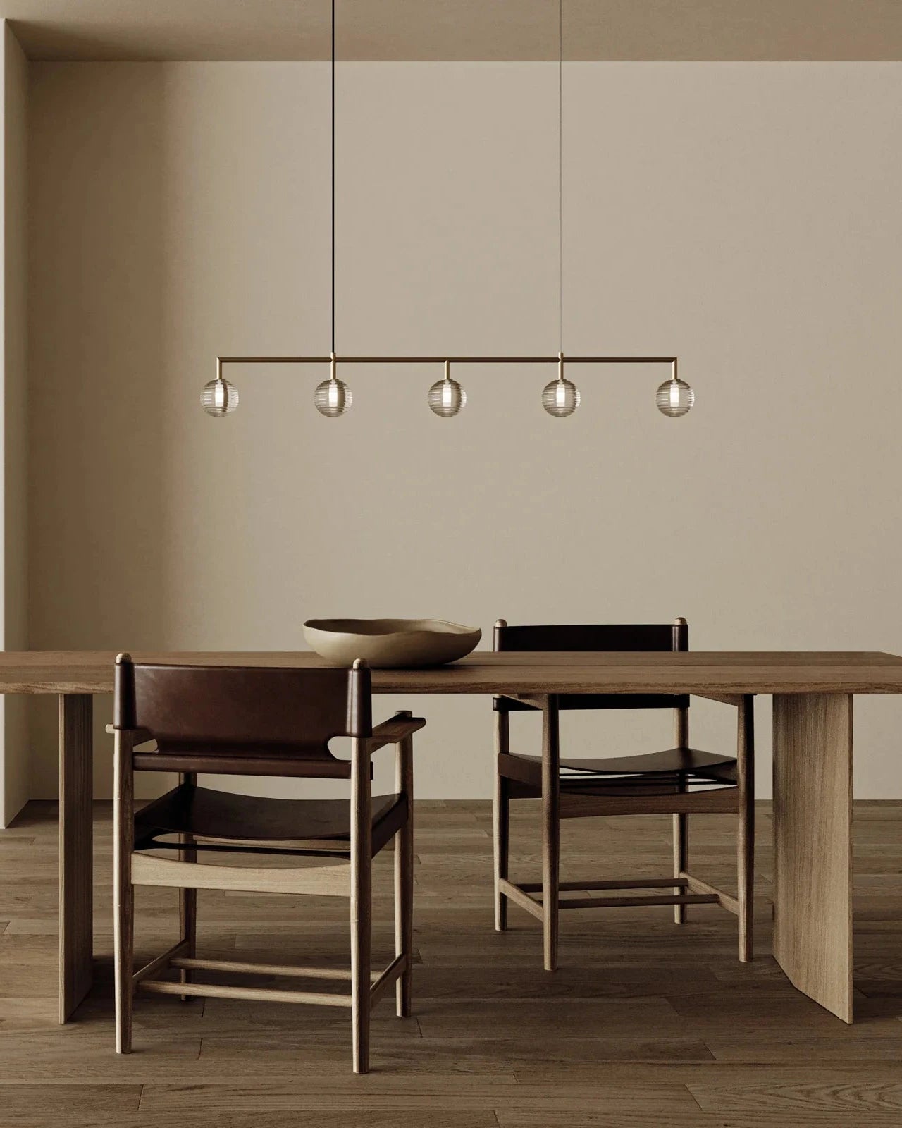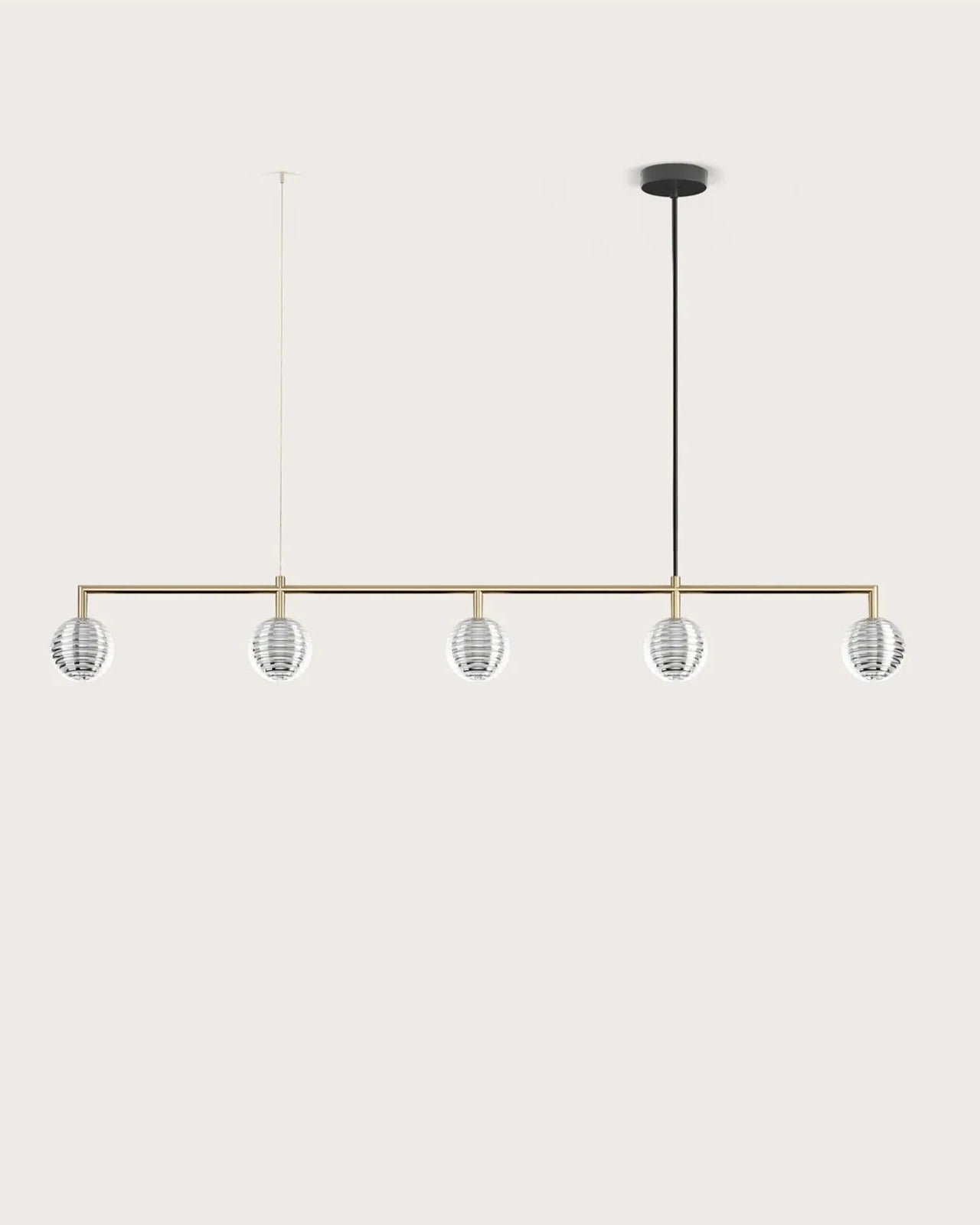 This striking linear pendant will make a statement over a dining table, in a living room or in a kitchen. The soft light is spread from five spherical shades made from ridged transparent glass. Combined with a matte black or matte brass steel linear structure, this pendant will add an elegant and timeless touch to contemporary or modern interiors.