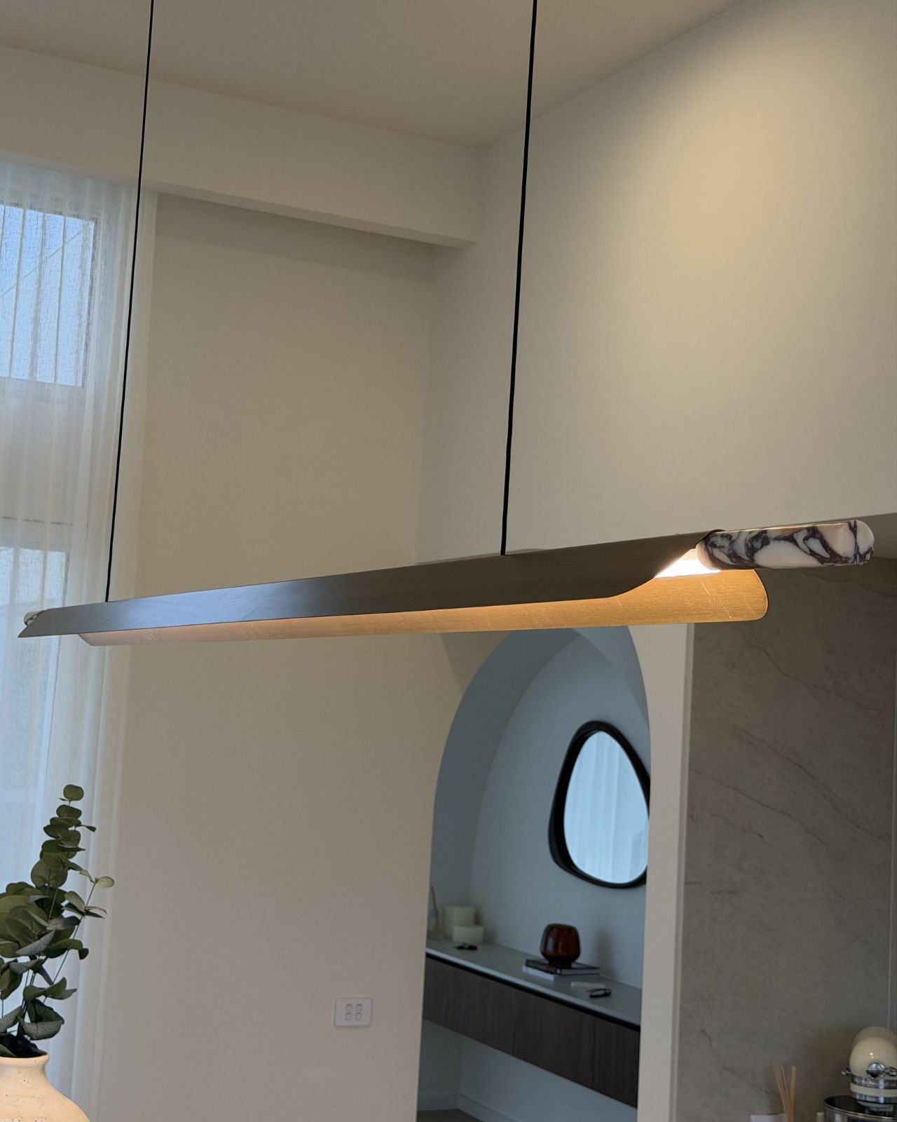 The Formation Luxury Linear Pendant is a modern, sleek light hand-assembled in Melbourne, Australia. Featuring marble or stone tips with a folded metal body that conceals a warm white integrated LED strip. Available in four elegant body finishes, this fitting is ideally places over a bench in the kitchen with matching cabinet handles for a cohesive look. Choose from four marble tip options for a more luxurious lighting option, or two stone options for a more understated linear.