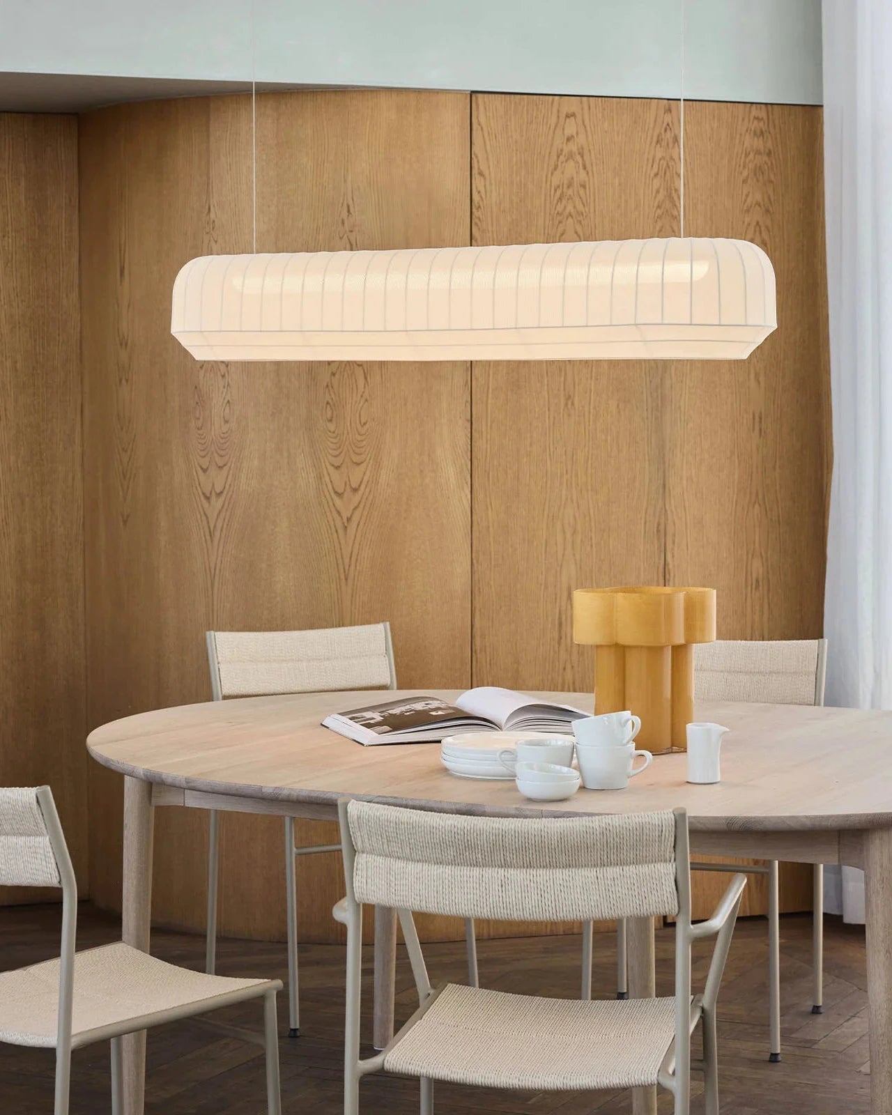 The Knitted Stretched Fabric Linear Pendant draws on Japandi-inspired design, offering a refined balance of texture and form suited to both residential and commercial interiors. Its elongated profile makes it ideal for dining tables, kitchen islands, meeting rooms, and open-plan spaces where gentle, diffused illumination is preferred.