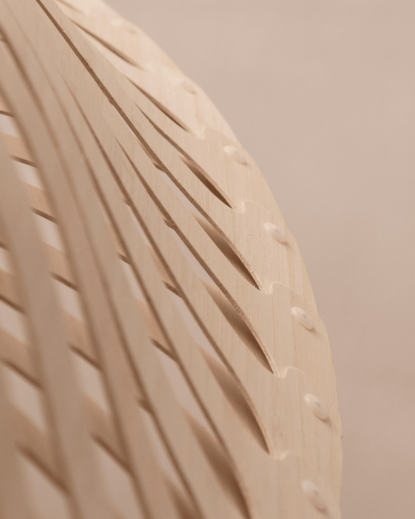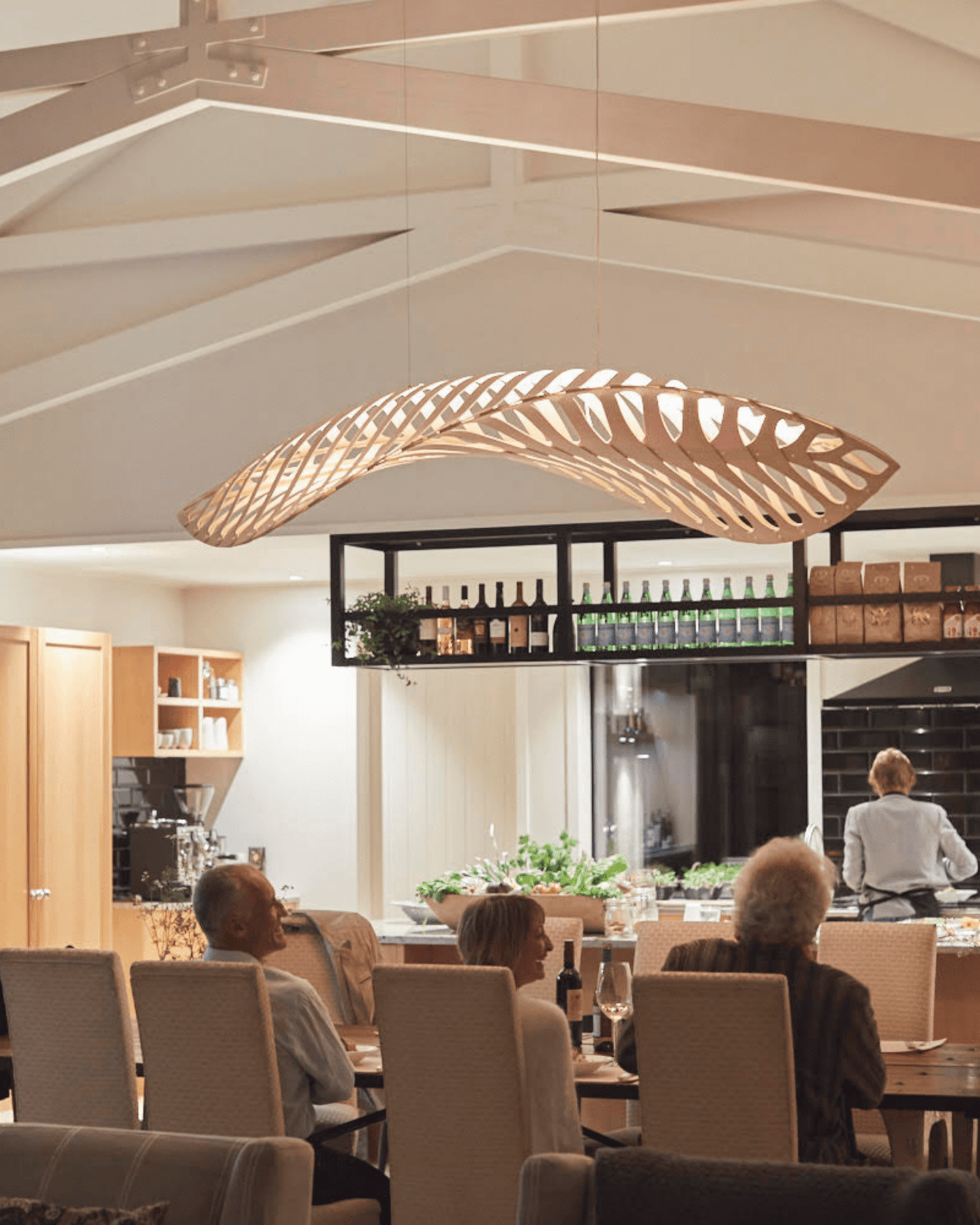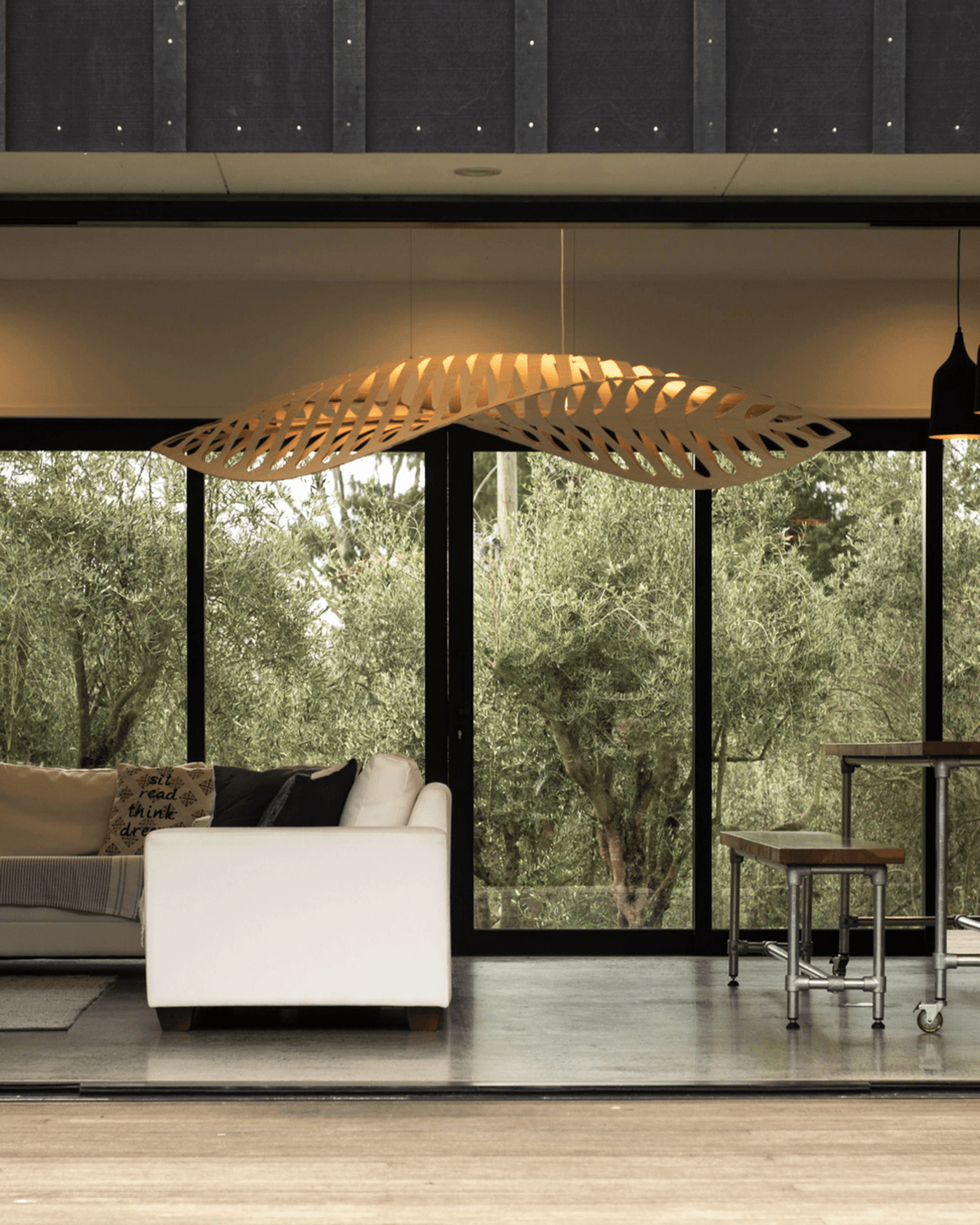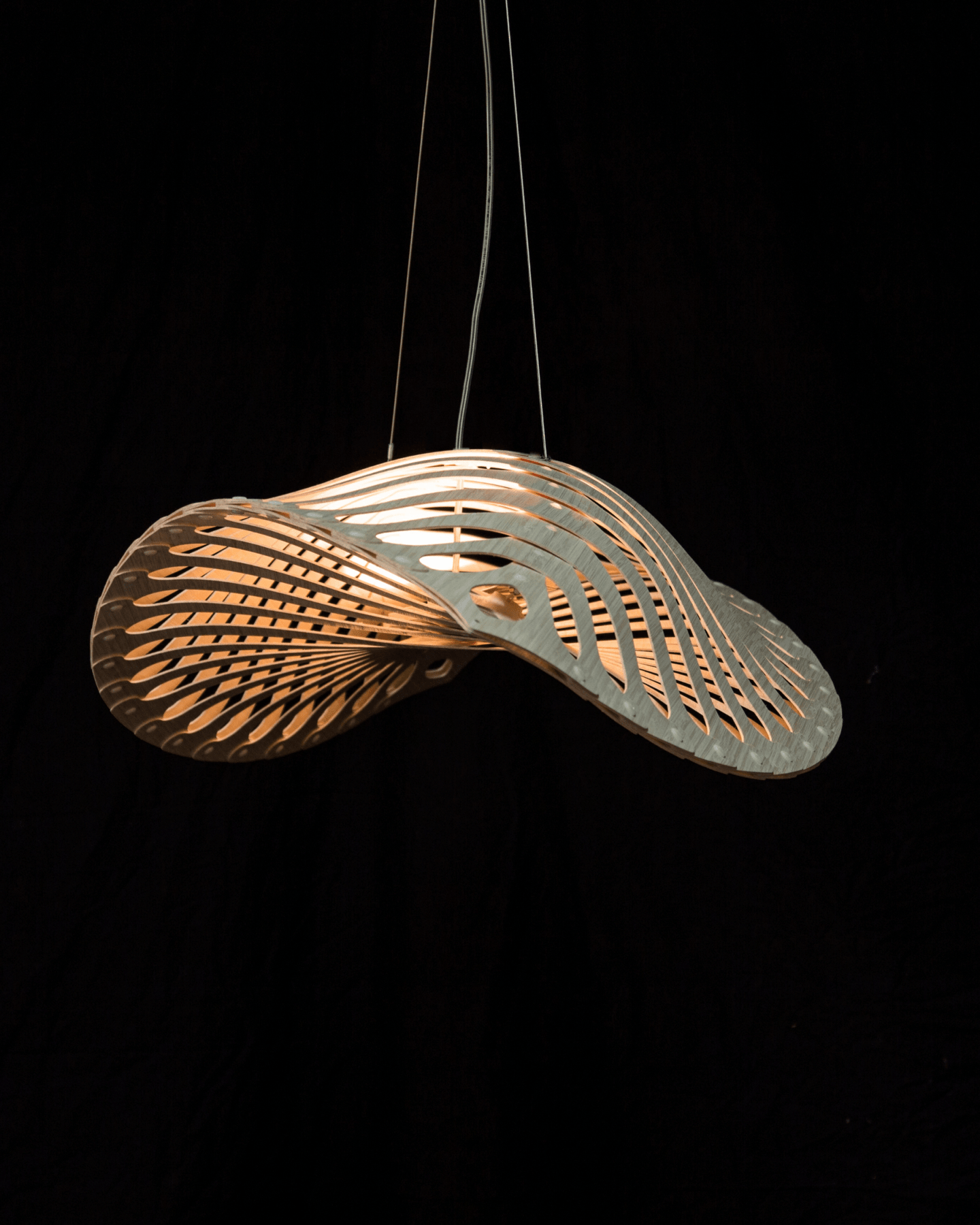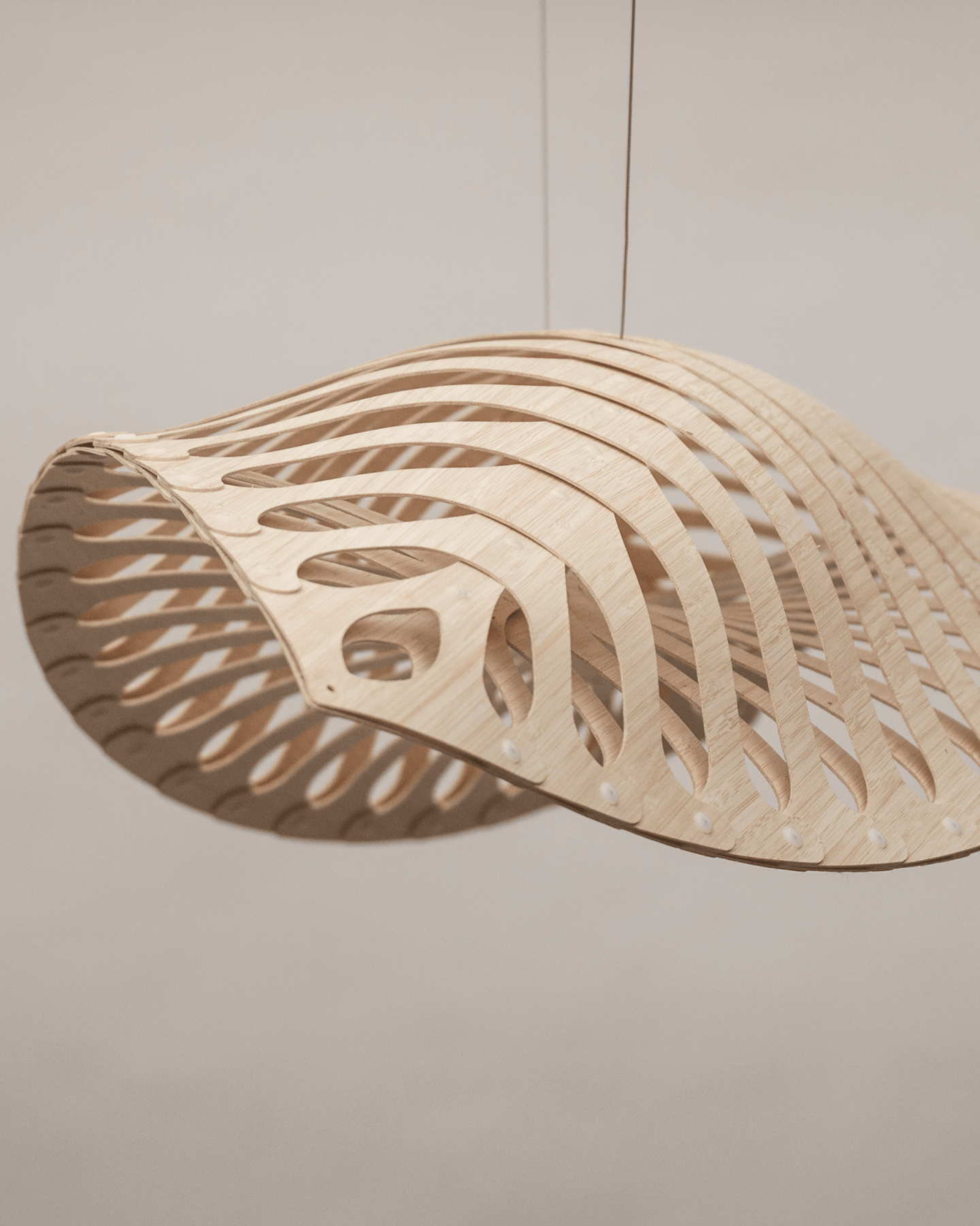 The Navicula Pendant by David Trubridge draws inspiration from nature, specifically the microscopic diatoms that drift through the oceans. Its flowing, segmented design is shipped as a kitset and easily assembled on-site with push-in nylon clips. The thin, curved pieces of CNC-cut bamboo plywood form an elegant, fluid structure that casts captivating patterns of light. Illuminated by a row of LED pin-point lights, it offers both beauty and functionality. Ideal for kitchens, living rooms, and dining areas, this pendant creates an organic, enchanting atmosphere. Available in three sizes.