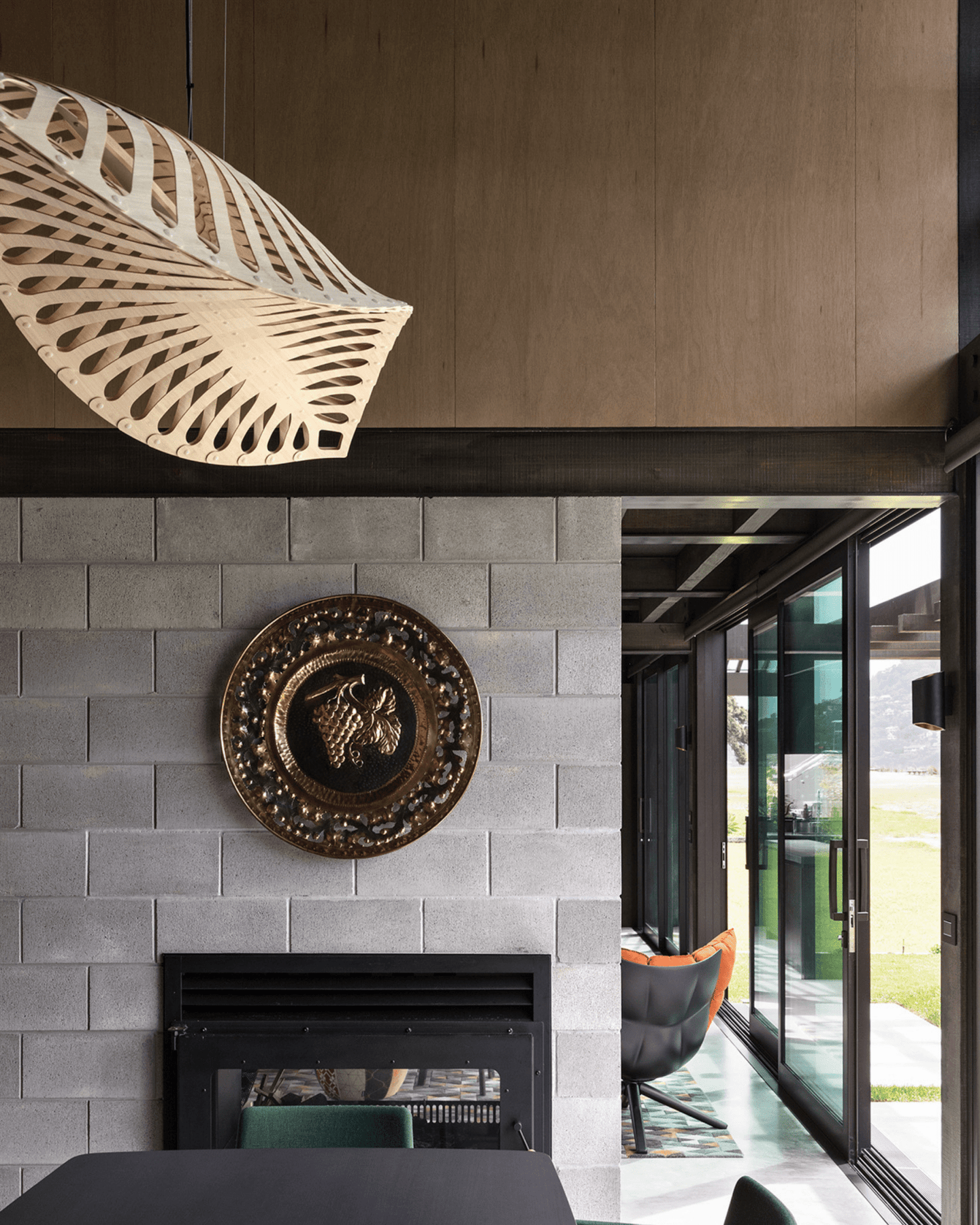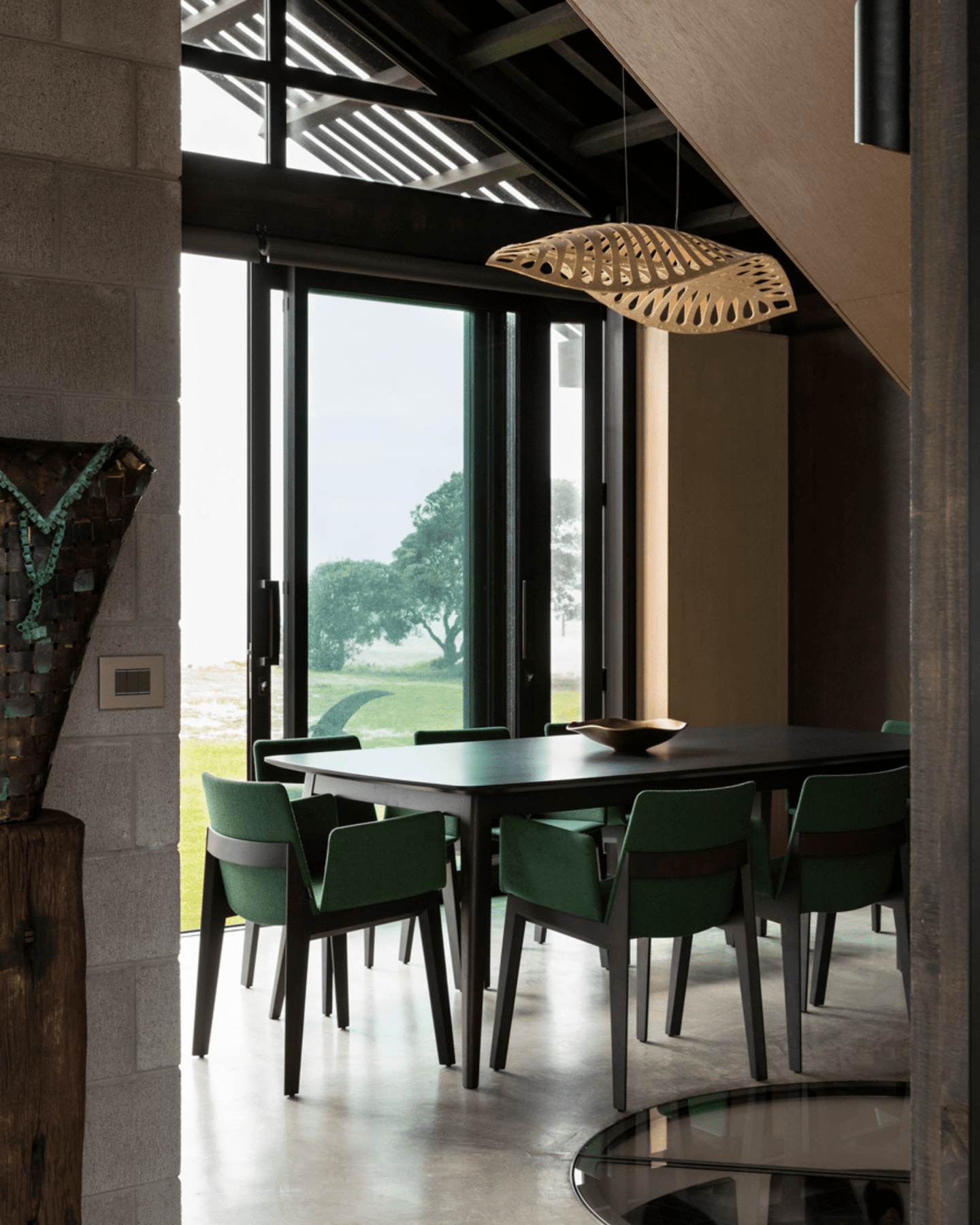 Modern interior with pendant light over a glass table, white vase with red flower, and greenery outside the window.