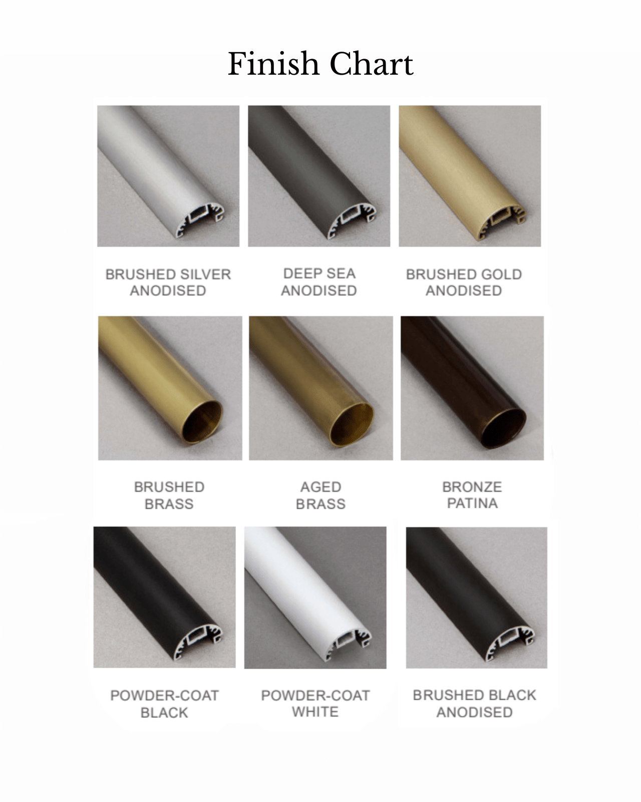 | Finish | Powder-coat White | Anodised Silver | Anodised Satin Gold | Anodised Black | Patina Bronze (additional finishes available on request) |