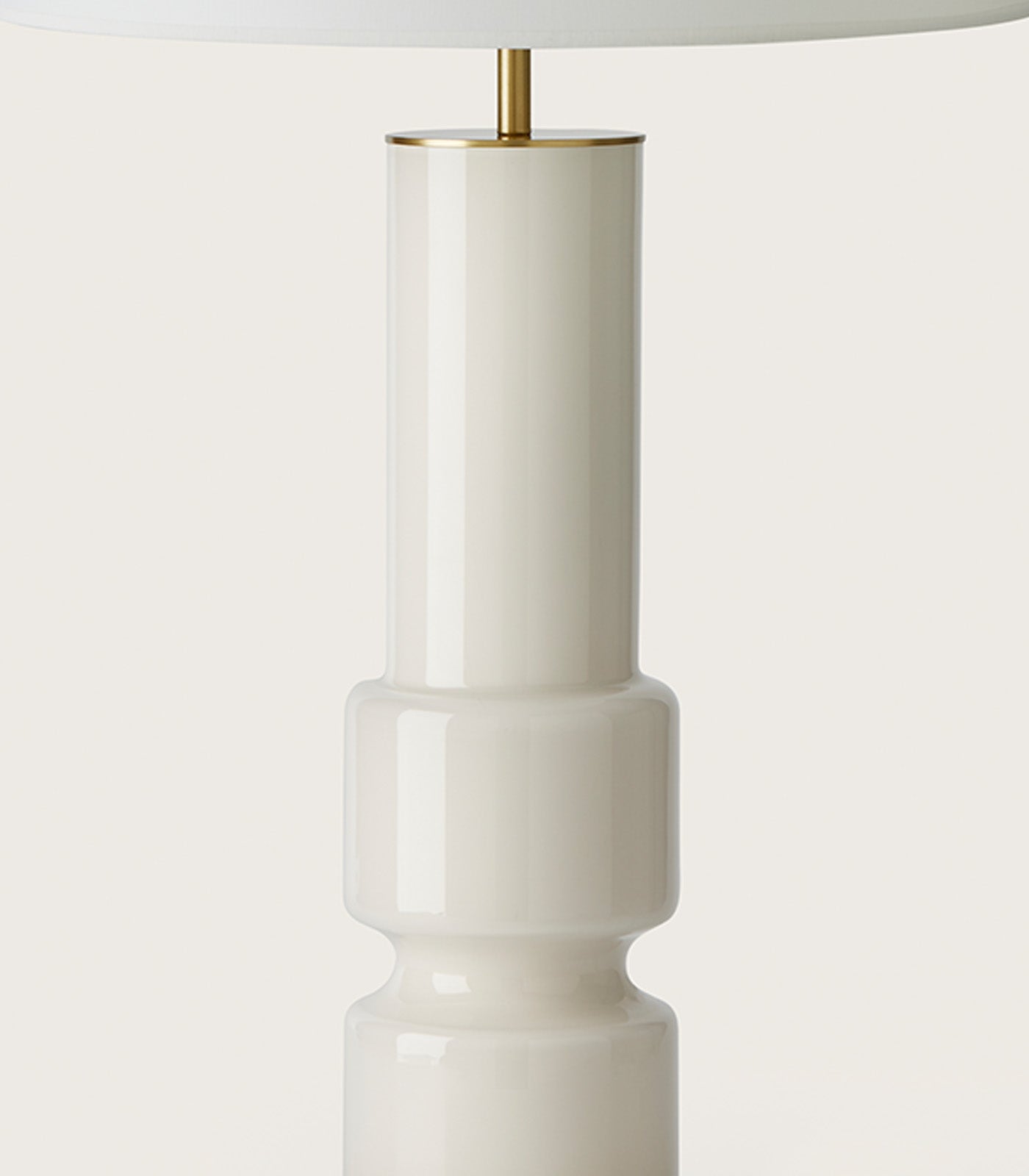 Introducing a captivating table lamp featuring a contemporary style with a cylindrical glass base and rounded shapes at the bottom, complemented by a white fabric shade. Choose from two elegant options: Chrome and Ash Grey or Matt Brass and Taupe. This exquisite piece of design will elevate the aesthetic of your living room or entrance hall. With its minimalist and simple design, it adds a touch of sophistication and luxury to your home decor.