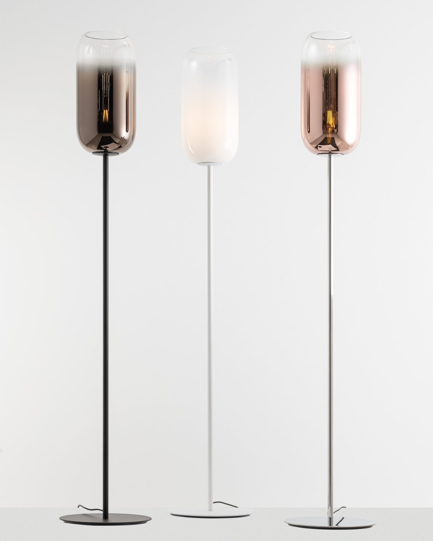 The Glass Oblong Floor Lamp is designed to highlight the natural beauty of handcrafted blown glass. The blue, copper, bronze, and silver versions are crafted using an innovative, environmentally responsible PVD (Physical Vapour Deposition) process. This advanced metal vacuum-deposition technique delivers vibrant, durable finishes while eliminating harmful emissions. In the white version, each diffuser is created using an age-old Venetian technique that fuses white glass with crystal during the blowing process, resulting in unique, one-of-a-kind pieces rich in artisanal character. The result is a fitting that beautifully blends tradition, innovation, and sustainable craftsmanship.