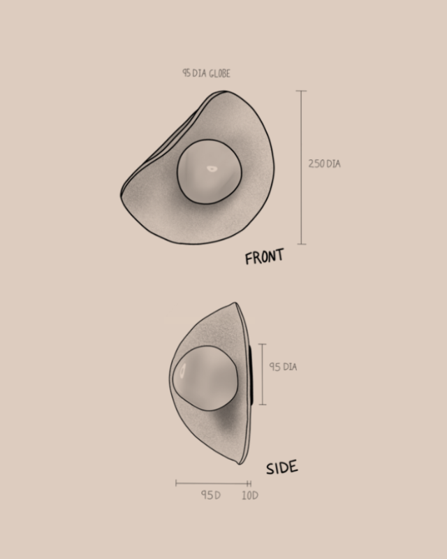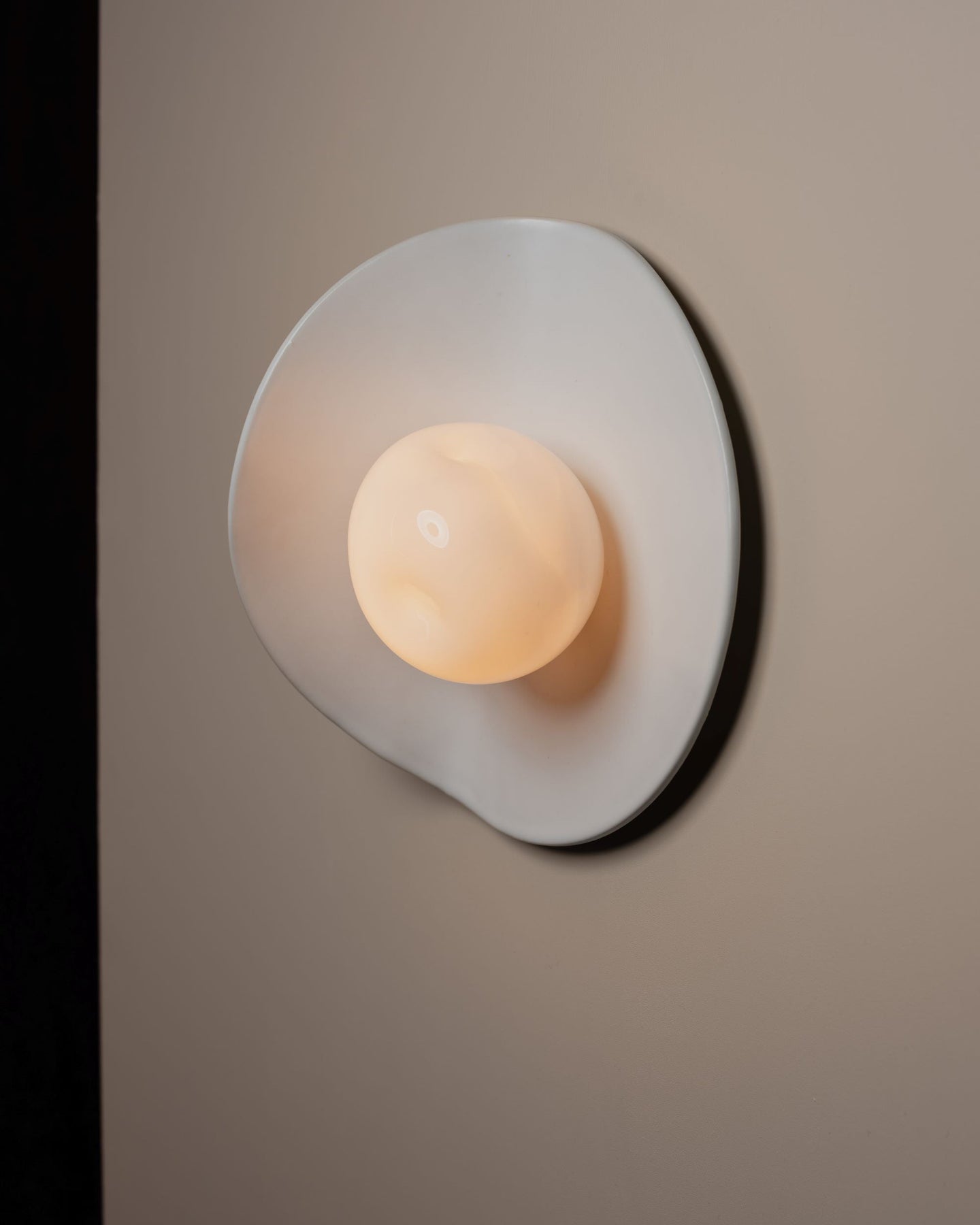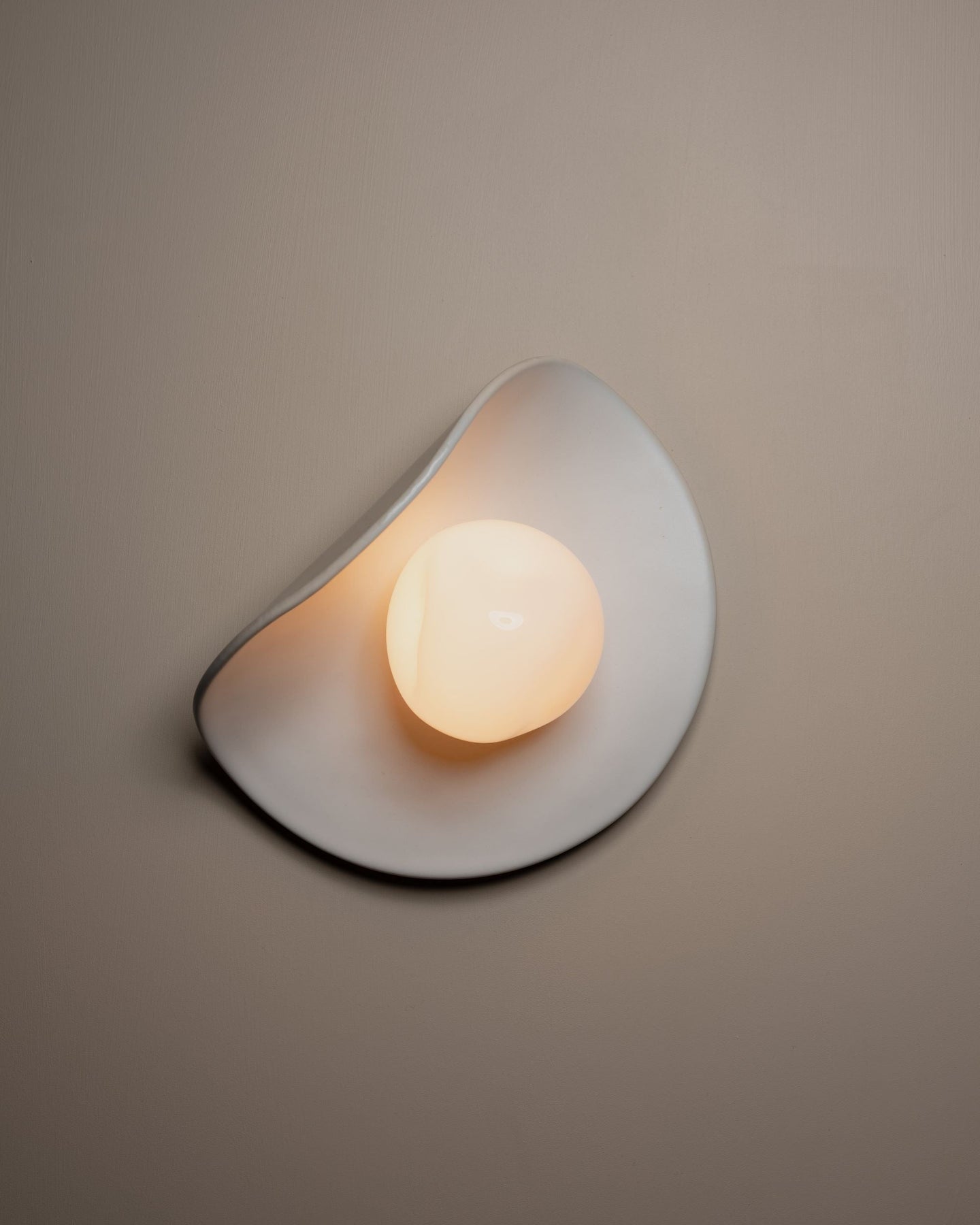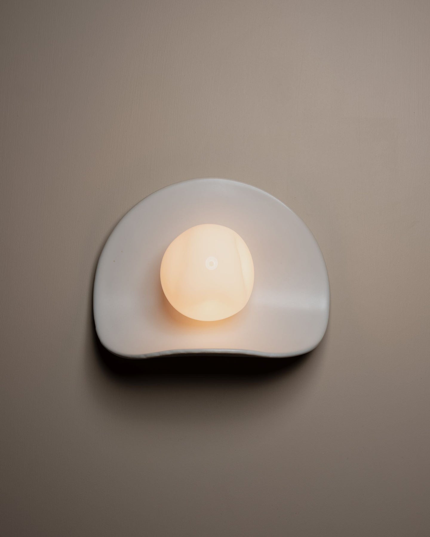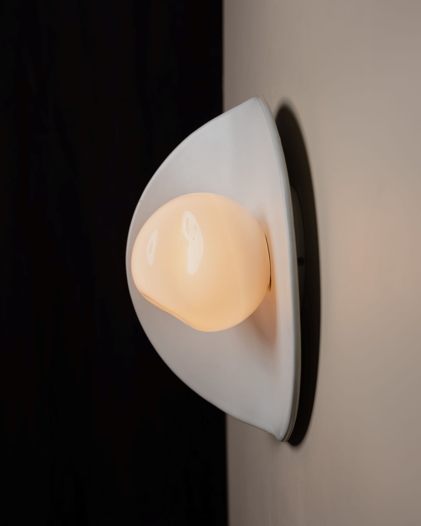 The Pond wall light showcases a single upturned edge, providing an asymmetrical design that allows for customizable angles. This unique feature results in the light being reflected in various locations along the wall. With a hand-blown bulb made to resemble pearls, each dome is intricately shaped. While the light is designed in Hobart, the ceramics are crafted in Cygnet, and the glass is blown in Poatina, ensuring this design represents the true craftsmanship of Tasmania. Both components are mounted on a custom white powder-coated backplate that is essentially hidden.