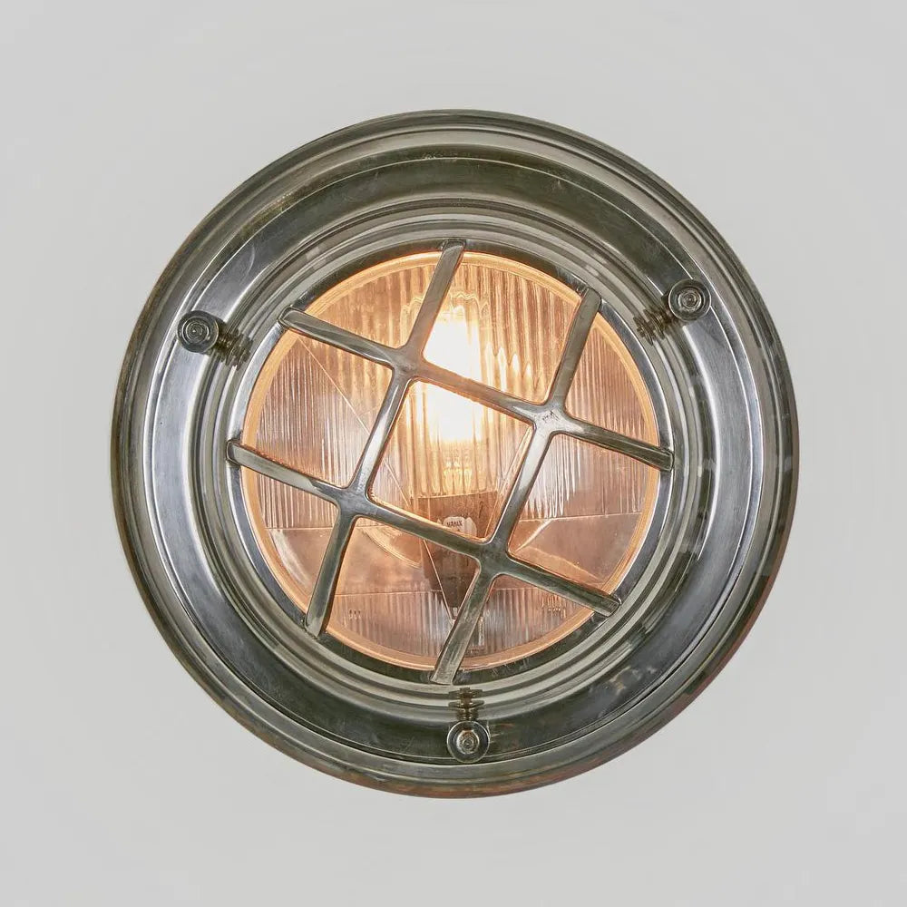 Designed to replicate the lights that were found on Royal Navy vessels, this IP54-rated flush-mount bunker light will add nautical charm into outdoor or indoor spaces. Featuring a circular brass structure with a caged design available in a brass or silver finish and an opal plexiglass cover with hand-blown clear rib glass. This design will warmly illuminate porches, patios, hallways or bathrooms.