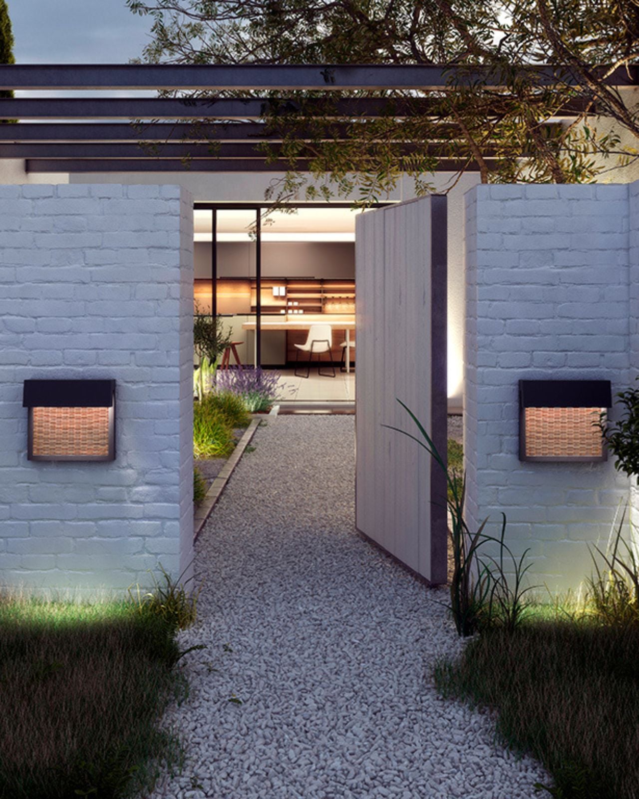 Originating in Barcelona, the Hand Woven Organic Exterior Wall Light features a downlight design crafted from recyclable synthetic fibres, aluminium and stainless steel, ideal for outdoor application and has an IP66 rating.  Style this piece in Mediterranean-inspired seating areas, exterior entryways or kitchens to add dimension to your spaces. Available in a graphite brown frame with a light beige finished woven front.
